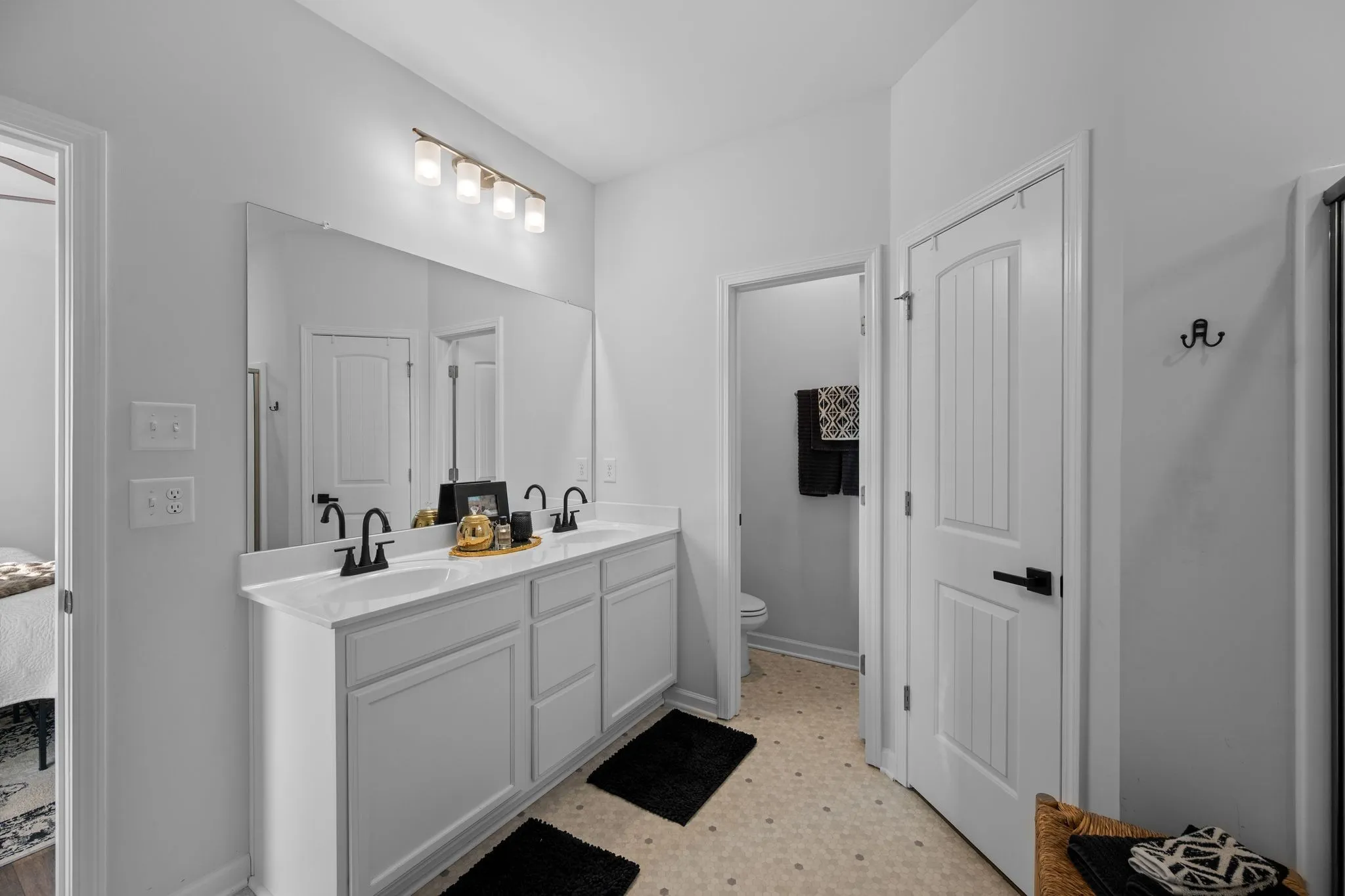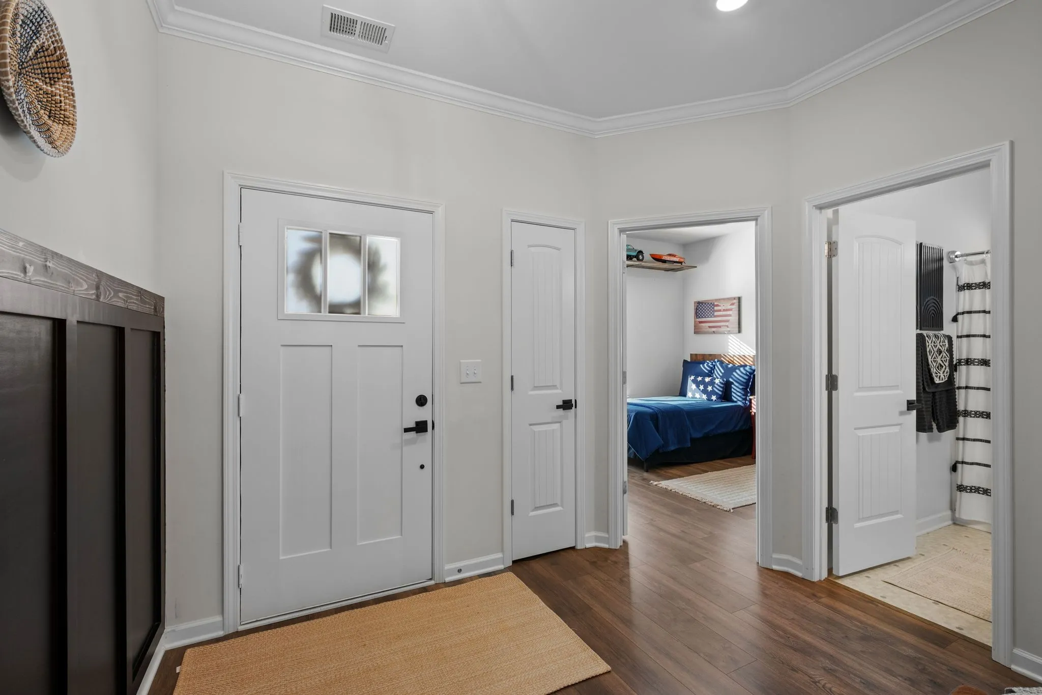 Beautiful modern farmhouse living all on one level! This 4-bedroom home showcases an open floor plan with soaring ceilings, custom trim details throughout, and luxury vinyl plank flooring—no carpet anywhere. The inviting entry features elegant wainscoting, setting the tone for the thoughtful craftsmanship found throughout the home.