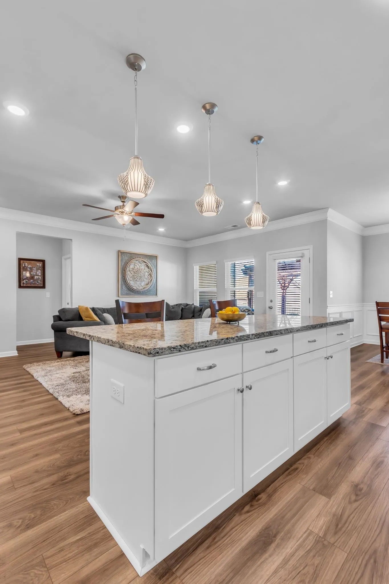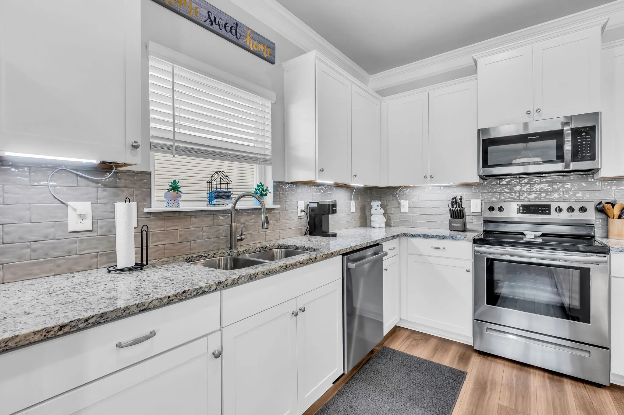 The kitchen is a standout with marble countertops, an upgraded backsplash, and ample cabinet space, flowing seamlessly into the main living area. The spacious primary suite features a large walk-in closet and a private bath retreat.