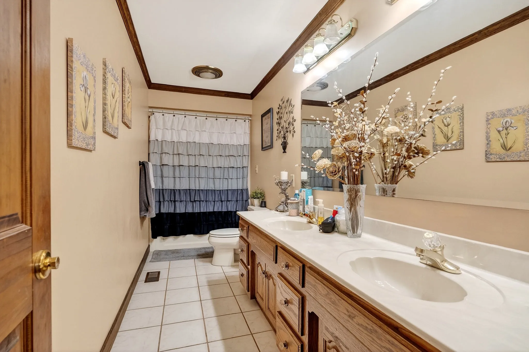 The upper level includes two bedrooms and two full bathrooms, offering additional private living space that works well for guests, family members, or flexible use.