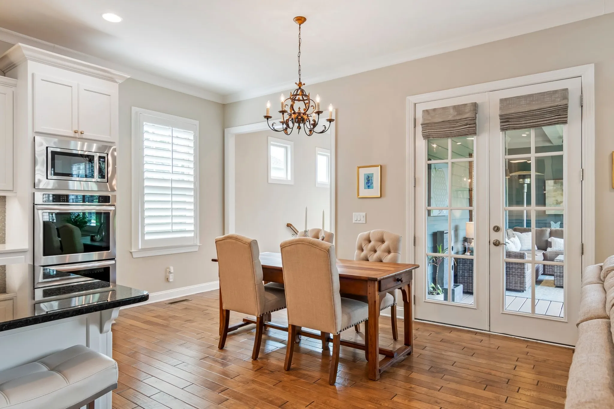 A quaint covered front porch welcomes you inside, where open-concept living unfolds effortlessly. The inviting living room features a gas fireplace with custom built-in shelving and flows seamlessly into the kitchen and breakfast nook—ideal for both everyday living and entertaining. The kitchen is thoughtfully appointed with a large island, gas cooktop, built-in double ovens, stainless steel appliances, and a beverage center located in the dry bar off the formal dining room.