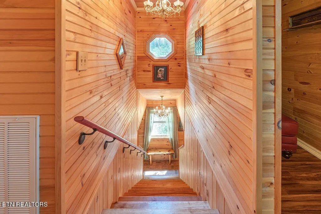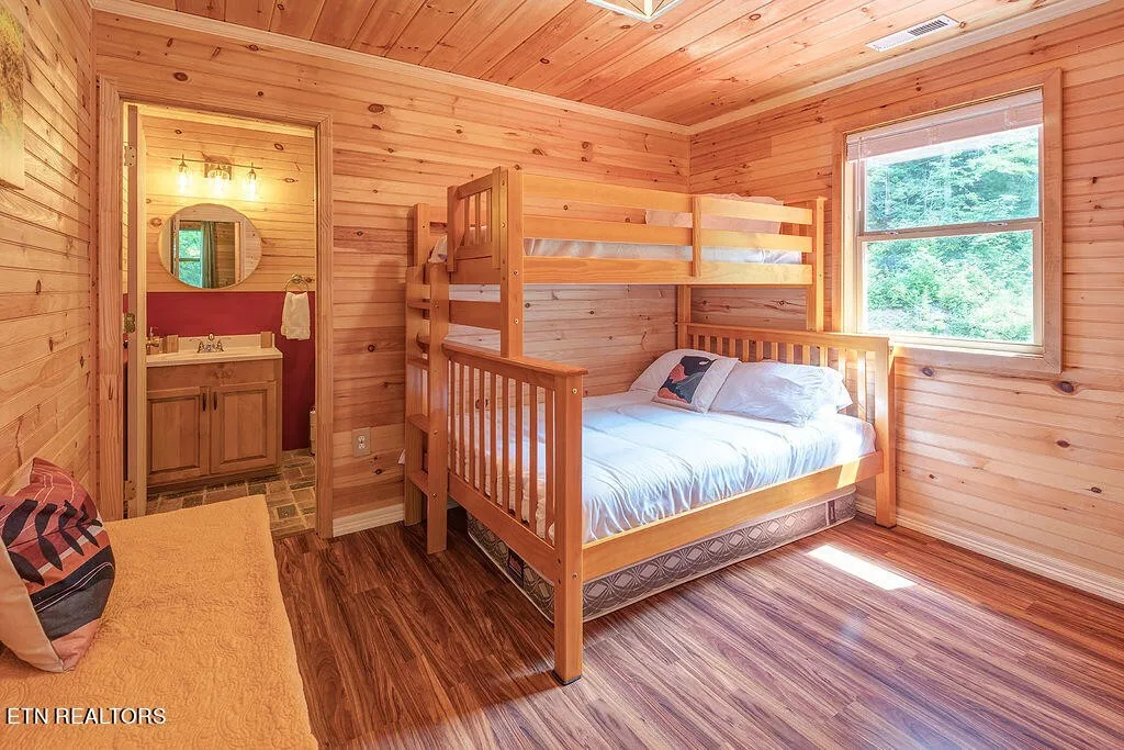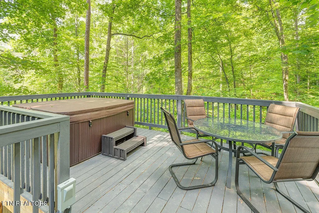 3 BEDROOM, 4 1/2 BATH, 2000sqft Cabin. With each bedroom having its own private full bathroom. On a total of 4.99 very private, wooded acres that connects to the Smokey Mountain National Park bounty line. You will enjoy the outdoor lounge spaces. The top floor has its own deck facing the back, large side deck that has a 7-person hot tub on it. And of course, the front covered porch. The Basement is finished and is currently being used as a game room with bunk beds (which will not convey) Seller redid the floors in the basement and replaced the water heater with a brand-new system. There is a 2-level a/c and heating system. Also, all blinds are new too, as well as all main lighting with added fans. They have added a gate under the porch and another spigot for the hot tub under the porch. Added outdoor lighting and landscaping. This cabin even is equipped with fiber high speed internet. The kitchen is equipped with all appliances. The flooring is brick and laminate though-out. Walls are tongue and grooved. This can be your oasis in the smokies or keep on the rental program. This property also boasts an idyllic ridgeline, On the (1.65 acre) the building site that butts right up to the Smoky National Park! Perched up high, you have 360-degree views of the mountains in the winter with a clear view of the stars at night. Not only does this acreage have a gravel lined entrance and leveled building site, but it also comes with its own one-bedroom septic. It is primed and ready for that perfect additional rental cabin or a new family home. Newport and I-40 are only 15mins for all your shopping, eating out, medical etc., 10 minutes to local orchards and restaurants, 15 minutes to whitewater rafting, 30 minutes to Gatlinburg, 40 minutes to Dollywood and Pigeon
