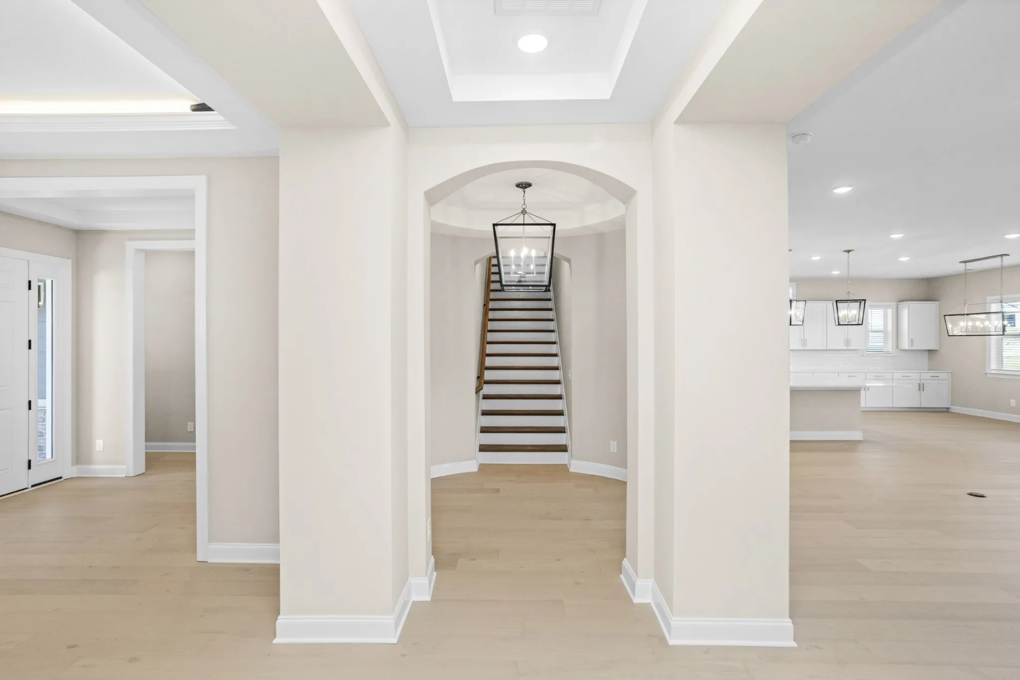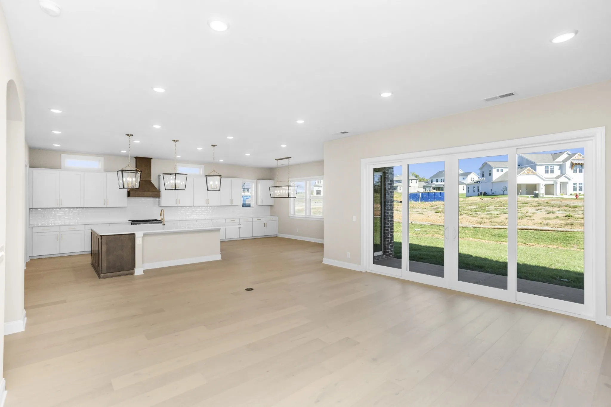 At the heart of the home, the gourmet kitchen—with oversized island, Monogram stainless appliances, and abundant storage—sets the stage for holiday entertaining. The living area extends to a covered porch through dramatic slide-away glass doors, creating seamless indoor-outdoor celebrations.