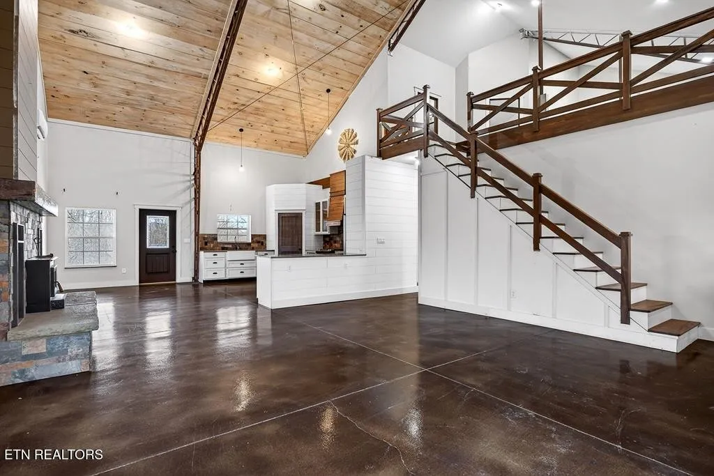 Discover your dream retreat on 27.4 unrestricted acres in the heart of Pickett County! This custom-built 2022 barndominium blends modern comfort with country charm, featuring steel construction with wind bracing & high-speed fiber optic internet. Inside you’ll find nearly 2,600 sqft of living space with soaring ceilings, a main-level primary suite, and additional loft living complete with kitchenette. Equestrian enthusiasts will love the horse barn with feed and tack room, 2.5 fenced acres next to the barn, a fully fenced property perimeter, multiple spring-fed creeks that run through the property – including your very own waterfall!! A detached workshop with electrical and plumbing offers space for all the hobbies. Whether you’re looking for a full-time residence, vacation home, or working farm, this unrestricted property checks every box: scenic mountain views, water frontage, space for the animals and a versatile layout designed for both relaxation and productivity!! Buyer to verify ALL information!