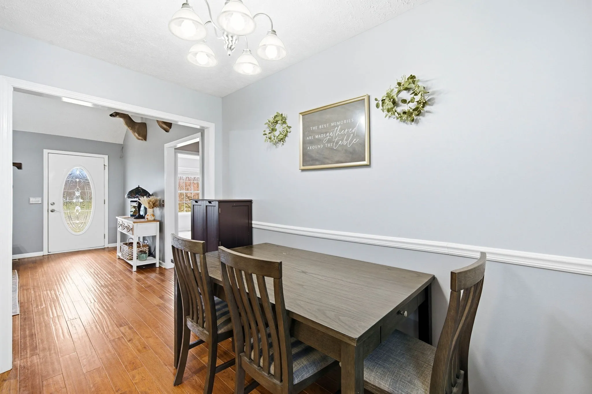 Inside, you’ll find hardwood floors in the living room, kitchen, and dining area, along with stainless steel appliances that complete the kitchen. The large primary suite boasts tray ceilings, a walk-in closet, and a private bath with double vanity sinks.