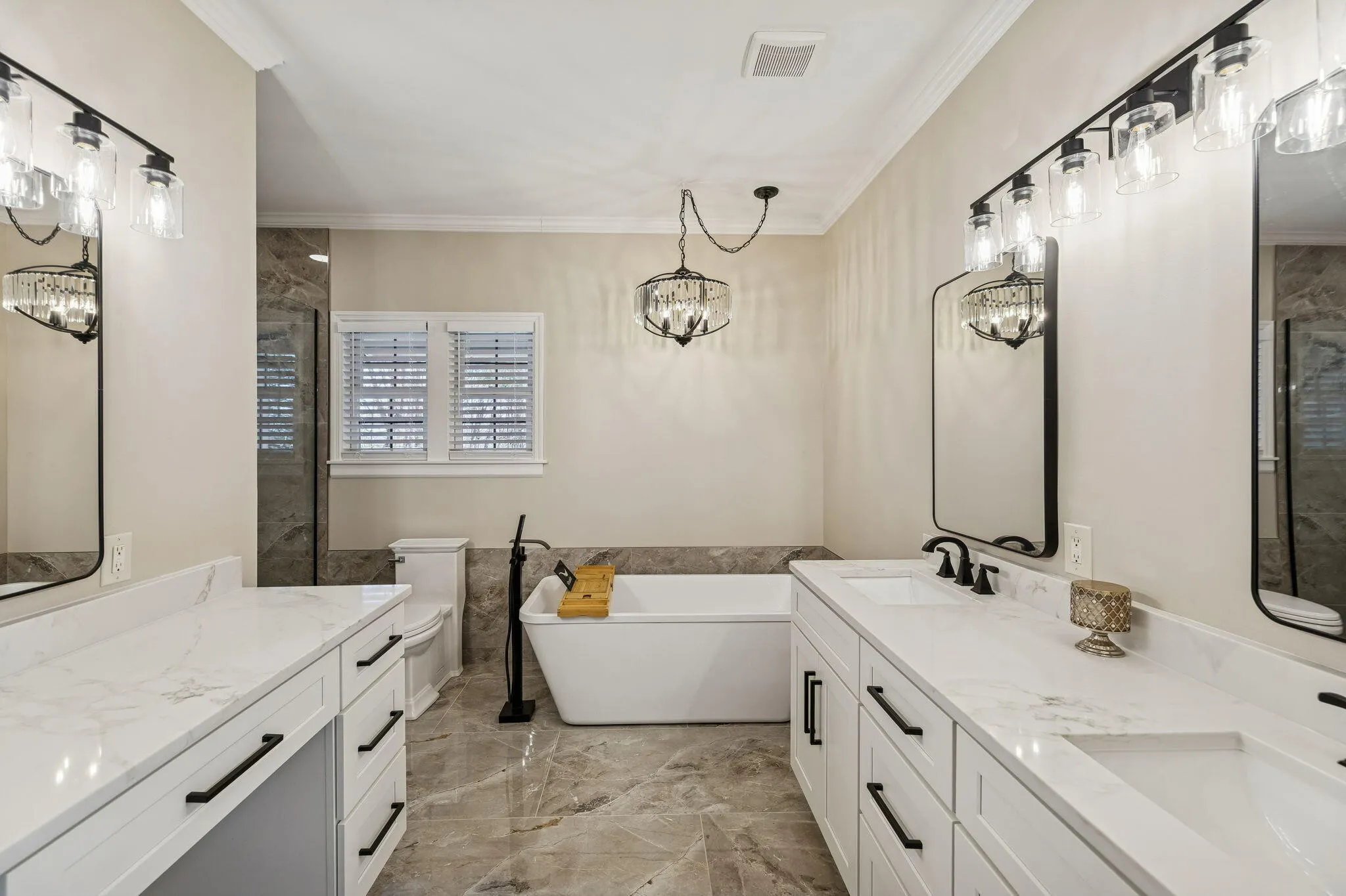 The main-level primary suite is a peaceful retreat, offering a spacious walk-in closet and a spa-like ensuite with a soaking tub, oversized custom walk-in shower, and dual vanities. Upstairs, you’ll find three generously oversized bedrooms, bonus area, and a beautifully updated full bathroom—perfect for family living or guest accommodations.