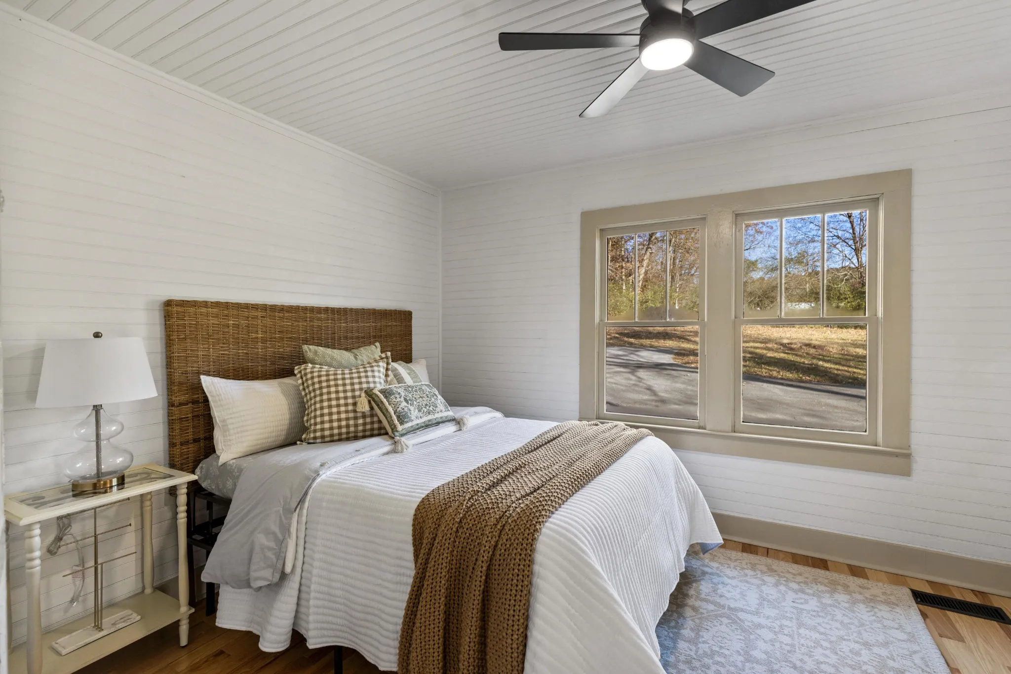 Step inside to find stunning hardwood floors, beadboard walls and ceilings, and a cozy den that immediately makes you feel at home. The kitchen is warm and inviting, featuring brand-new appliances, custom cabinetry, gorgeous butcher-block countertops, and a farmhouse sink. Every detail has been carefully refreshed, including all new lighting and ceiling fans throughout the home.