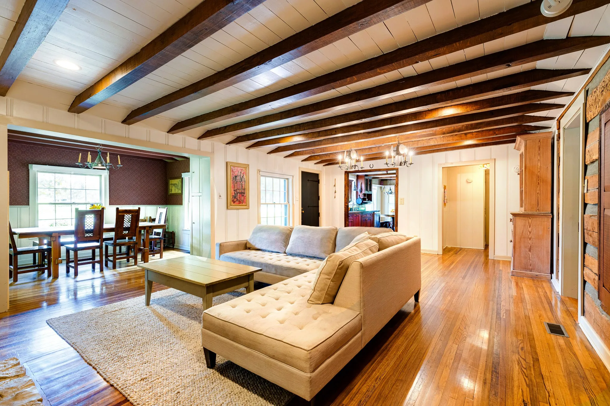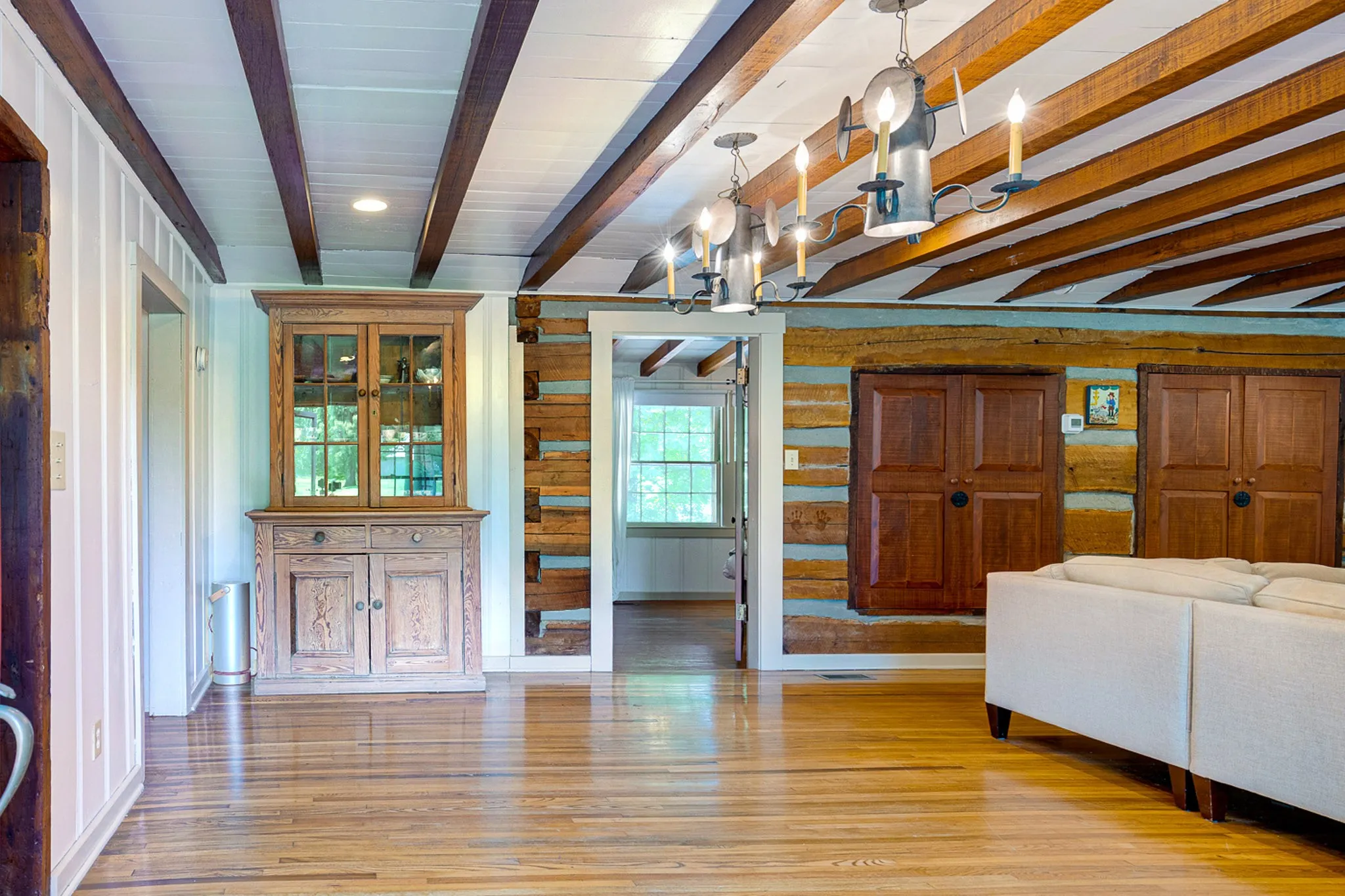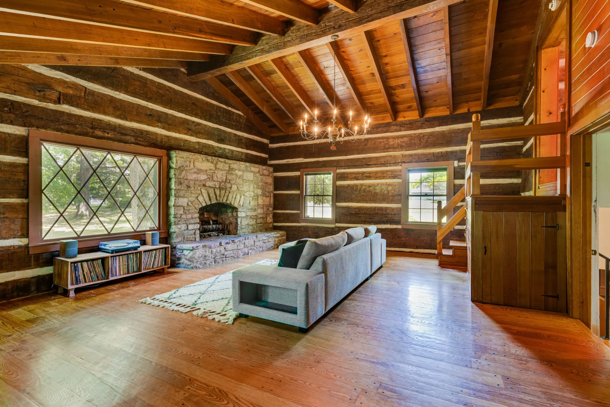 A rare private lodge residence showcasing authentic historic materials and craftsmanship, featuring three custom stone fireplaces built from rock sourced from the State Capitol grounds, reclaimed beams from the Nelson Distillery, massive hand-hewn logs, brick flooring, and wood milled from the original land. The flexible floor plan offers three distinct living areas ideal for guest quarters, or a true in-law suite with private entrance, while the restored kitchen blends period-inspired furniture cabinetry. 12″ redwood floors, and custom built-ins for timeless character with everyday function.