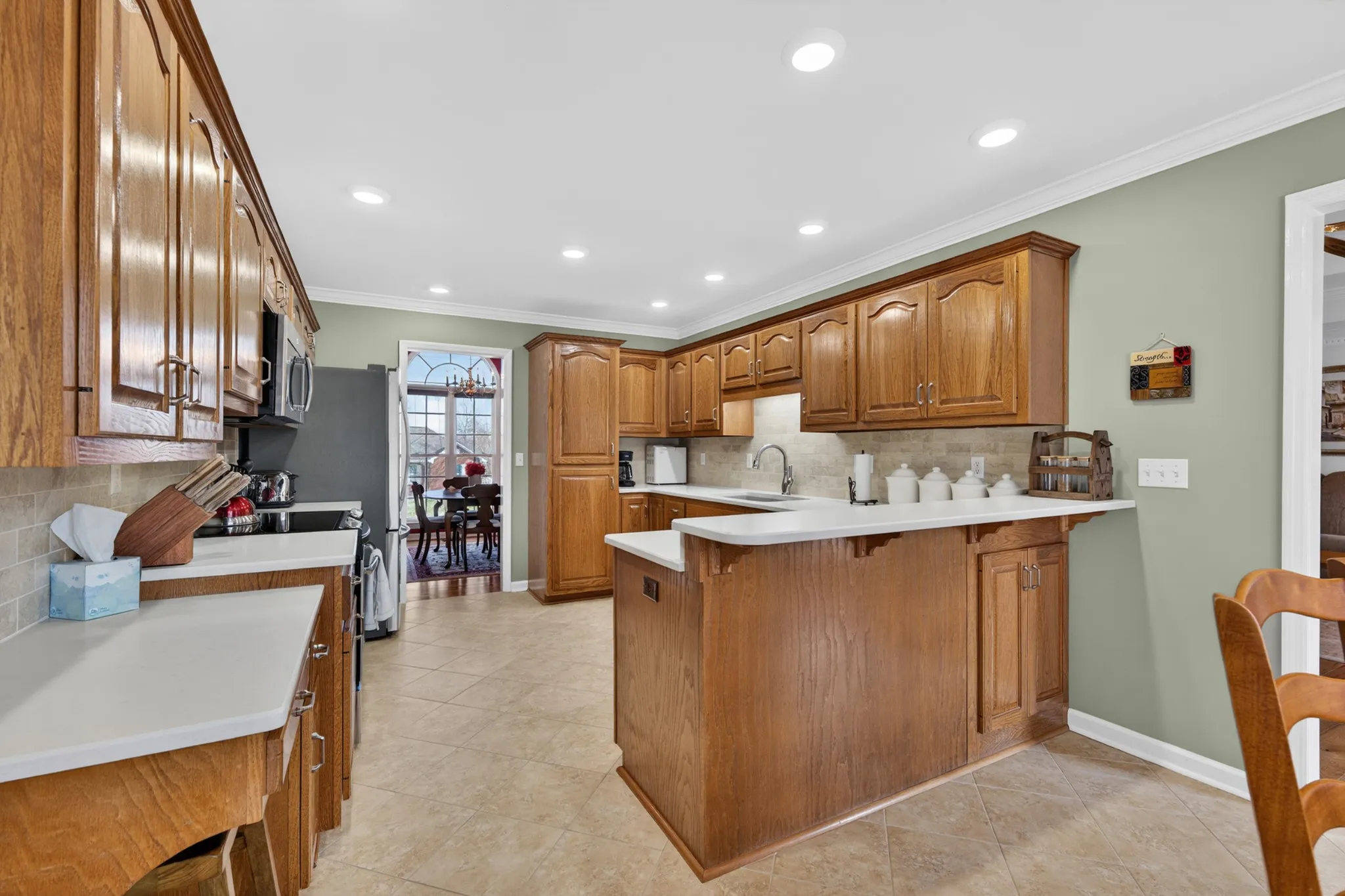 Full brick 3-bedroom, 2 full bath home offering a functional and family-friendly layout. Wood flooring runs throughout the main living areas with tile in the wet areas. The renovated kitchen features quartz countertops, a timeless backsplash, and stainless steel appliances. Both bathrooms have been updated with quartz countertops and fresh tile flooring, including a tile surround in the secondary bath and a large walk-in tile shower in the primary bathroom. The isolated primary bedroom includes a spacious walk-in closet. Additional storage closets throughout the home provide excellent organization and make this an ideal family home. The attached garage includes a storm shelter and a floored storage area above with a new aluminum ladder access. The fenced backyard offers a patio and a 4-foot black aluminum fence. Completing the property is a detached garage with two oversized bays and a finished bonus space above, featuring a half bath, kitchenette, and pool table that remains—perfect for a home office, teen hangout, or man-cave for watching football! POINT BROADBAND FIBER INTERNET! Located in the South Lincoln School District.