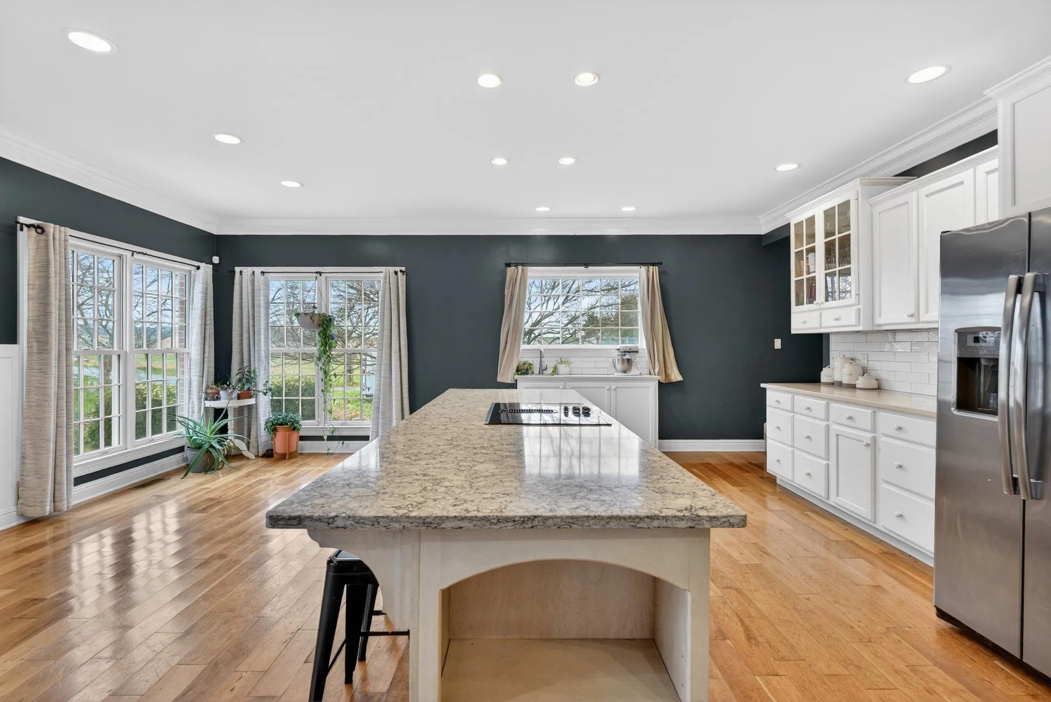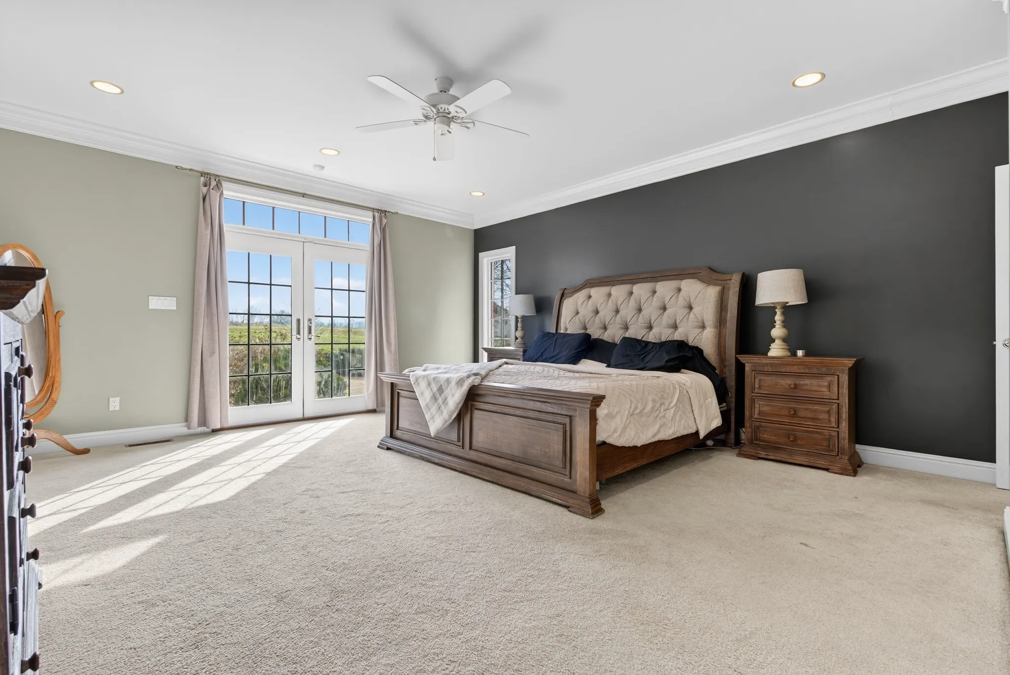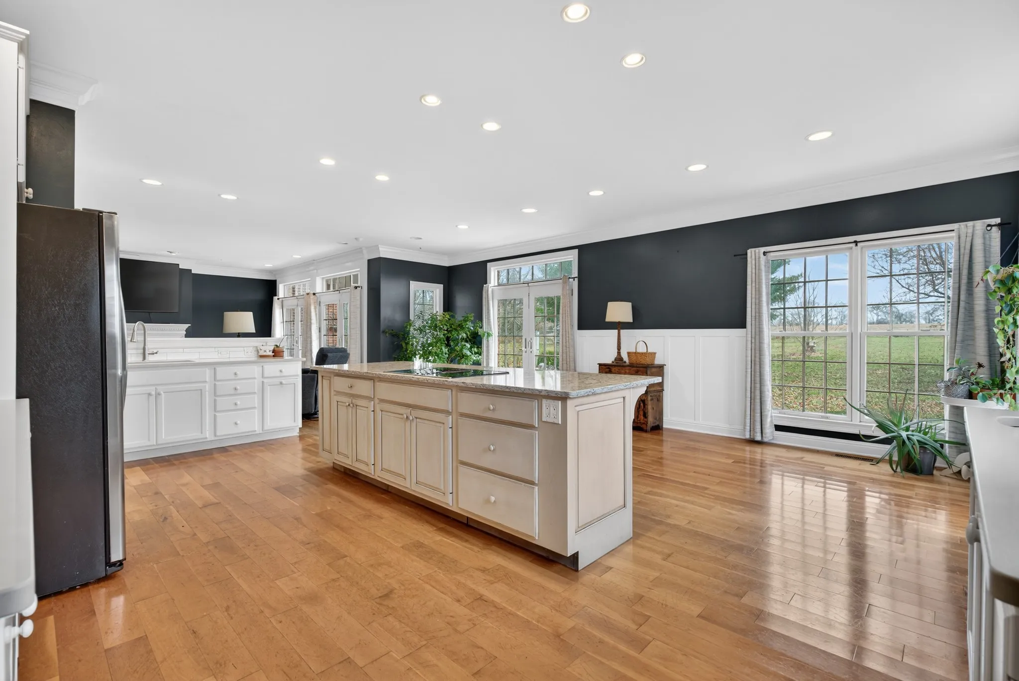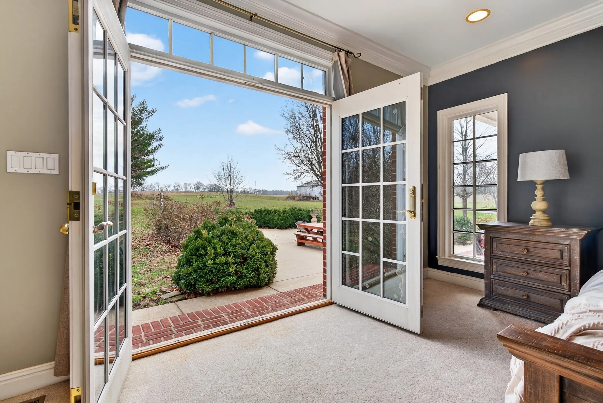 The main level features two primary suites and an open-concept living, kitchen, and dining area filled with natural light from oversized windows and scenic views of the surrounding countryside. Upstairs offers abundant walk-in attic storage, perfect for organization or future expansion.