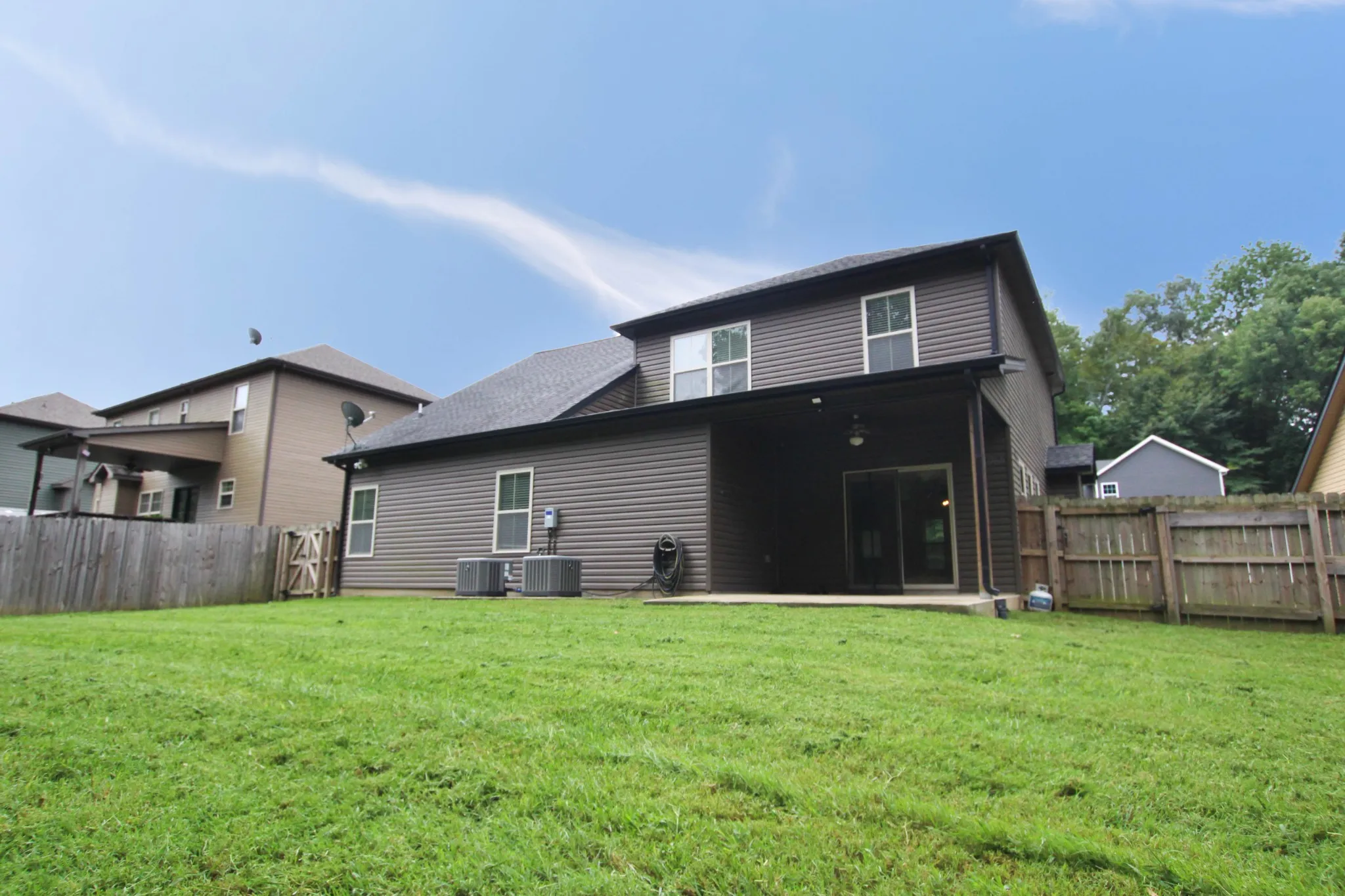 Like new four bedroom home, conveniently located just minutes from restaurants, shopping and more! Great open floor plan, beautiful laminate flooring, stacked stone fireplace, coffered ceilings, large eat in kitchen with stainless steel appliances & granite counters! First floor features powder room, drop station and laundry room with washer & dryer included! Spacious primary suite has full bath and all guest rooms are generously sized! Outdoor space features covered patio and fenced yard on tree lined lot! Pet rent applicable.