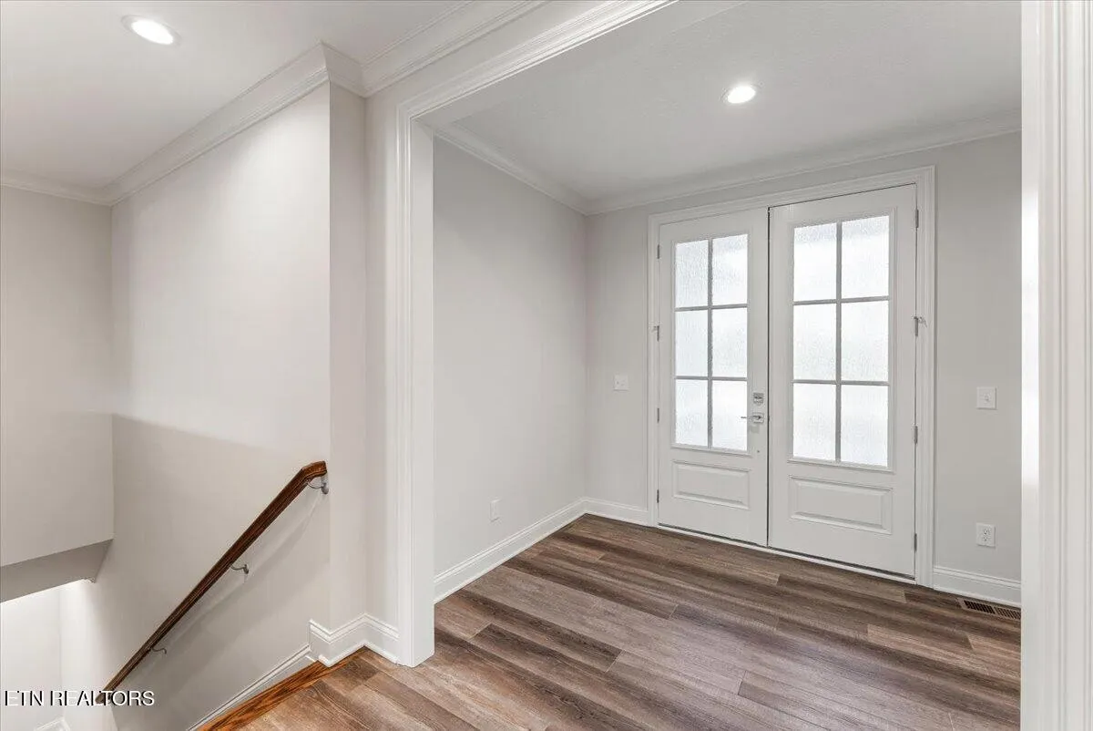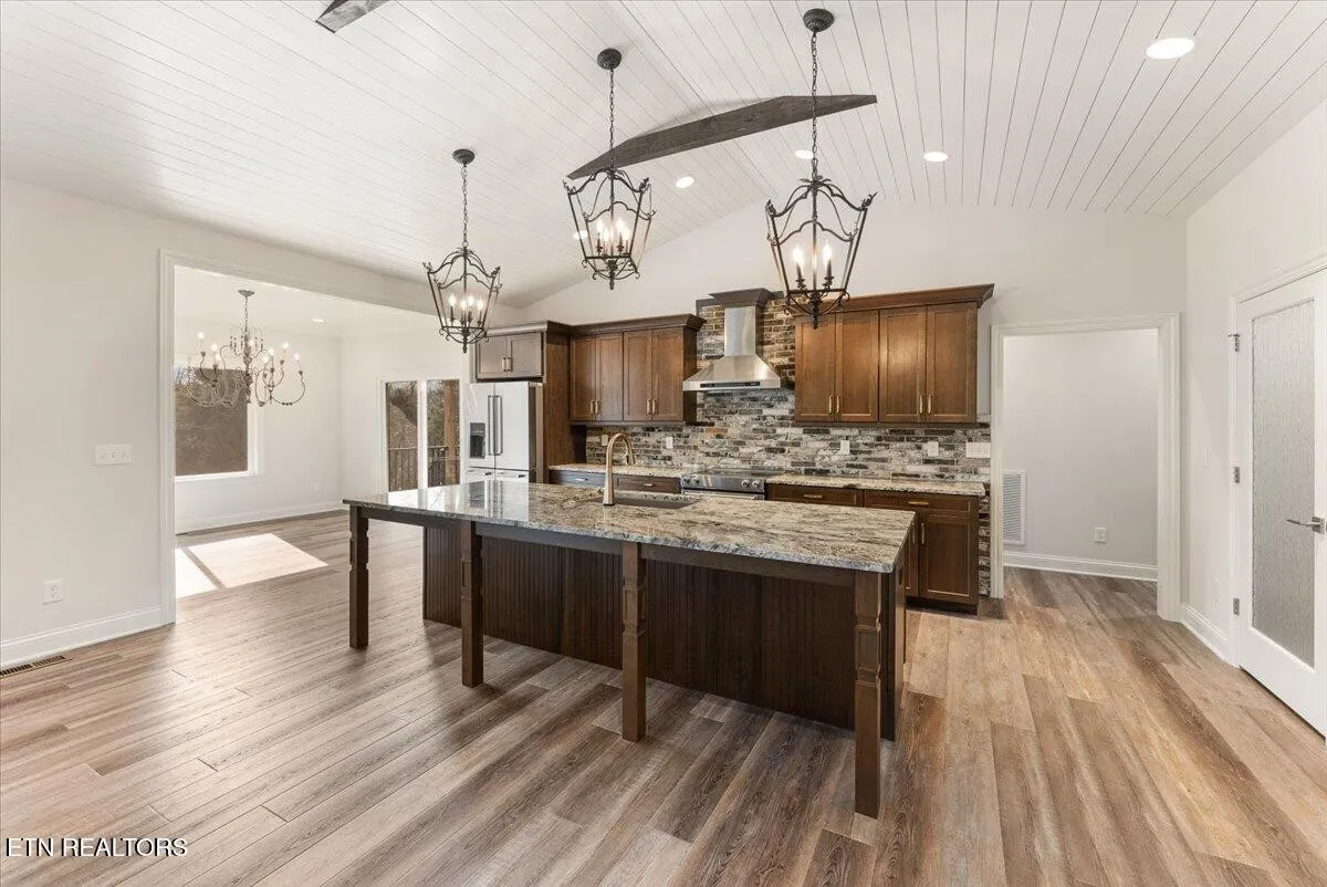 Uniquely designed with a one-of-a-kind floor plan, the home welcomes you through a dramatic foyer featuring double 8′ glass doors, intentionally separating the entry from the expansive vaulted great room and kitchen beyond. Inside, you’re immediately drawn into a stunning open-concept great room and kitchen highlighted by vaulted shiplap ceilings, abundant natural light, and elevated finishes throughout.