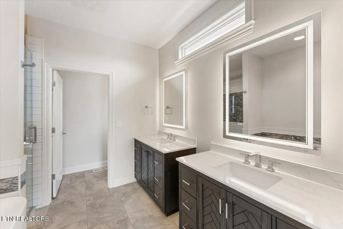 The thoughtfully planned main level includes two large guest bedrooms with oversized closets, privately positioned away from the primary suite. The luxury primary retreat features two walk-in closets and a spa-inspired bath with a custom tiled walk-in shower with glass door, dual free-standing vanities with granite countertops and lighted mirrors, a dramatic vessel soaking tub, and a private water closet. The home features custom tiled walk-in showers with glass doors and upgraded flooring in all bathrooms.