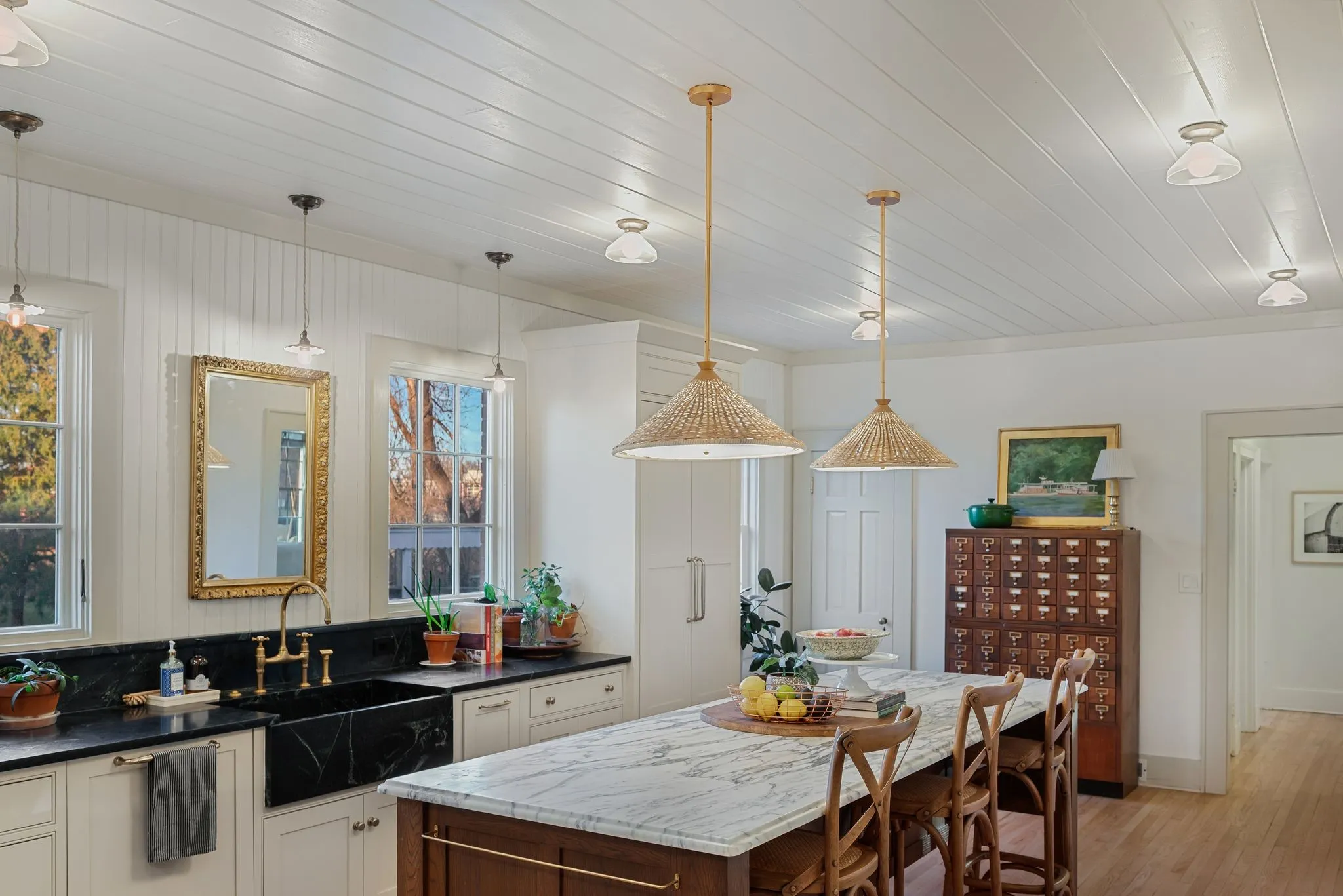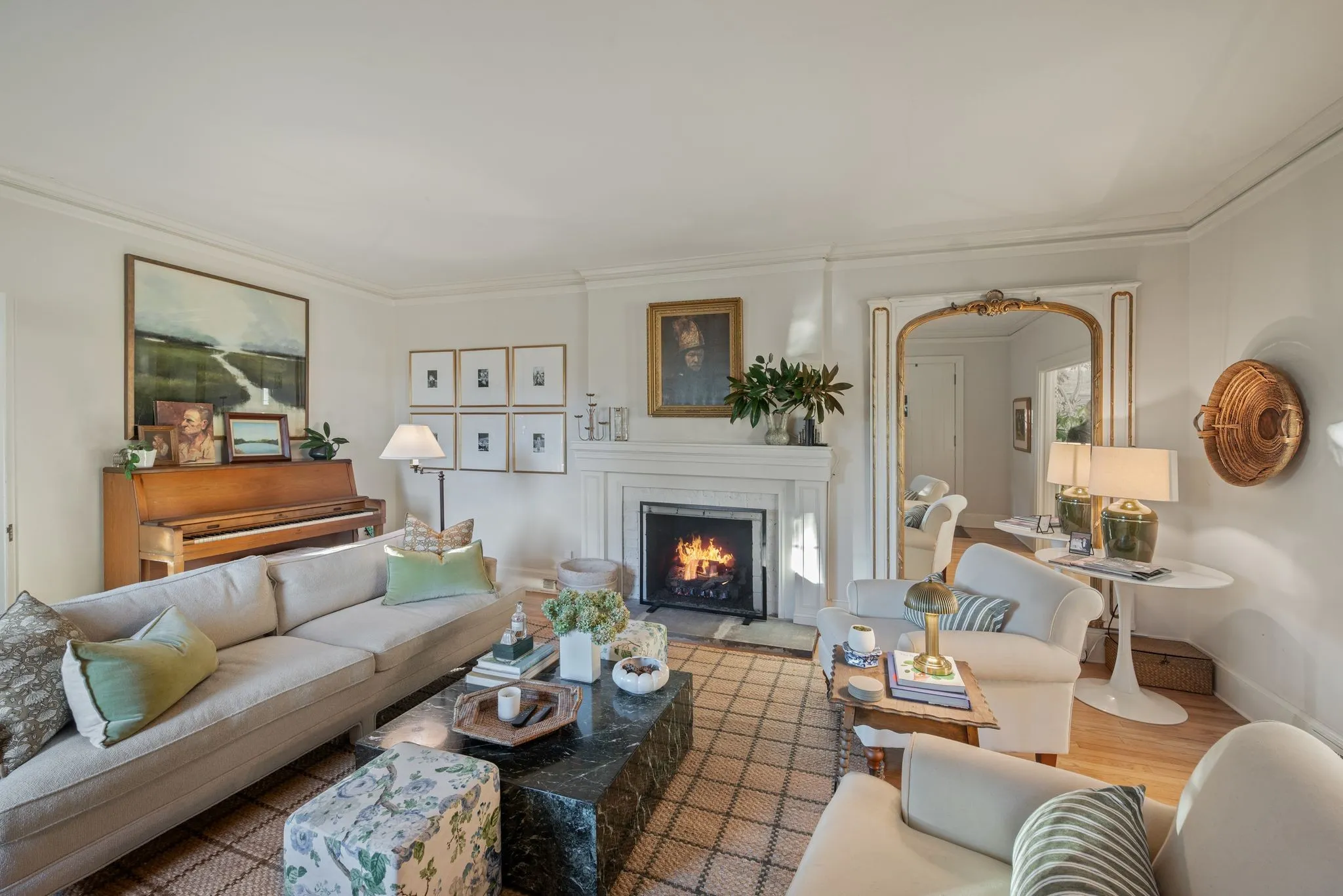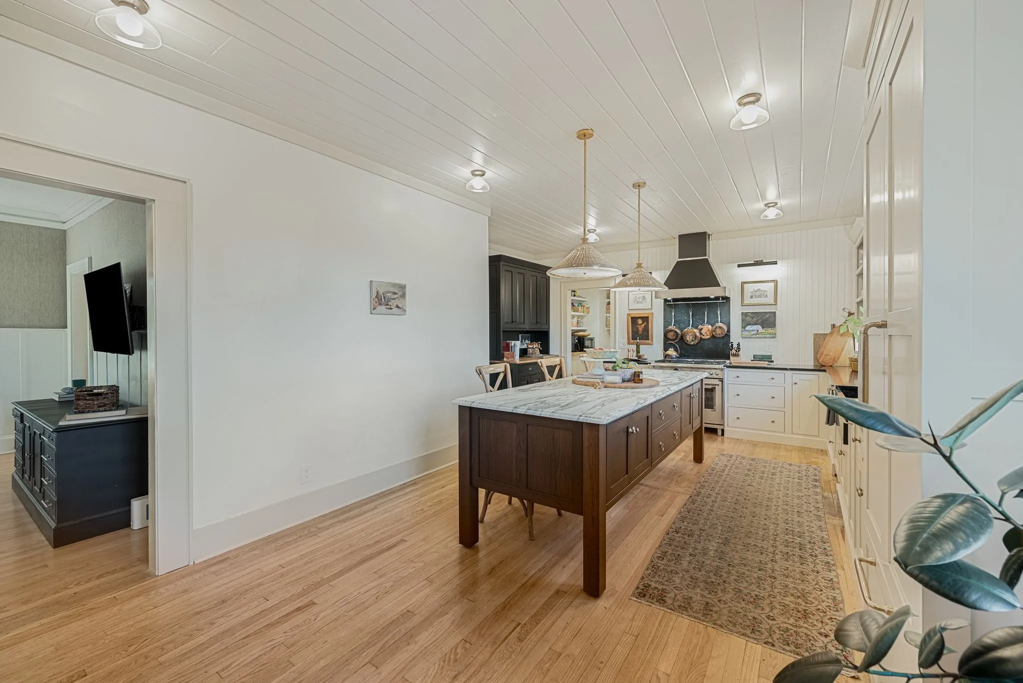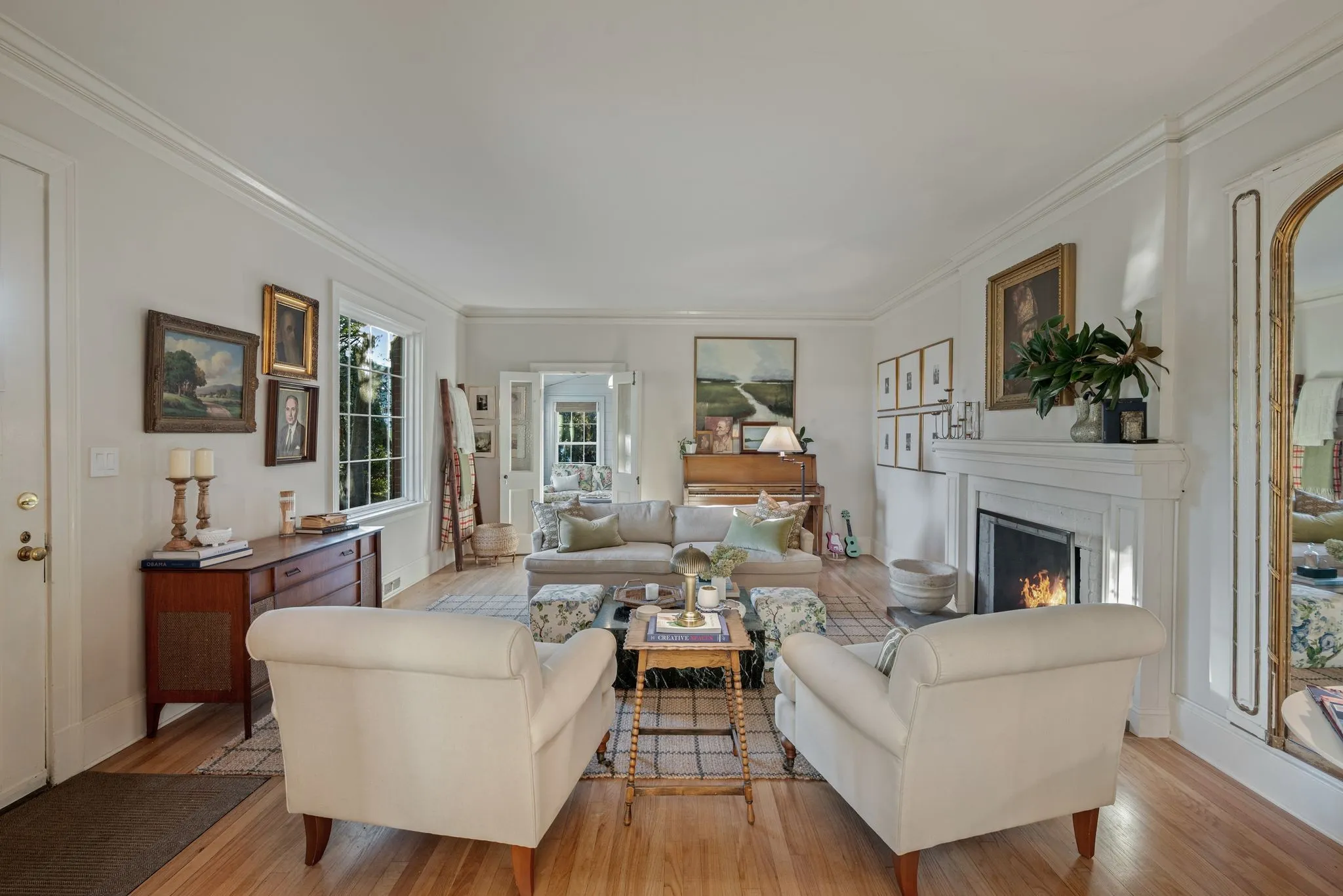 The thoughtfully renovated kitchen blends historic character with modern luxury, featuring a custom island, deVOL by Perrin & Rowe fixtures, Bosch, Bertazzoni, and Jenn-Air appliances, plus a stunning copper wet bar and butler’s pantry with an additional oven—perfect for gathering, celebrating, and entertaining. The main-level primary suite offers its own private sitting room, while upstairs you’ll find three spacious bedrooms and a newly added children’s bonus room.