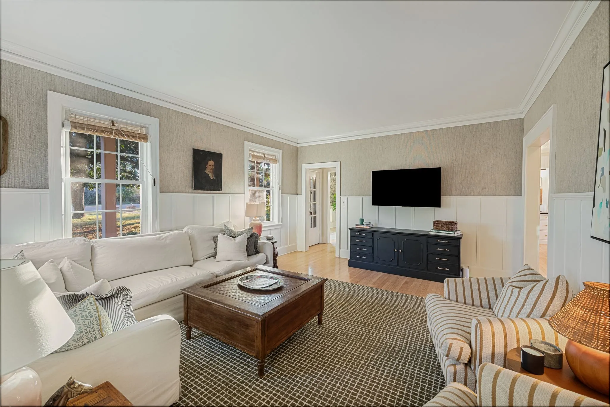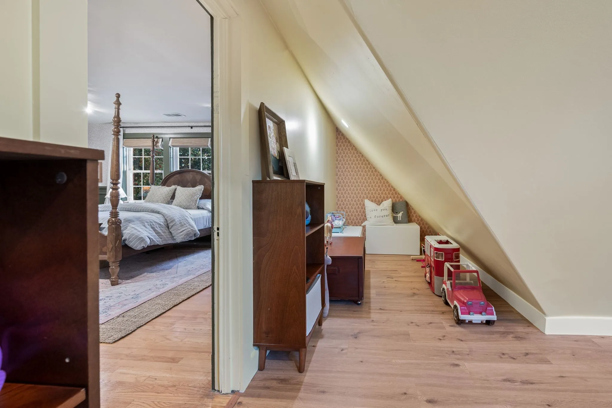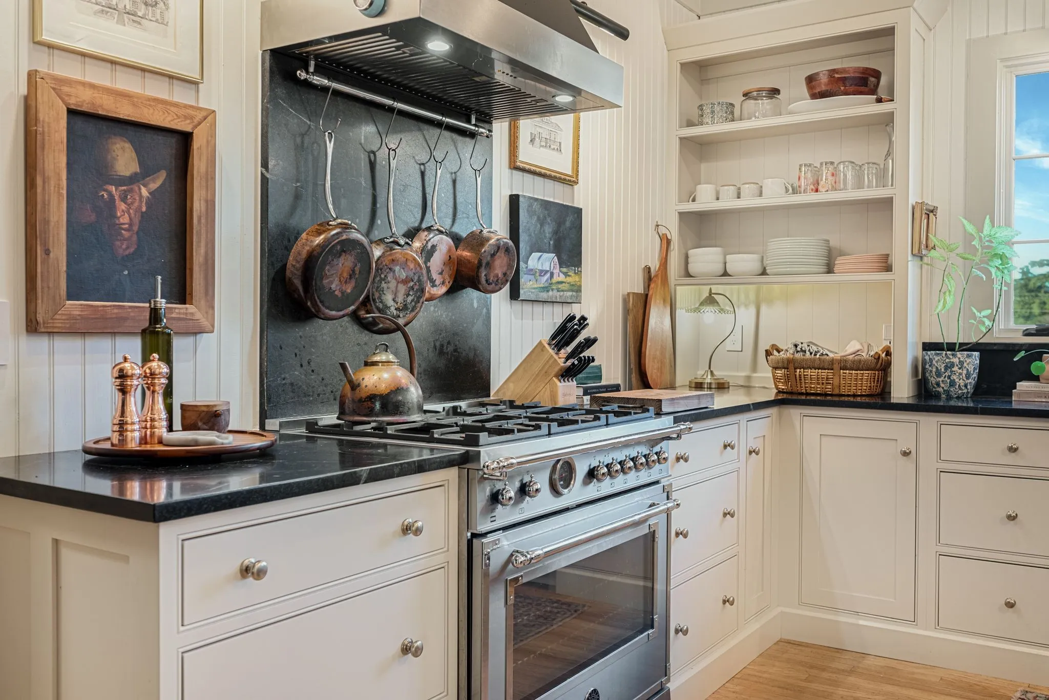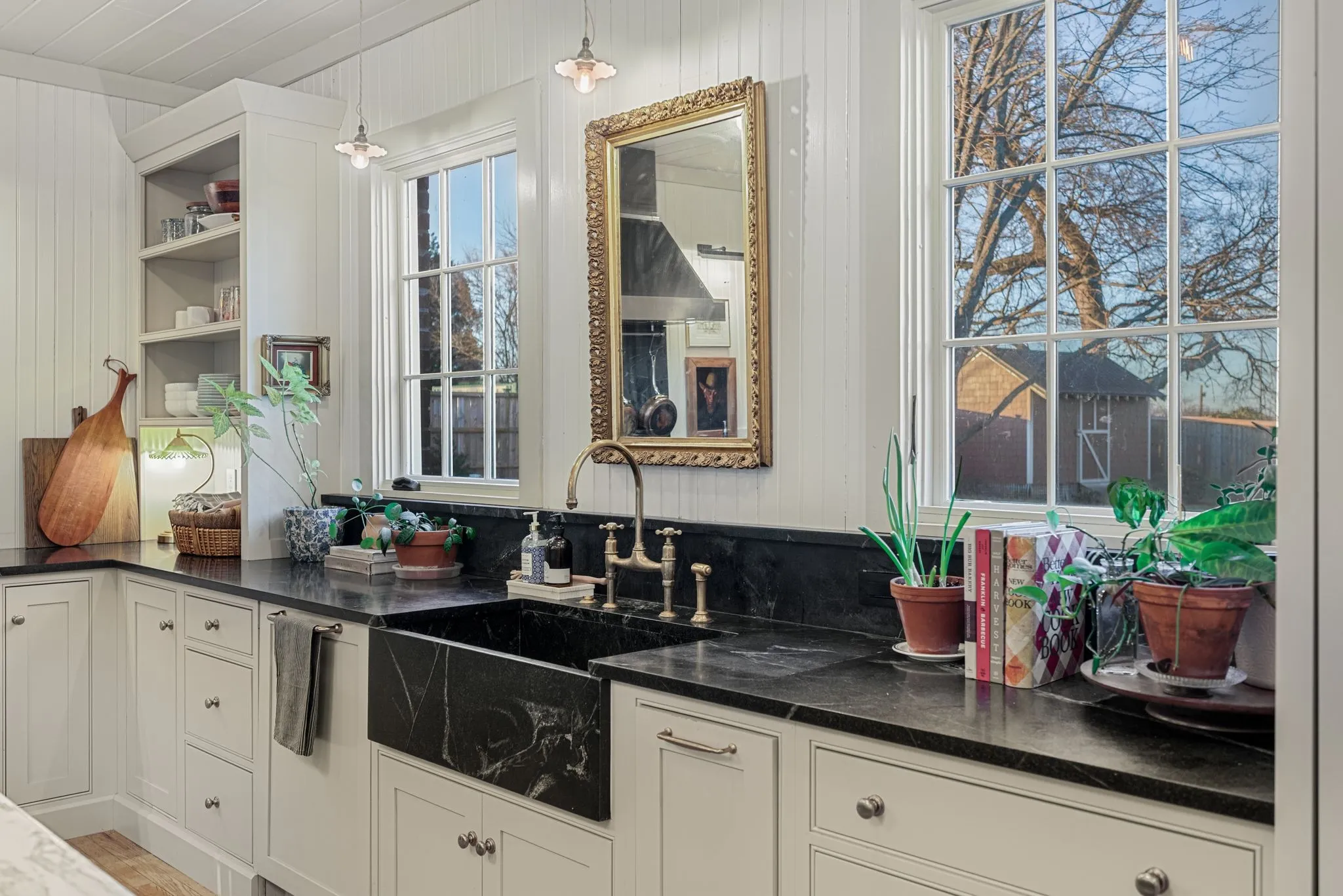 The thoughtfully renovated kitchen blends historic character with modern luxury, featuring a custom island, deVOL by Perrin & Rowe fixtures, Bosch, Bertazzoni, and Jenn-Air appliances, plus a stunning copper wet bar and butler’s pantry with an additional oven—perfect for gathering, celebrating, and entertaining. The main-level primary suite offers its own private sitting room, while upstairs you’ll find three spacious bedrooms and a newly added children’s bonus room.
