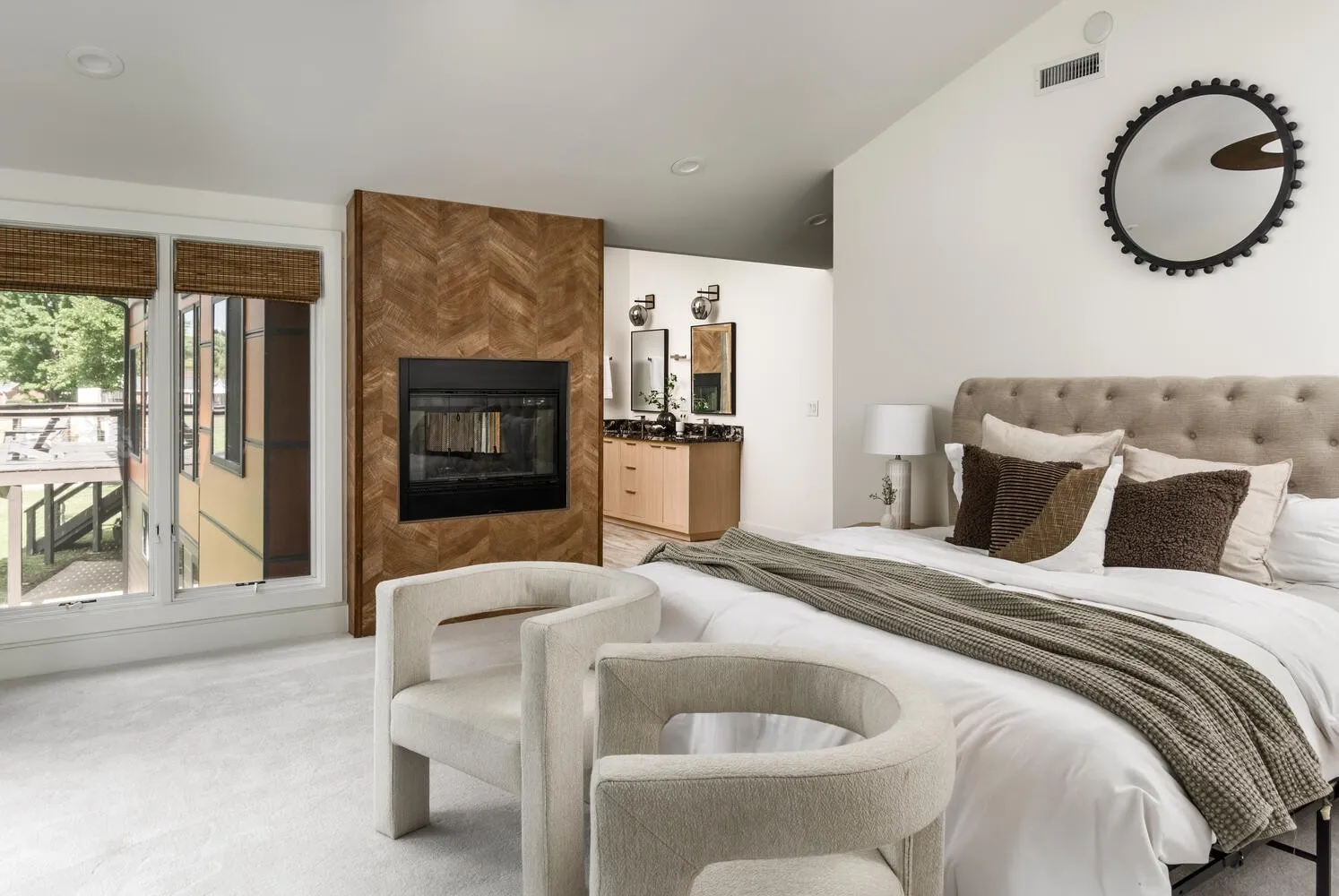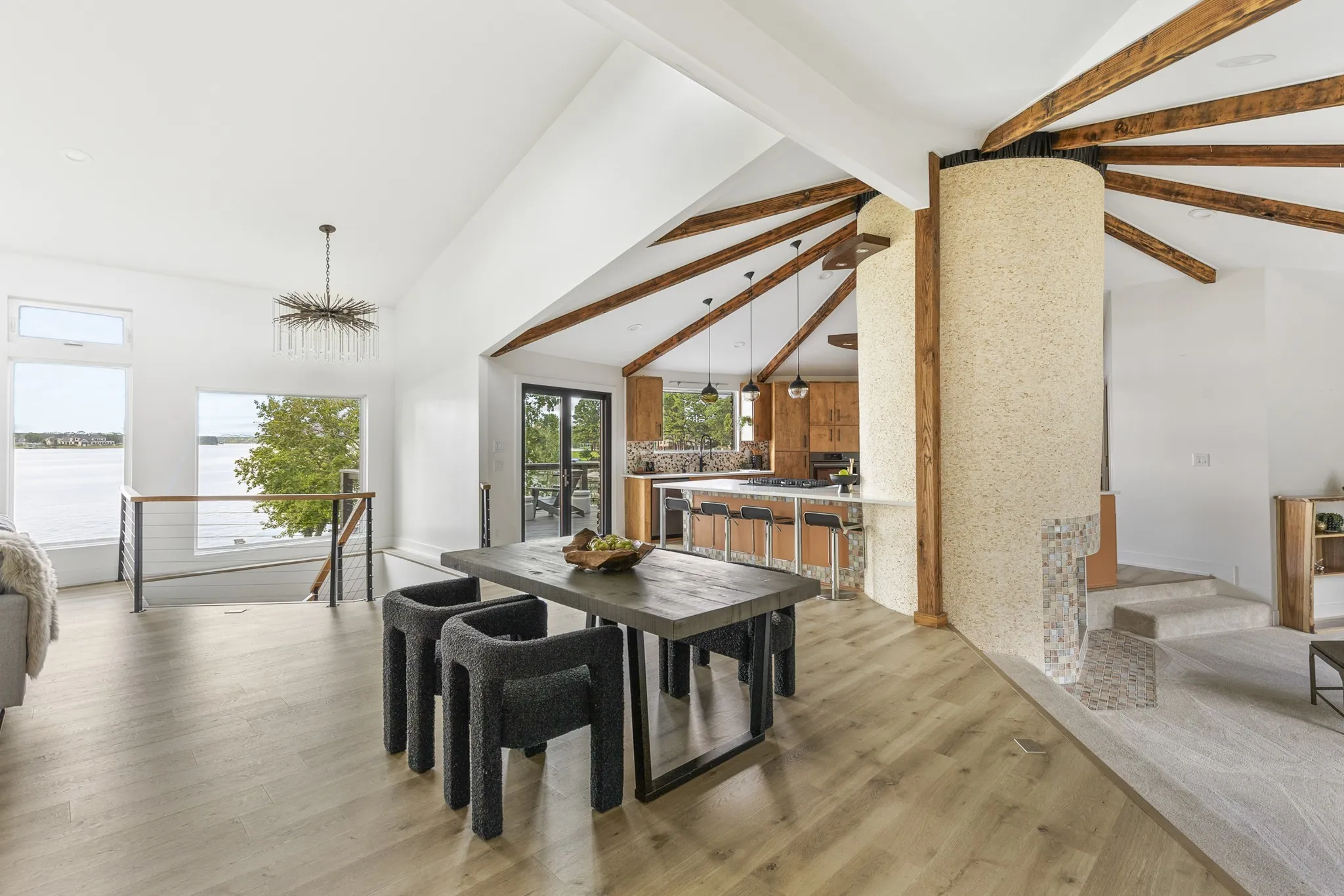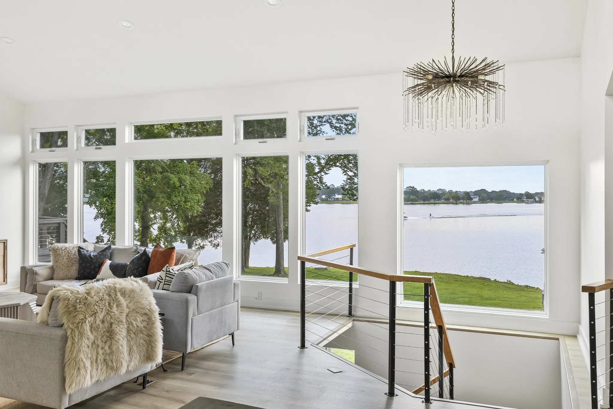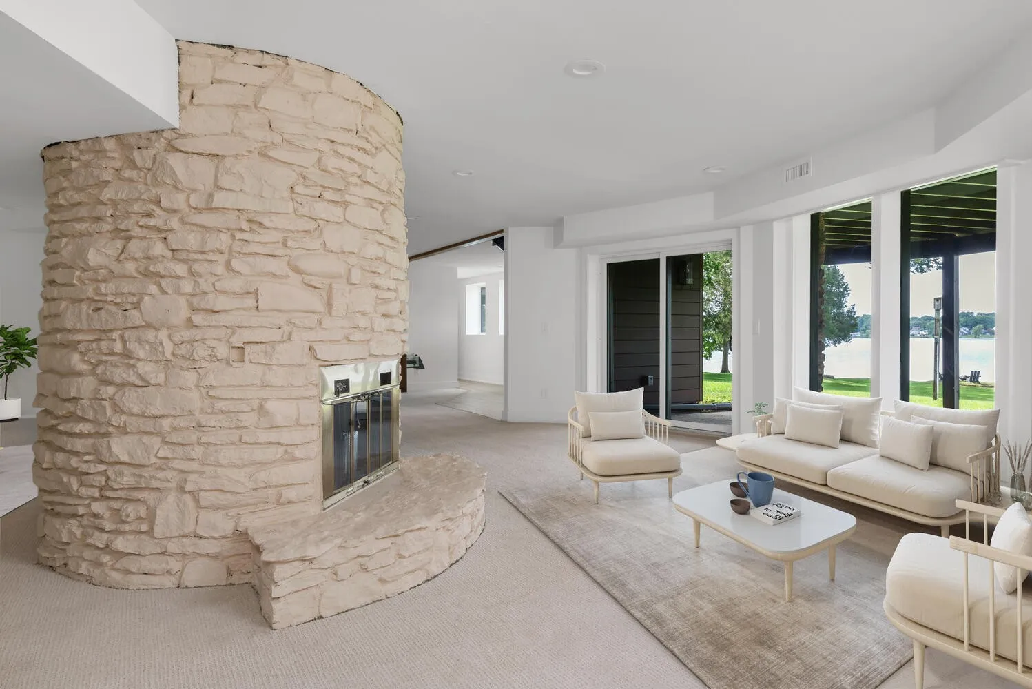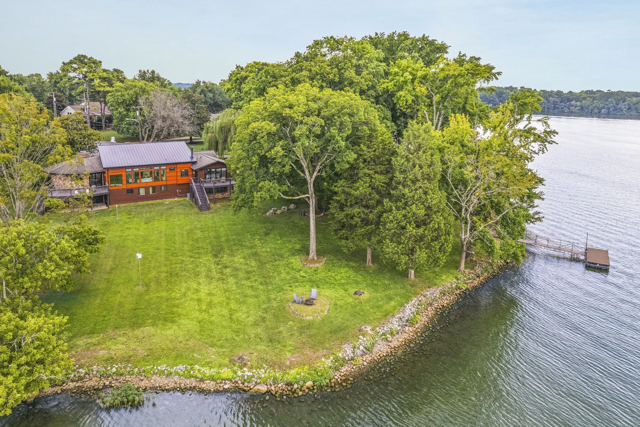 Updated mid century modern tucked at the end of a quiet cul-de-sac on the coveted Indian Lake Peninsula on Old Hickory Lake. This fully renovated home sits on a point with approximately 250 feet of shoreline overlooking the Drake’s Creek channel. Exceptional lake views plus nearly flat lot set this property apart. Renovated in 2020, updates include new Hardi cement fiber siding, a raised metal roof, and expansive windows designed to highlight the home’s high ceilings and dramatic water views. The open layout centers around a circular fireplace and connects the kitchen, dining, and main living spaces. The primary suite features a double sided fireplace, while the lower level offers a large family room, a bedroom ideal for a bunk room, and an office with a kitchenette that could serve as a fifth bedroom or workout space. Mature trees provide privacy and shade, with easy walkout access to the shoreline. A two car garage, carport, and circular driveway offer ample parking. Enjoy sunsets from the dock and unmatched lake access, with marinas and lakefront dining just a short boat ride away. A platform dock is in place, and a covered dock with boat slip would be allowed per the Army Corp of Engineers.
