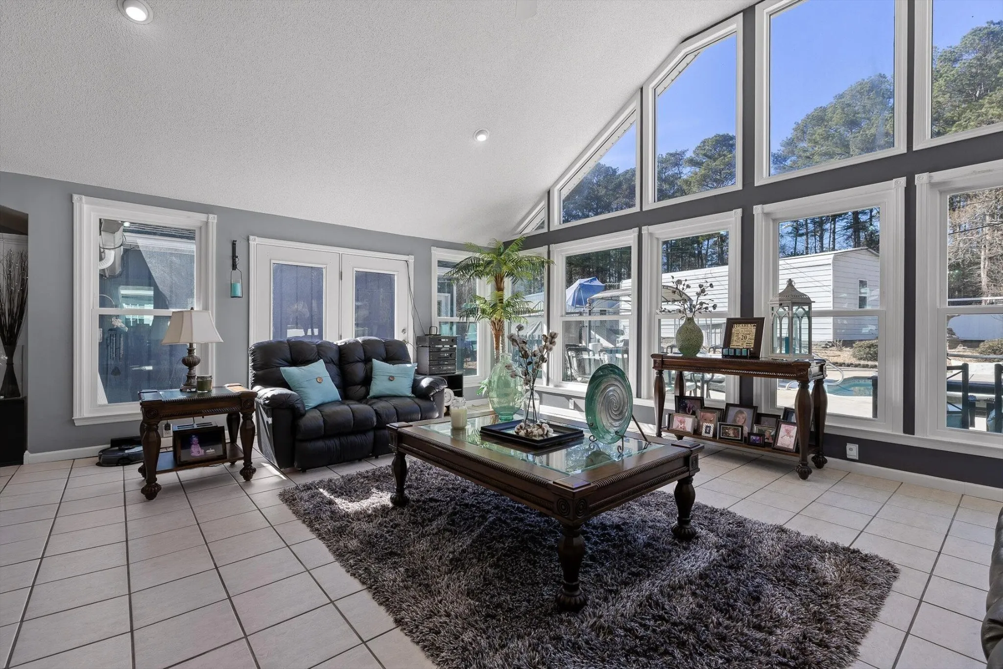 floor-to-ceiling windows. Sit inside and enjoy the perks of this home, which include the beautiful pond and the in-ground salt water pool as well. All of these areas have a nice buffer of trees to maintain the privacy and seclusion of the home. Plenty of entertaining space outside once the warmer weather arrives, with a fire pit surrounded by rows of seating. There are multiple areas to sit and relax, or be active with friends and family. Enjoy the huge expanses of concrete walkways, sitting areas and Trex decks, as well as the oversized space around the pool itself. The pond is a major focus of the back acreage, stocked for fishing or just relaxing in the sunshine. The home was designed for entertaining large groups but maintaining the cozy, intimate spaces inside as well. The inside is a mirror to the back yard, with larger open spaces as well as