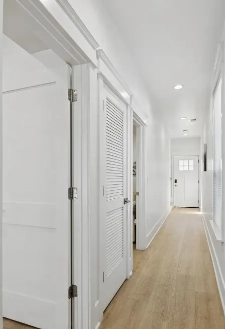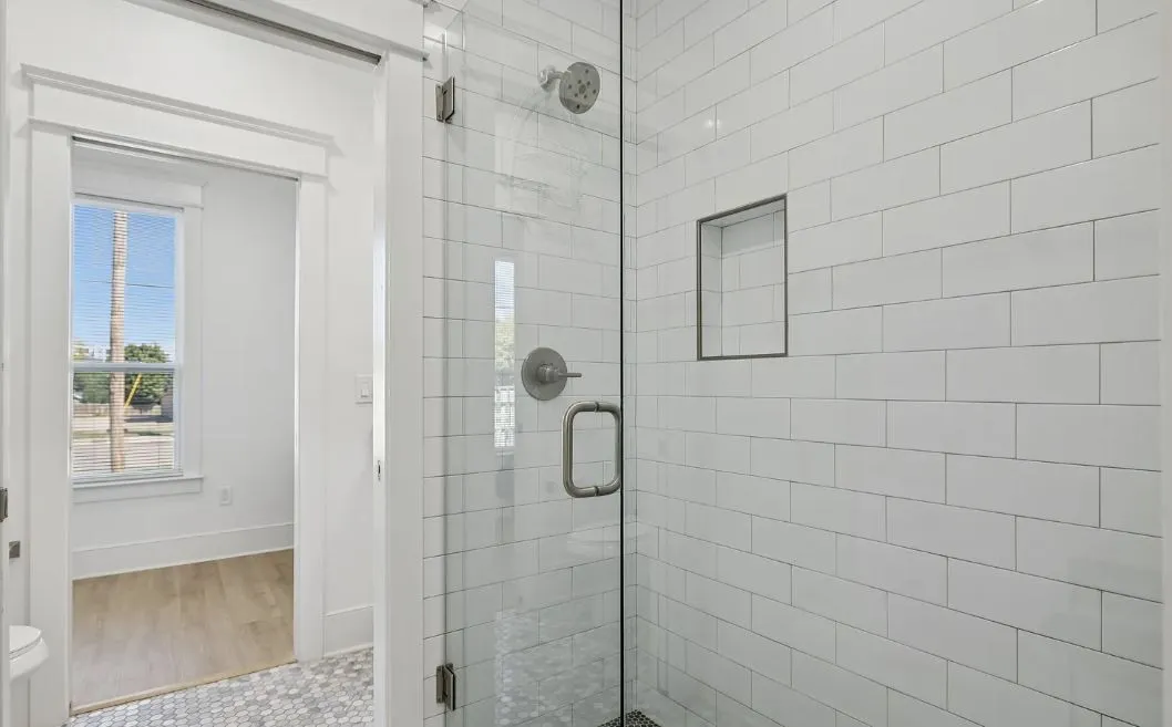The main residence features an open-concept layout with a large island, quartz countertops, stainless steel appliances and a navy herringbone backsplash. French doors open to a private balcony, creating seamless indoor-outdoor living. The top-floor primary suite includes a walk-in closet, spa-style bath and a second private balcony. A first-floor flex room functions well as a bedroom, office or media space.