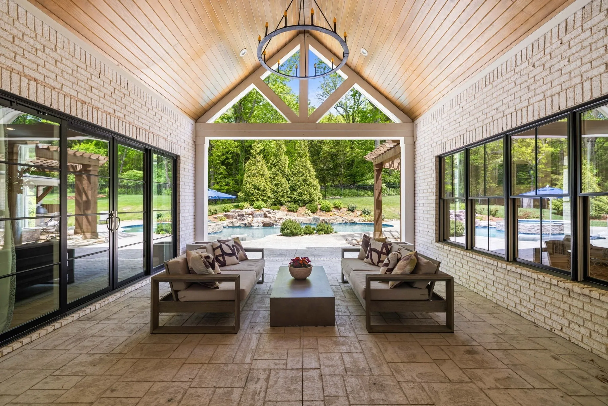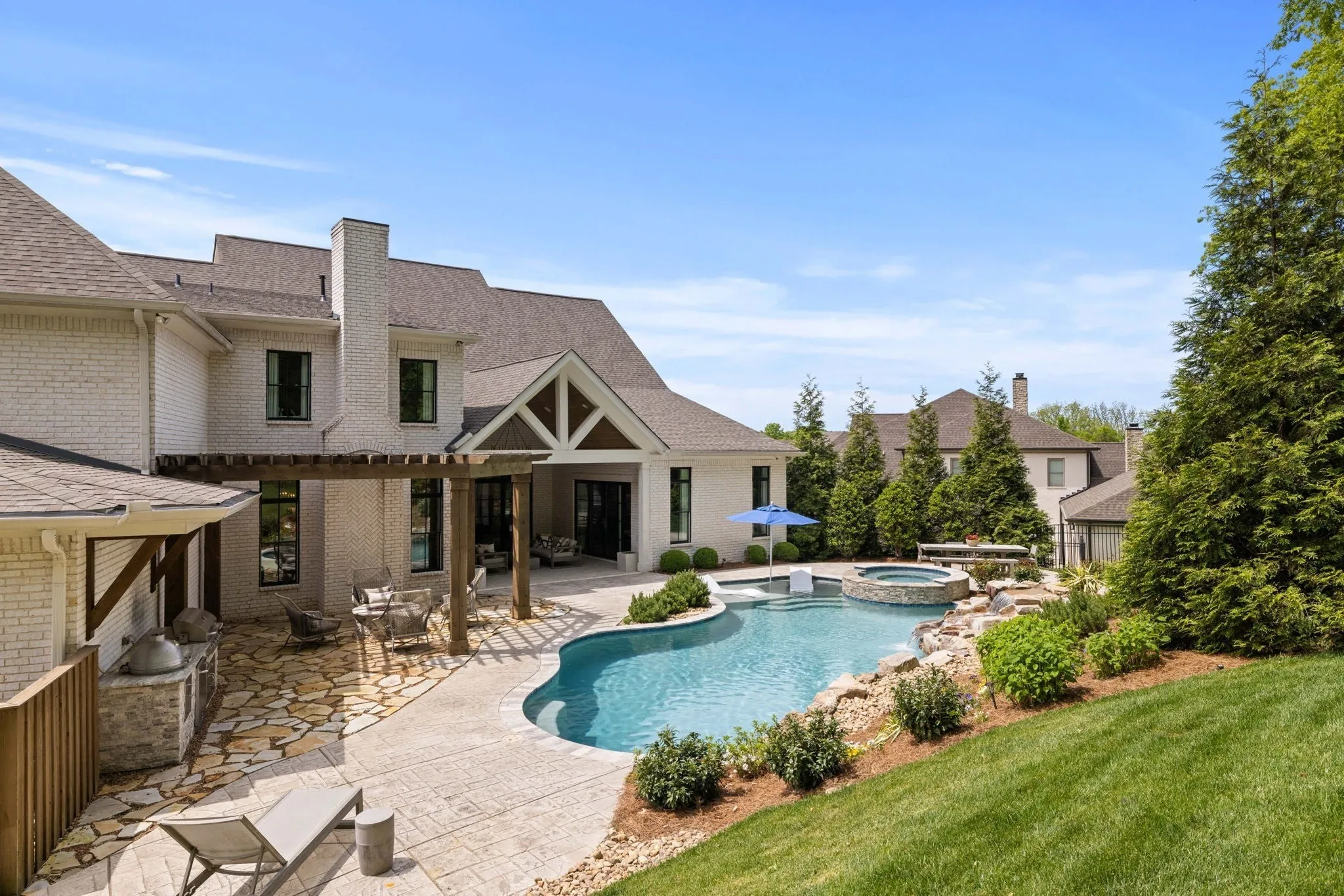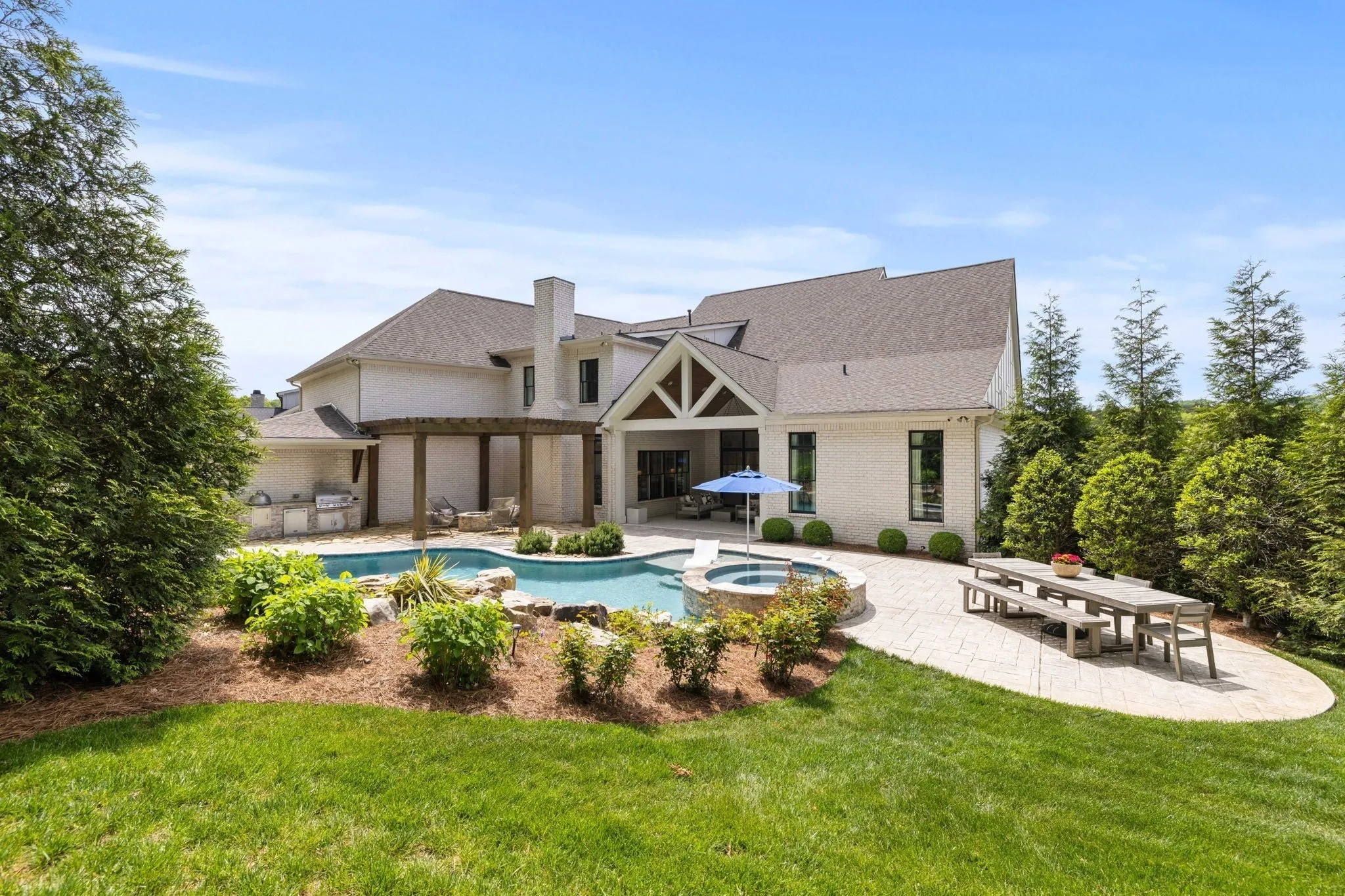 This beautifully maintained TN Valley custom built estate home is a 10/10 and ready for its new owners! This home offers a beautiful open floor plan with high ceilings and luxury abounds throughout. There are 3 bedrooms including the primary on the main floor, each with their own ensuite bathrooms, and up to 3 bedrooms on the 2nd level all with ensuite bathrooms as well. There is a large bonus / workout space on the 2nd floor with a private bath that could also be used as a 6th bedroom. There is no shortage of custom woodworking found on the wall and ceiling details throughout this home and wood floors are found throughout! The floorplan flows seaml essly offering a beautiful open kitchen, family room, and hearth room / sitting room as well as media room on the main level all with fantastic views of your beautiful outdoor oasis providing luxurious outdoor living and featuring a custom Rondo pool and hot tub, full grill area featuring a Blaze grill, Smoker, Refrigerator, outdoor surround sound and built in fire pit area. The pool features a waterfall, fire bowls, and a baja shelf and backs to mature trees for immense privacy and sits beautifully on a small cul de sac. From Custom draperies, wallpaper, gorgeous lighting selections to exquisite Carrara Marble details, and gorgeous views this home has been thoughtfully designed at each step!