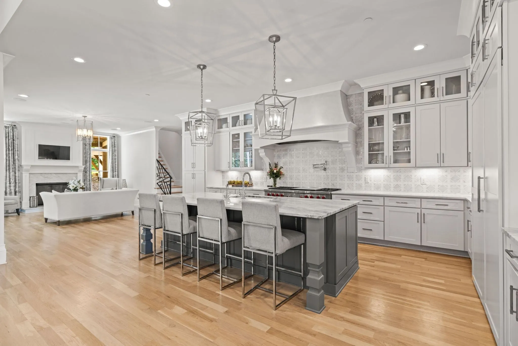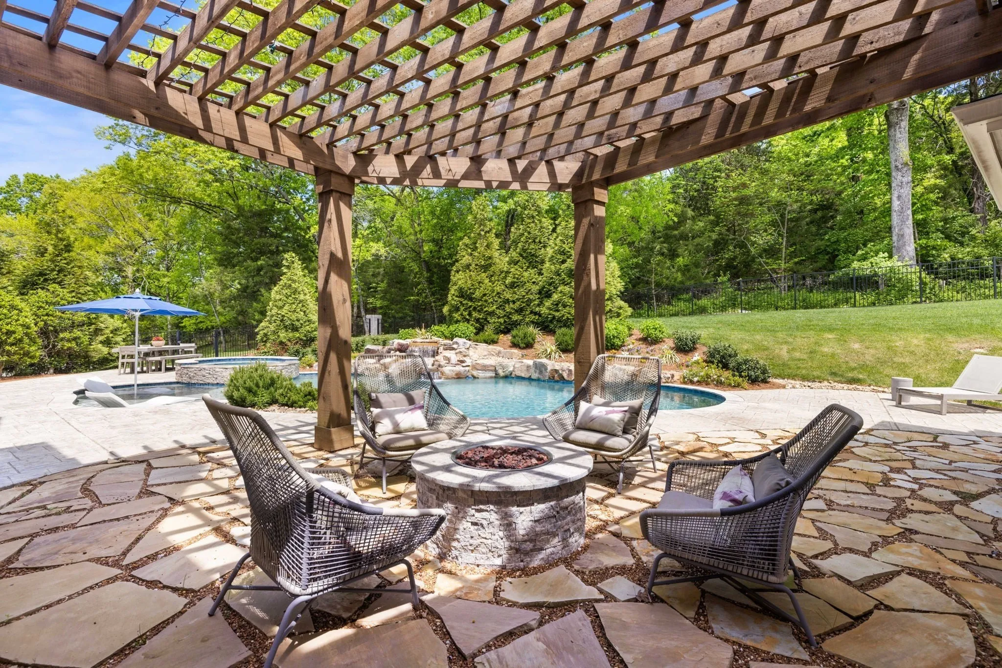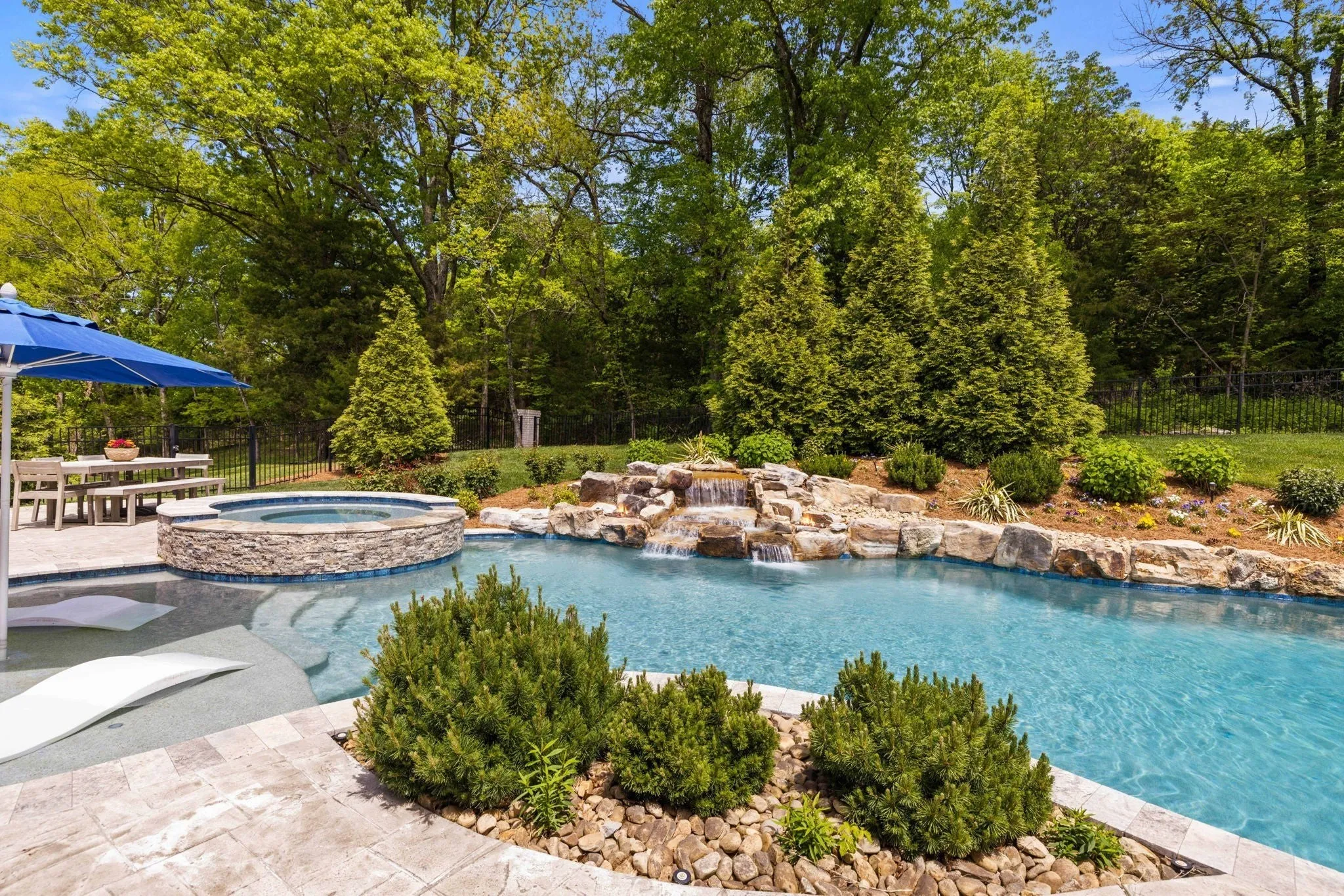 This beautifully maintained TN Valley custom built estate home is a 10/10 and ready for its new owners! This home offers a beautiful open floor plan with high ceilings and luxury abounds throughout. There are 3 bedrooms including the primary on the main floor, each with their own ensuite bathrooms, and up to 3 bedrooms on the 2nd level all with ensuite bathrooms as well. There is a large bonus / workout space on the 2nd floor with a private bath that could also be used as a 6th bedroom. There is no shortage of custom woodworking found on the wall and ceiling details throughout this home and wood floors are found throughout! The floorplan flows seaml essly offering a beautiful open kitchen, family room, and hearth room / sitting room as well as media room on the main level all with fantastic views of your beautiful outdoor oasis providing luxurious outdoor living and featuring a custom Rondo pool and hot tub, full grill area featuring a Blaze grill, Smoker, Refrigerator, outdoor surround sound and built in fire pit area. The pool features a waterfall, fire bowls, and a baja shelf and backs to mature trees for immense privacy and sits beautifully on a small cul de sac. From Custom draperies, wallpaper, gorgeous lighting selections to exquisite Carrara Marble details, and gorgeous views this home has been thoughtfully designed at each step!