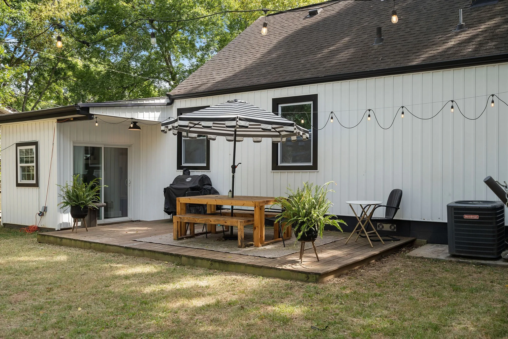 Smart-home features: Nest thermostat, connected locks + keypad, Phillips Hue spotlights, and string lights in front & back yard (all connected).