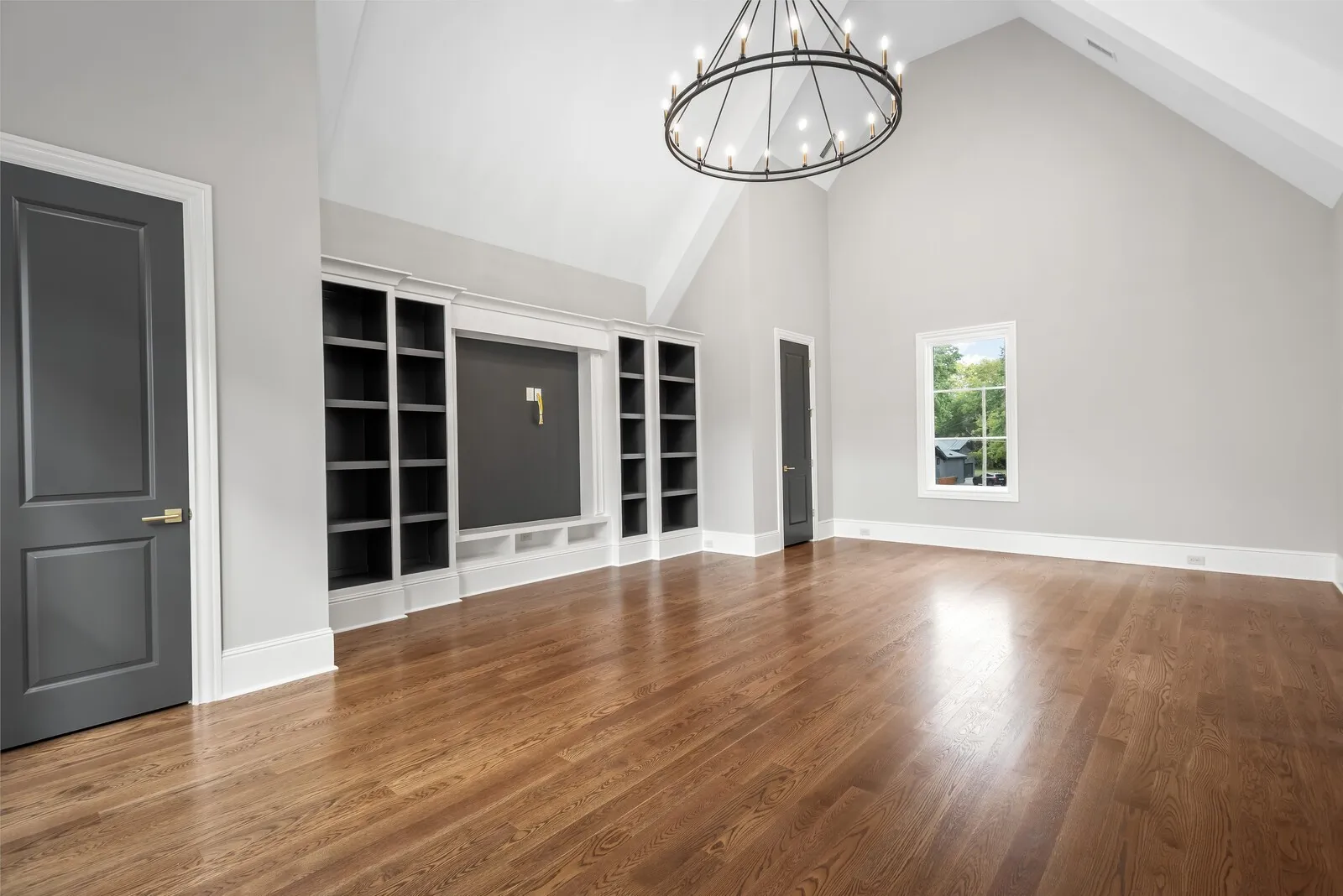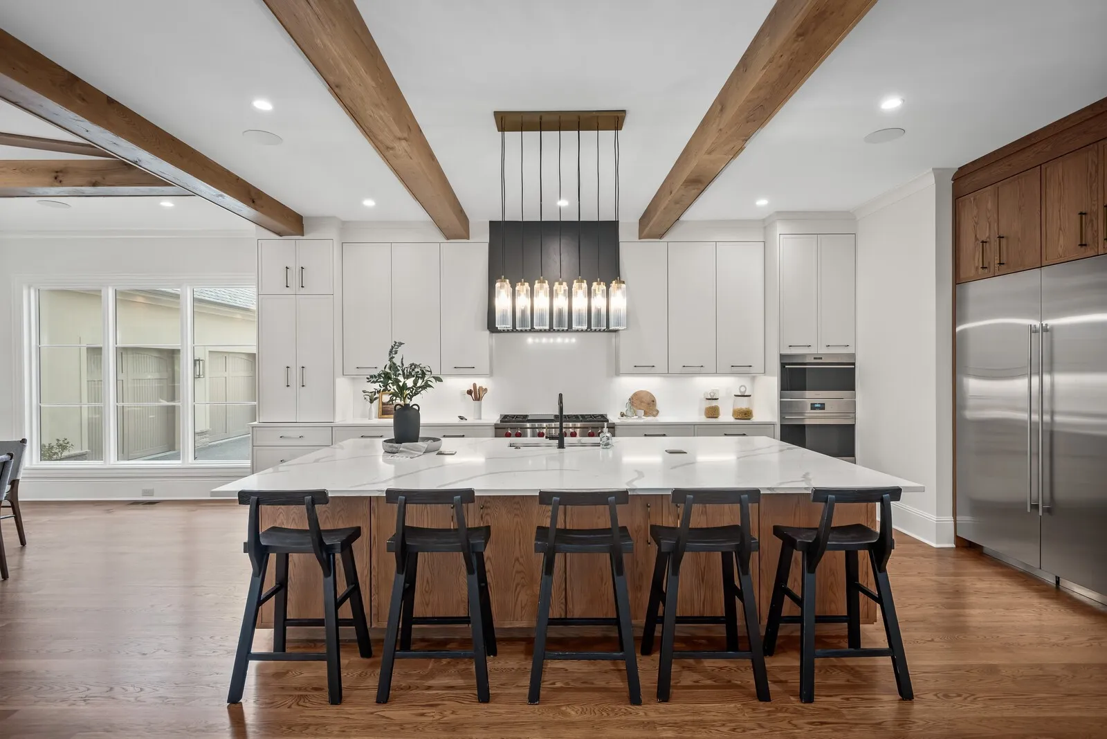 Inside, 10’ ceilings and 4″ white oak hardwoods create a light, airy feel. The chef’s kitchen with Wolf & Sub‑Zero appliances opens to a vaulted great room and intimate hearth room, all flowing to a covered patio with built‑in outdoor kitchen and fireplace for year‑round gatherings.