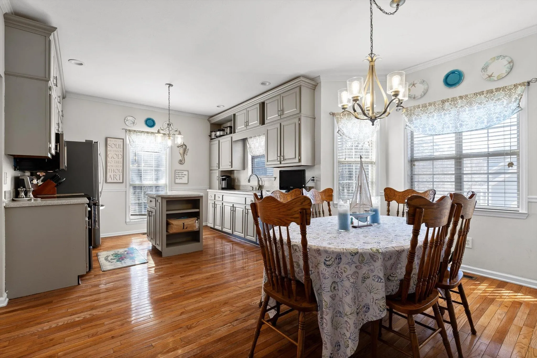 Stunning Cape Cod-style home on a peaceful cul-de-sac just minutes from downtown Chattanooga. This beautifully maintained 5-bedroom residence offers soaring 9-ft ceilings, an open, light-filled living space, and a cozy fireplace that anchors the great room. The chef-inspired kitchen features custom cabinetry, Corian countertops, and premium LG & Bosch stainless appliances, flowing seamlessly into a spacious formal dining room—perfect for entertaining.