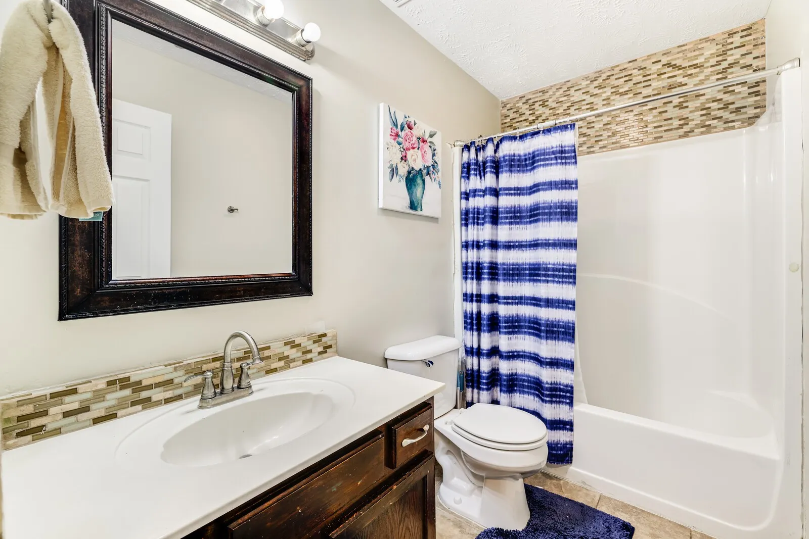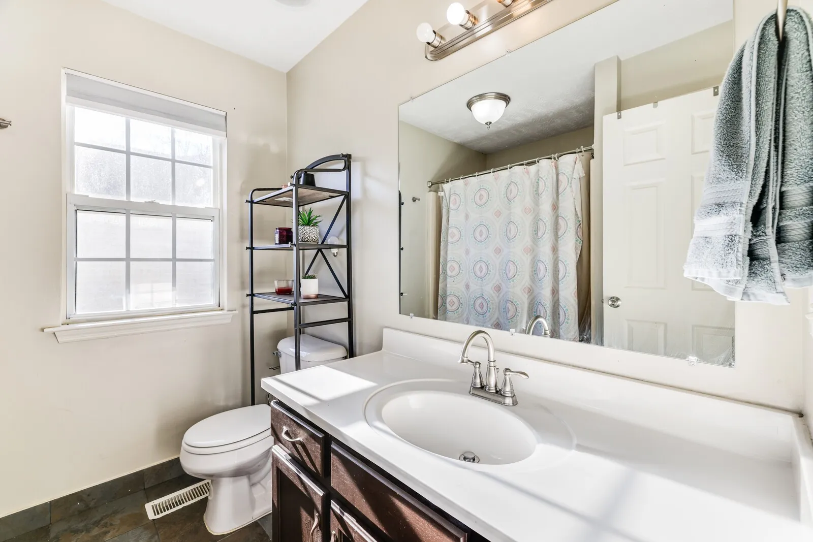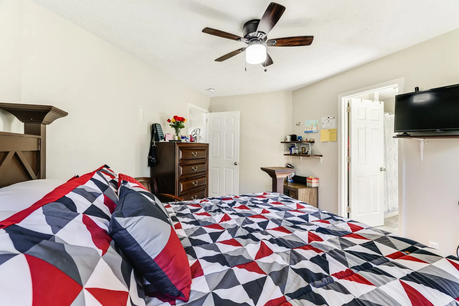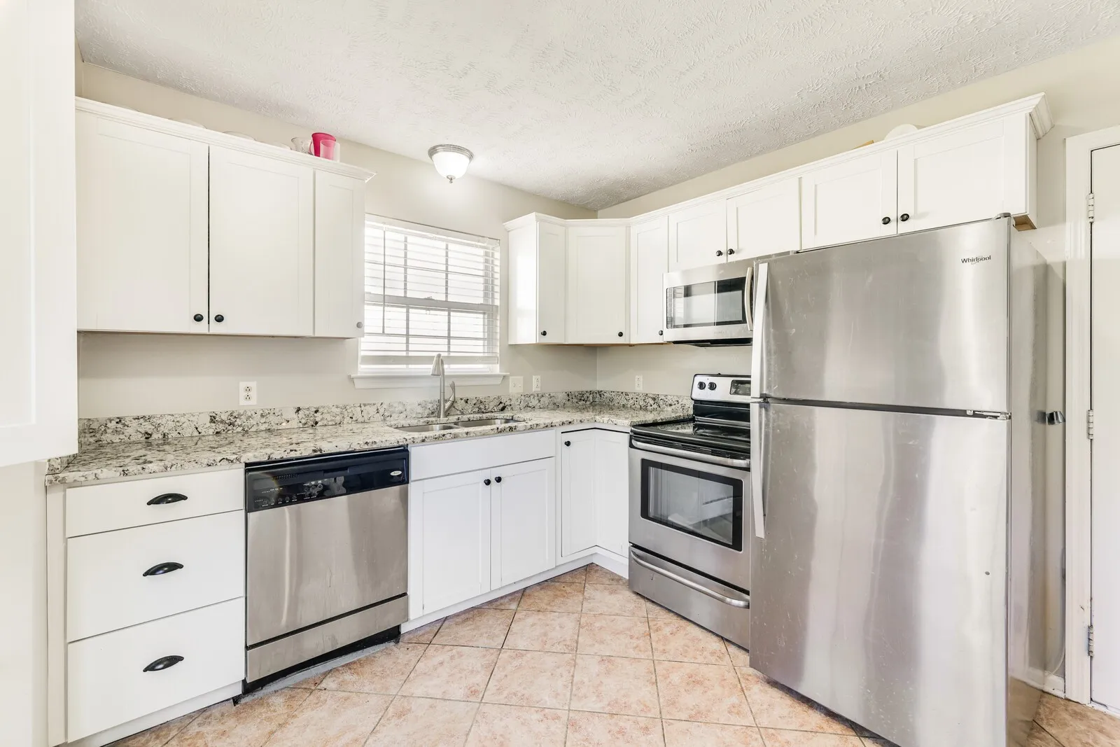 The kitchen is filled with natural light and showcases crisp white cabinetry, a charming bay window, and a convenient pass-through to the dining space, ideal for entertaining. The primary suite includes a private en-suite bathroom, while a second full bathroom serves the two additional bedrooms… perfect for family or guests.