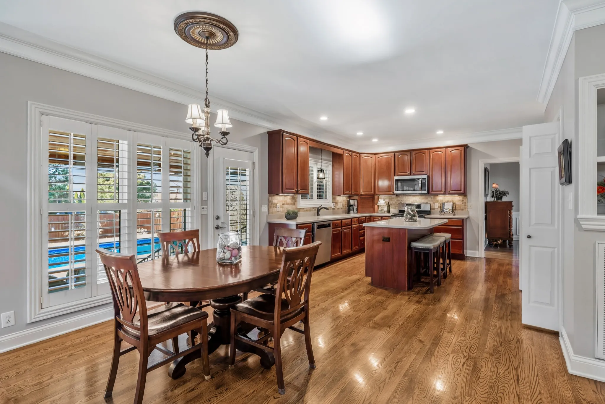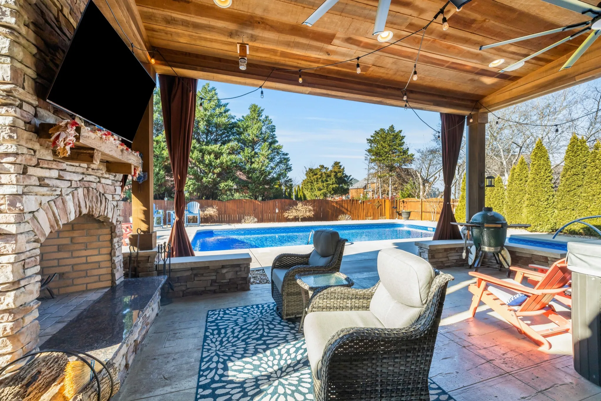 Outdoor living shines with a saltwater pool featuring a newer liner and pool heater, fenced backyard, and a covered stamped-concrete patio with a wood-burning fireplace with gas starter, outdoor kitchen (granite counters, sink, built-in gas grill), rough-cut poplar wood ceiling, and a hot tub that remains. The pool bath includes tiled plank flooring, rough-cut poplar ceiling, and plantation shutter window. A stone fire pit adds another outdoor gathering space.\n