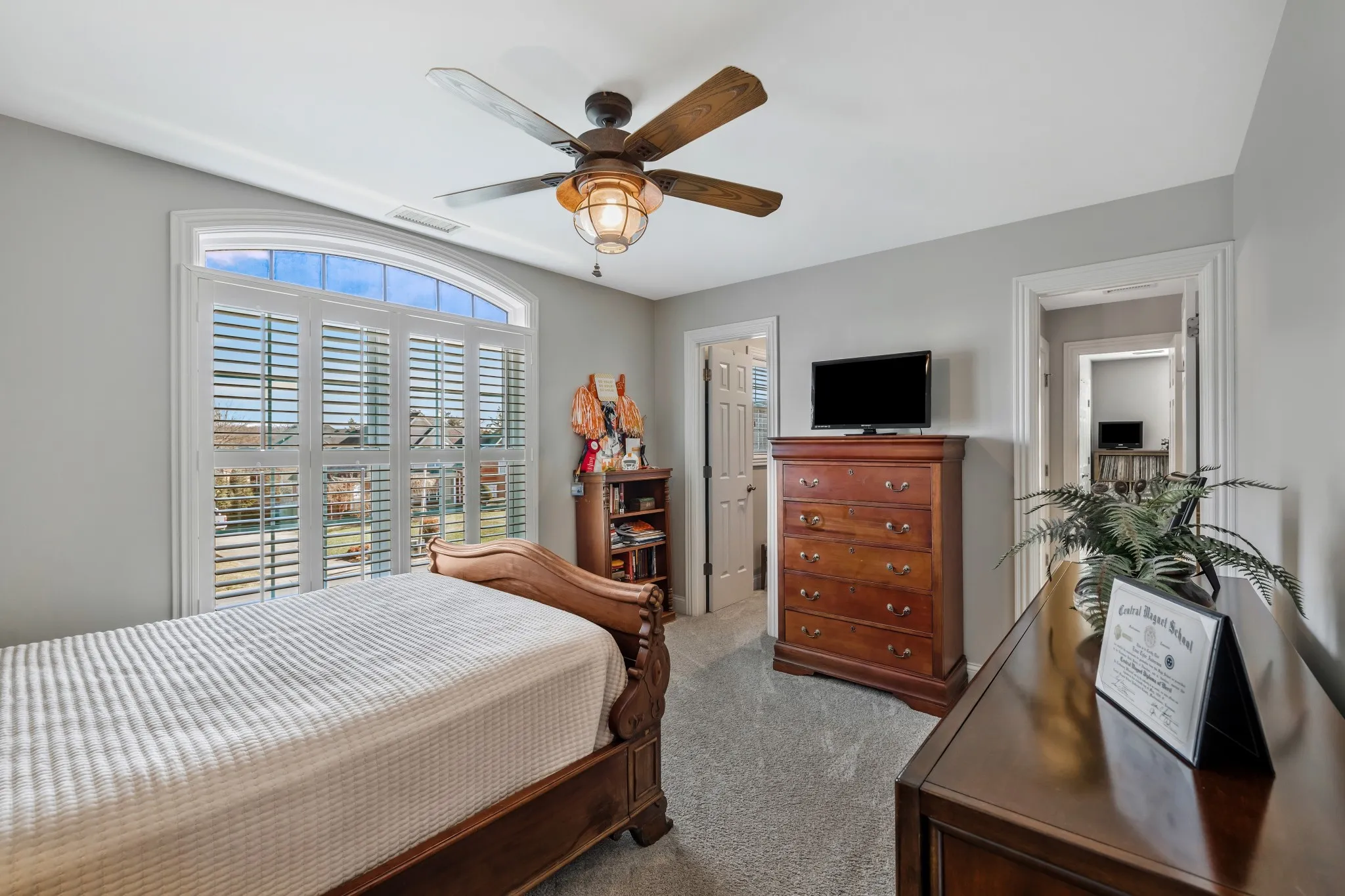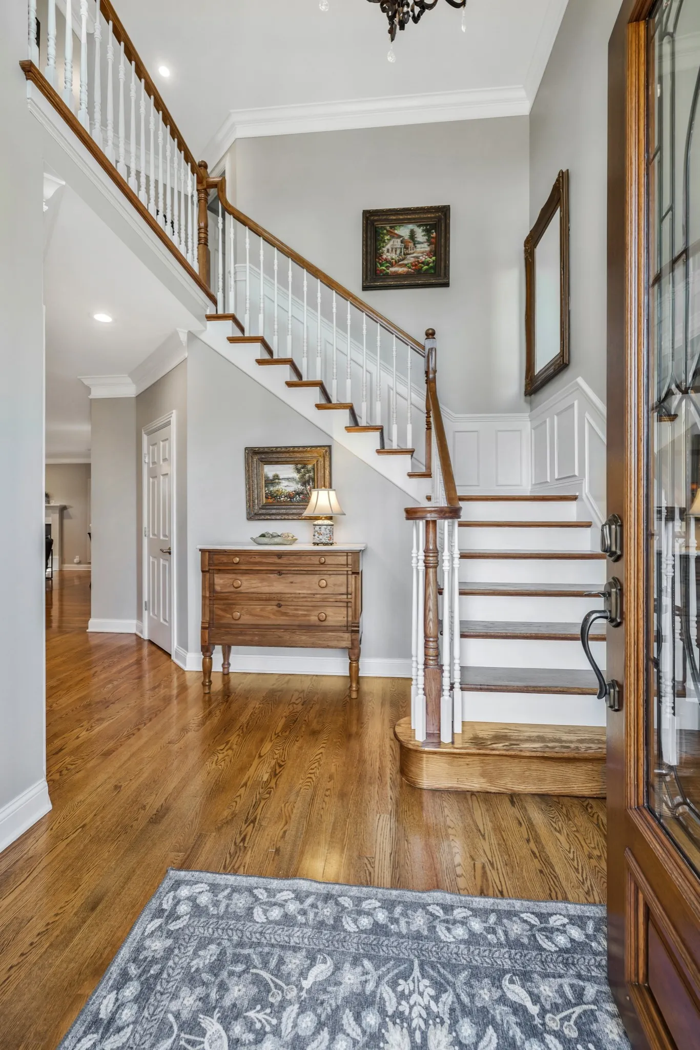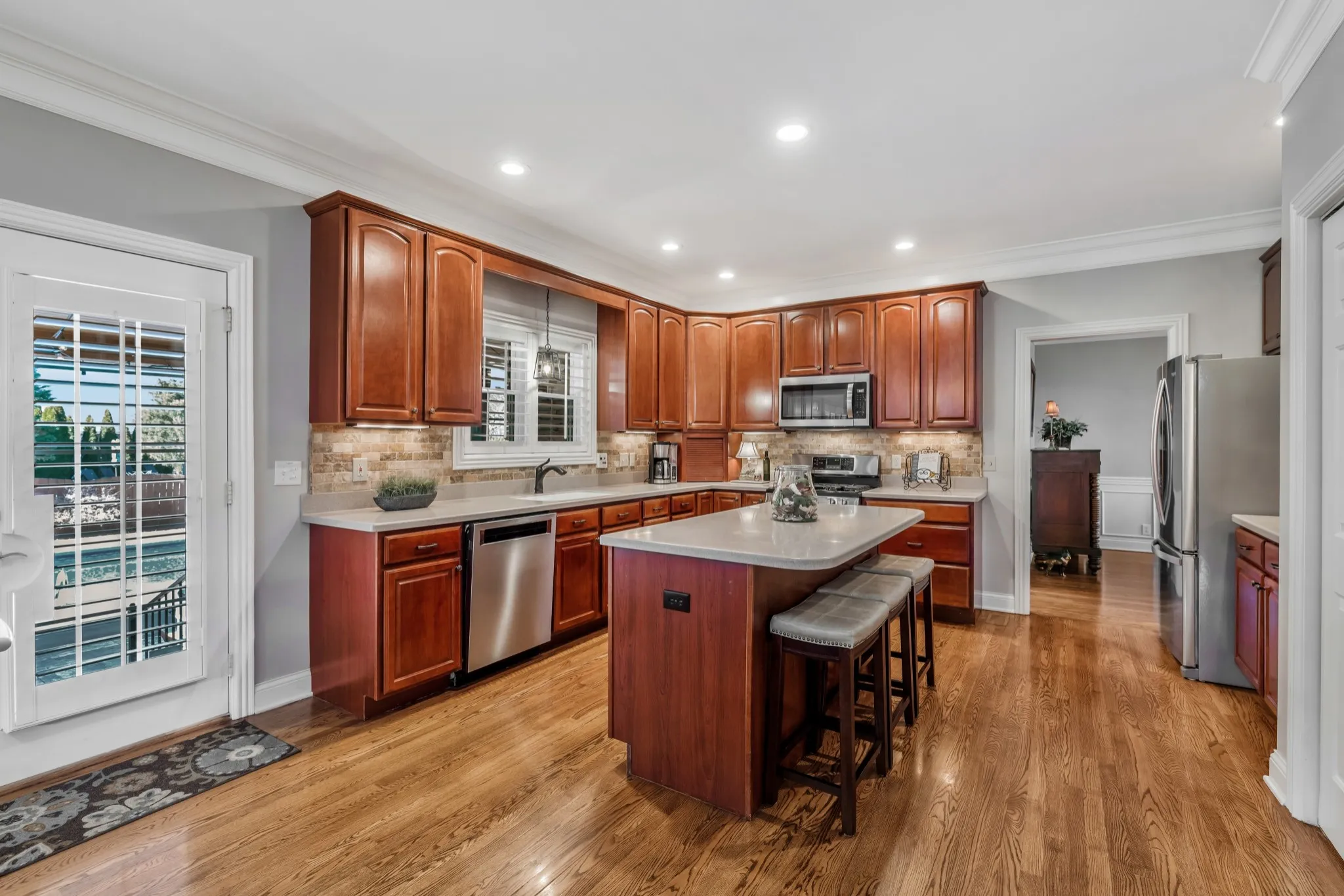 A custom 8-foot solid maple front door with beveled glass and transom panels welcomes you into a home filled with quality craftsmanship. Features include extensive trim work, wainscoting in the dining room and stairway, and built-in bookshelves in the living room, office, and bonus room. Hardwood floors span the main level, plantation shutters and custom window shades add warmth, and the living room includes a gas log fireplace. Interior spaces have been refreshed with a neutral color palette, complementing the home’s thoughtful updates and custom details.\n