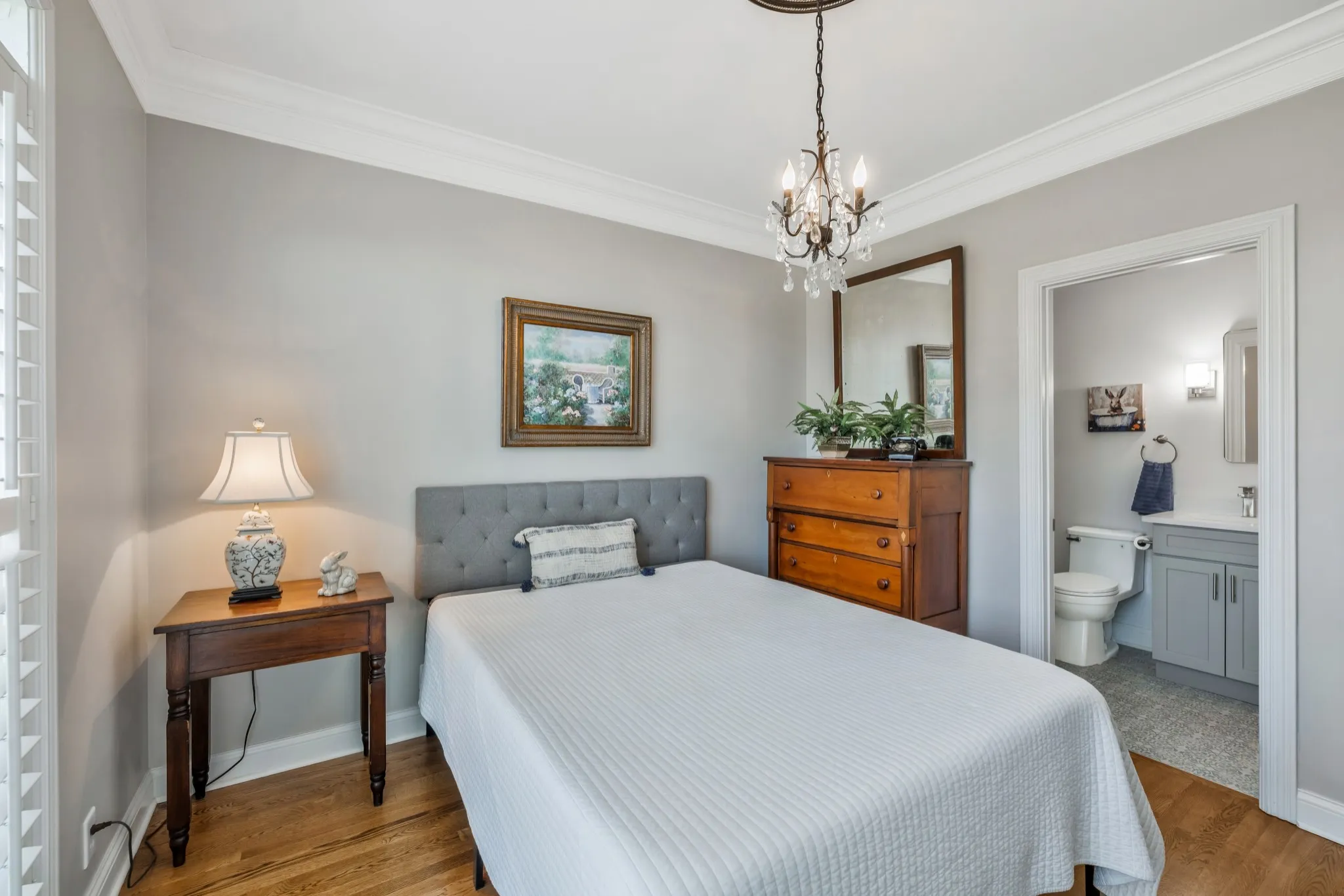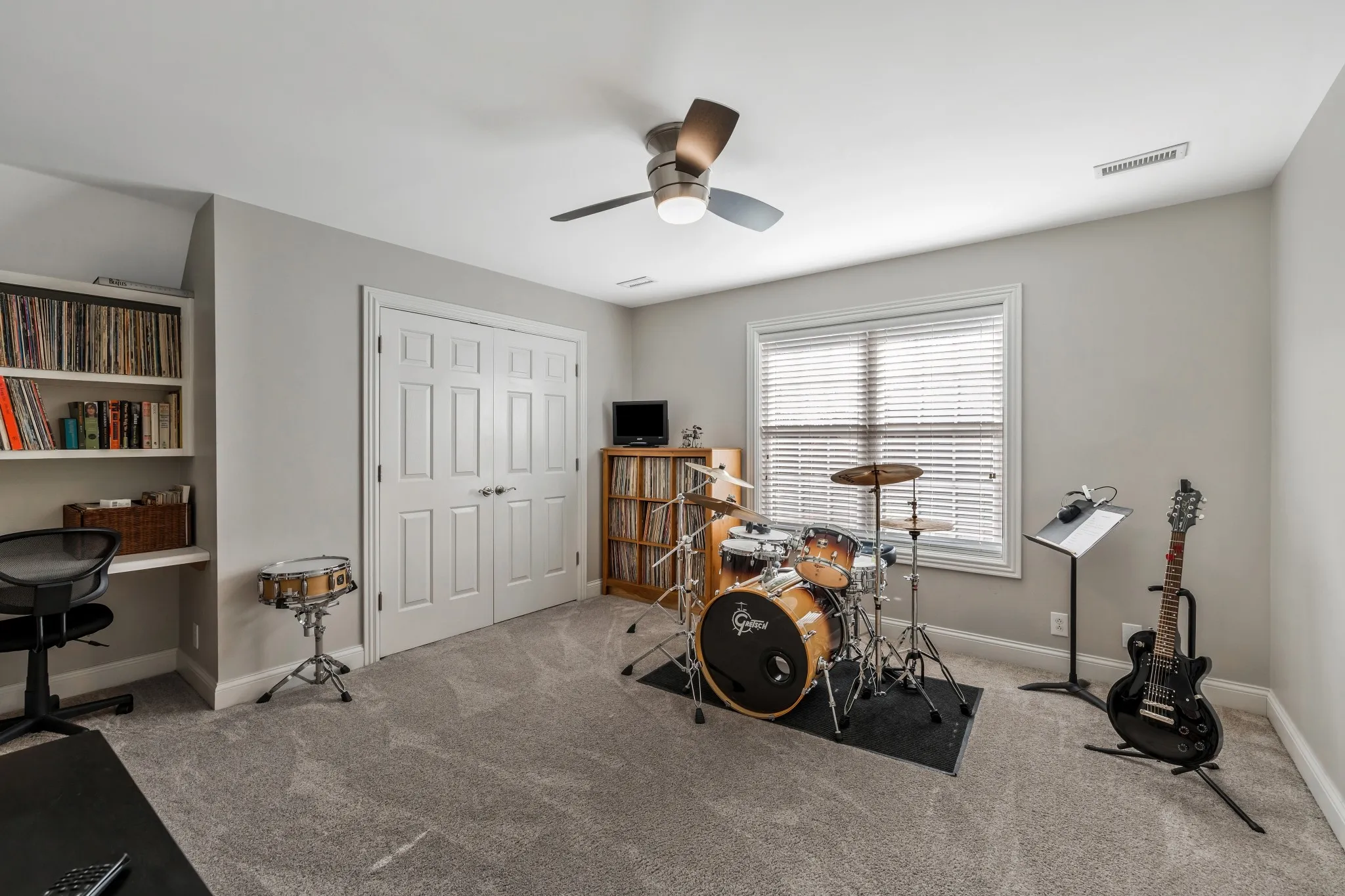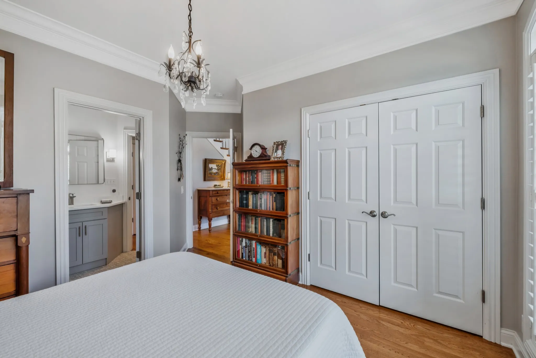 A custom 8-foot solid maple front door with beveled glass and transom panels welcomes you into a home filled with quality craftsmanship. Features include extensive trim work, wainscoting in the dining room and stairway, and built-in bookshelves in the living room, office, and bonus room. Hardwood floors span the main level, plantation shutters and custom window shades add warmth, and the living room includes a gas log fireplace. Interior spaces have been refreshed with a neutral color palette, complementing the home’s thoughtful updates and custom details.\n