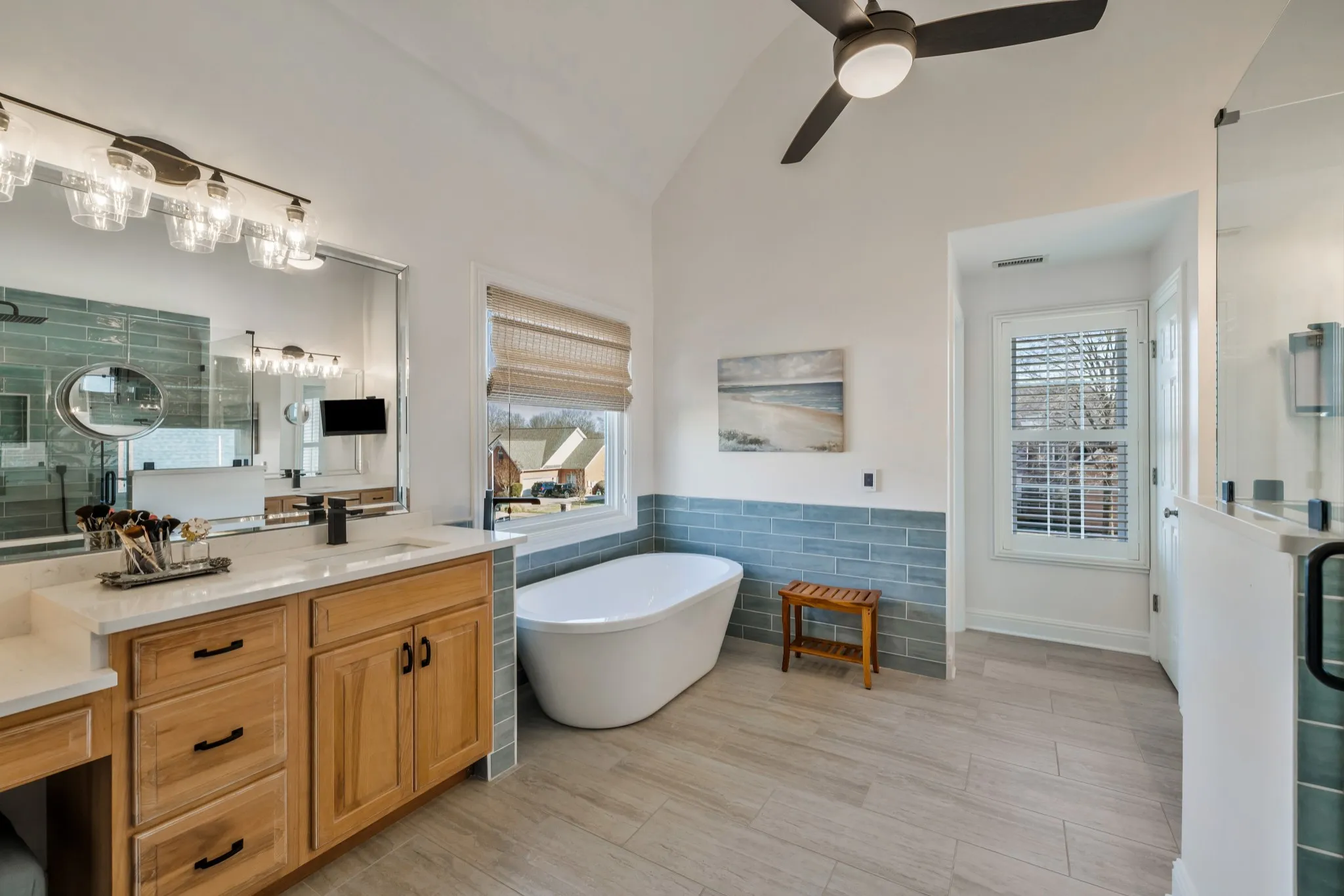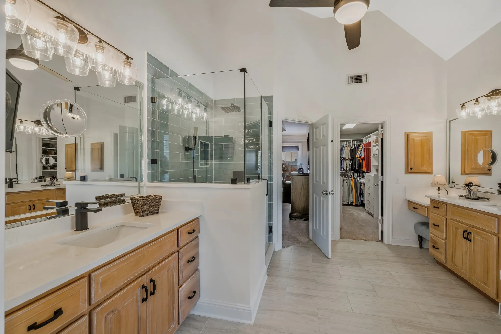 The kitchen offers Corian countertops, stainless steel appliances, and a pantry with built-in shelving. The primary suite is a true retreat, featuring a tray ceiling and a remodeled bath with two-story ceilings, heated tile floors, soaking tub, and large walk-in shower, along with a custom California-style closet.\n