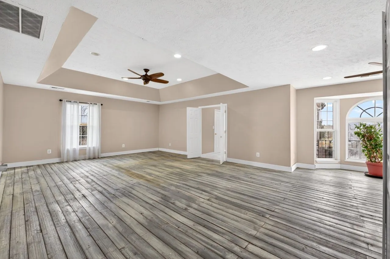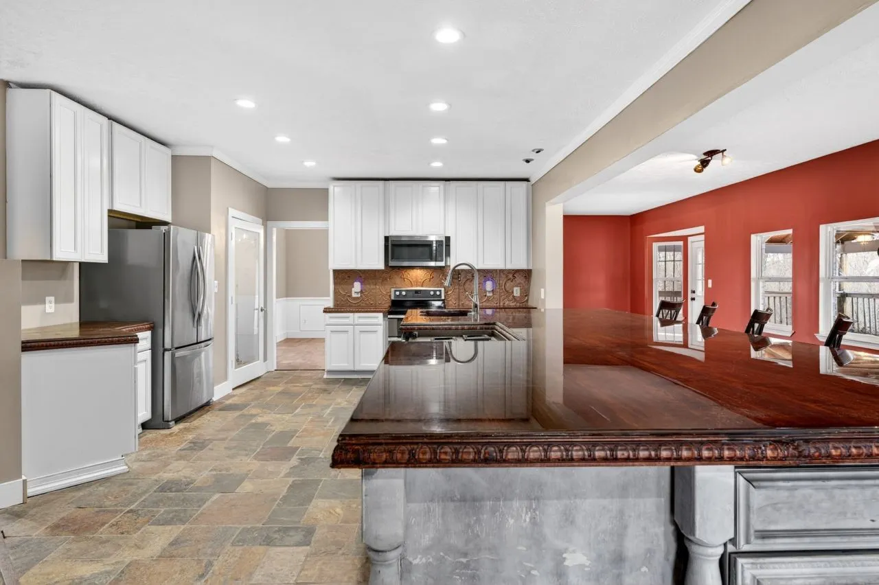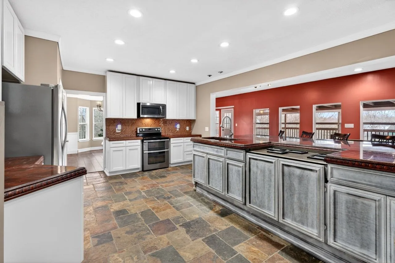 FABULOUS property on over 5 acres!!! Almost 10,000 square feet under roof, some footage not counted as finished space during time of purchase. Full basement in main house, Apartment/In Law quarters over the 4 gar Garage…these 2 areas are not counted in current footage, but have been utilized as such easily……Front Entry leads to refinished staircase to Upper Level. Adjacent to the Entry is the Sitting Room/Living Room with hardwood laminate flooring & bay window. Formal Dining Room is located through the Sitting Room, and has trey ceiling with crown moldings, and a side bay area. Kitchen has had renovation with slate tile flooring, and absolutely huge island with oak/mahogany stain. Also offered is a walk-in pantry, recessed lighting, double sink….Separate Office with french door system and built-ins. Remodeled 1/2 Bathroom and Laundry Room are also convenient to the Kitchen and open Den/Family Room. Den is cozy with a wood stove and ceiling fan, and has direct access to the Basement level, back staircase to Upper Level, and back access to the covered decks. An additional room adjacent to Den is an oversized Main Level Bonus/Gathering Room, can accommodate large gatherings. Upper Level features 4 Bedrooms, one of which is the Primary bedroom. Primary is huge and has hardwood plank flooring, recessed lighting, trey ceiling, and En Suite Bathroom. Primary Bathroom with double vanities, jetted tub, and separate shower. Basement Level has Theatre Room, Game Room, Storage Room, and Full Bathroom. Back decking adjoins with Apartment above a 4 car detached Garage, with Apartment which including a Full Bathroom and Kitchen/open to Living area. This all sits on 5.26 acres, with amenities that include 2 Barns, fenced Garden with drip irrigation, Fruit trees (peach, pear, fig, plum), compost areas, Greenhouse, chicken house, and is fenced from all neighboring properties. A lot of property and footage for the money, selling as-is, and is priced under value accordingly.