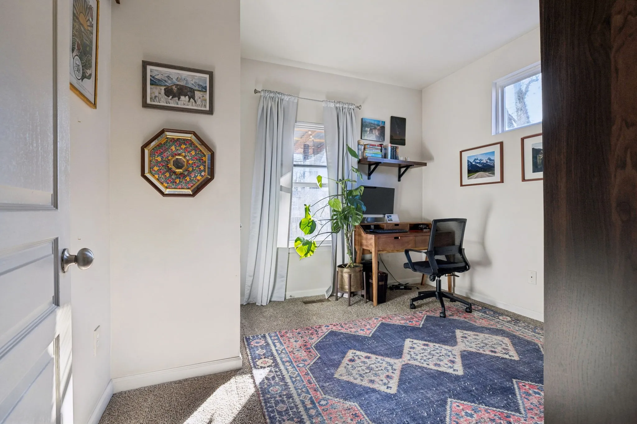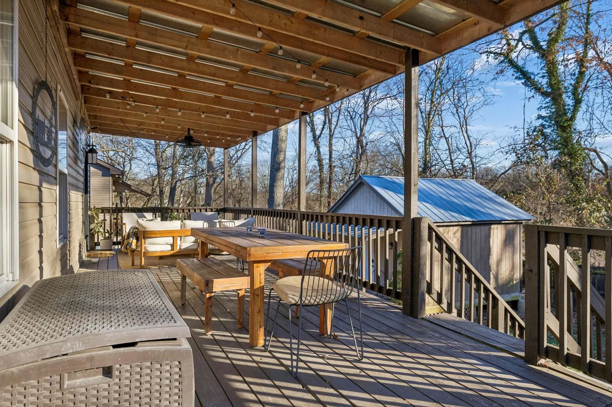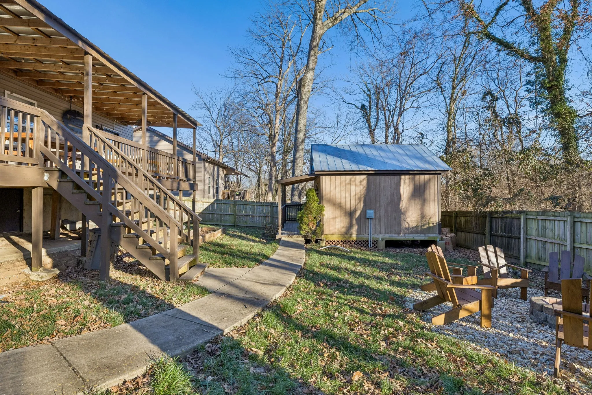Outside, there’s an oversized covered deck overlooking a fenced-in yard with mature trees and a fire pit, perfect for relaxing and ideal for entertaining. The detached shed was previously used as a music and recording studio. Now, it offers versatility. You can use it for storage or convert it into a functional living or creative space.