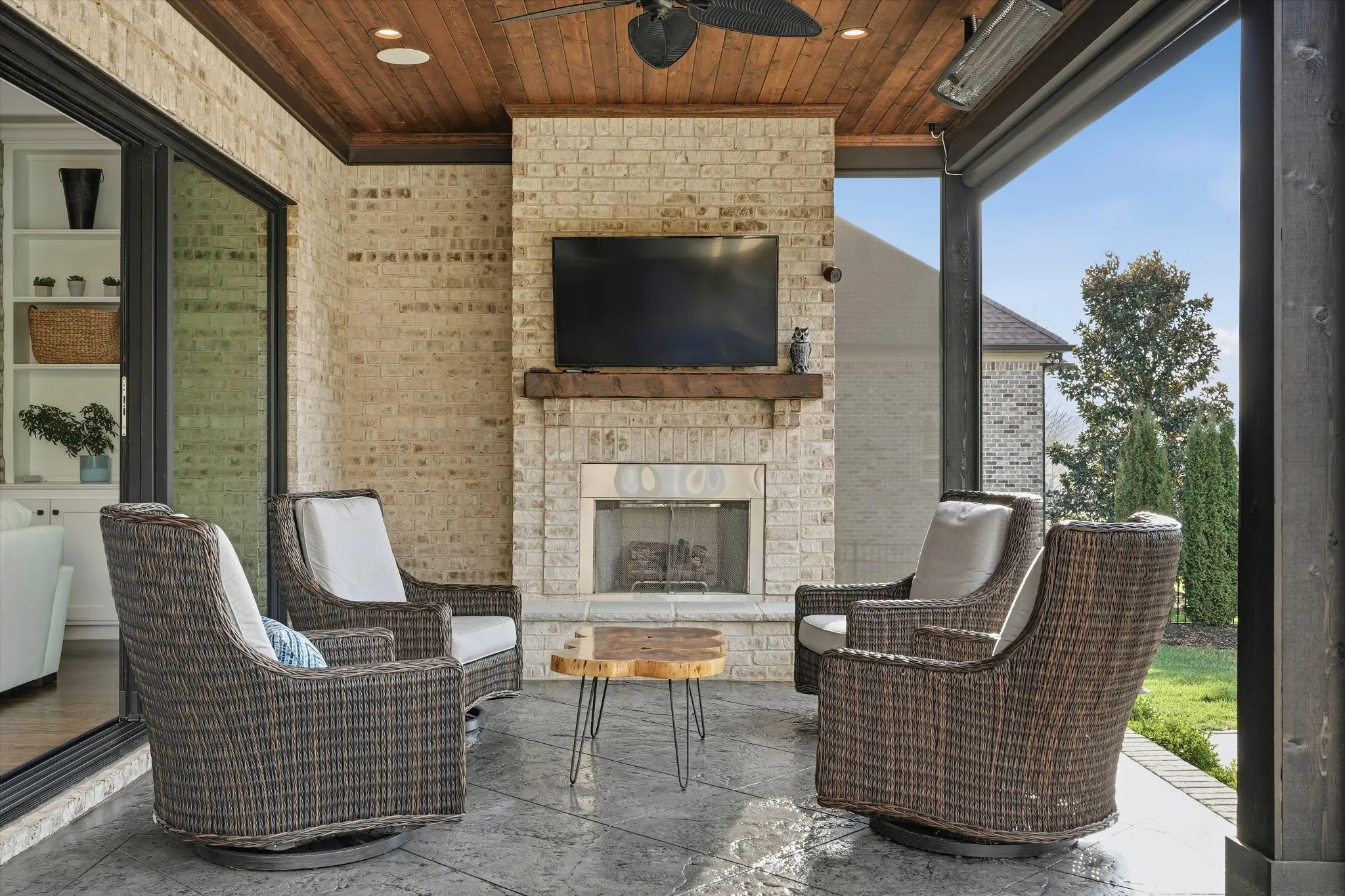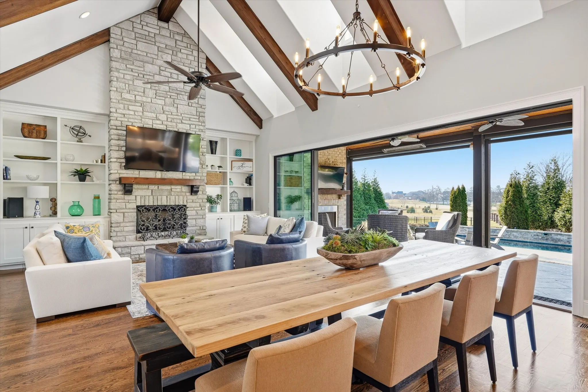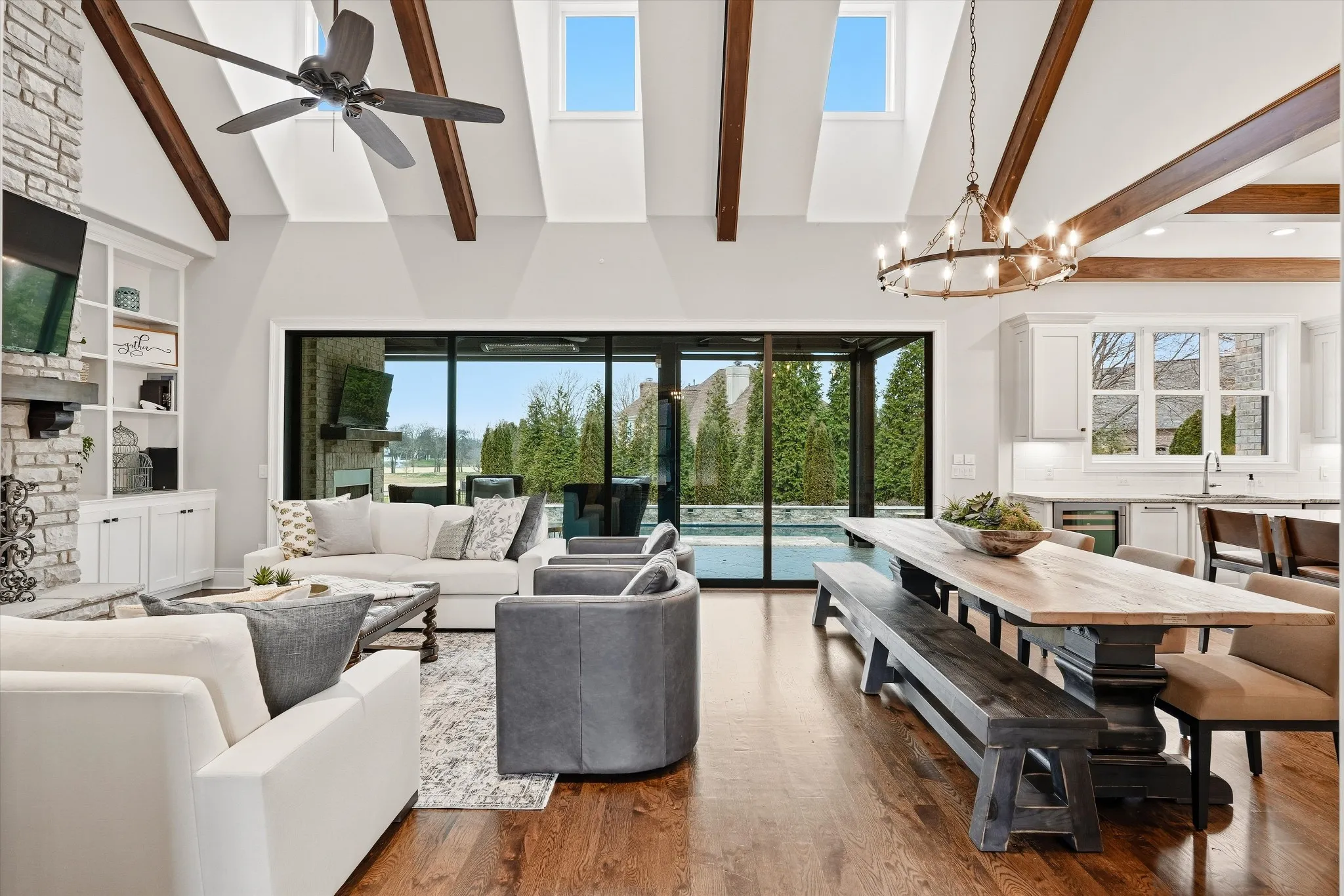 The home features a heated saltwater pool, covered patio with electric screens and Bromic heaters, and a sliding window wall for seamless indoor-outdoor living. Inside, enjoy 18-foot ceilings, exposed beams, and a thoughtfully designed open floor plan. The luxury kitchen is outfitted with Thermador appliances and refined custom details, including a discreet coffee garage.