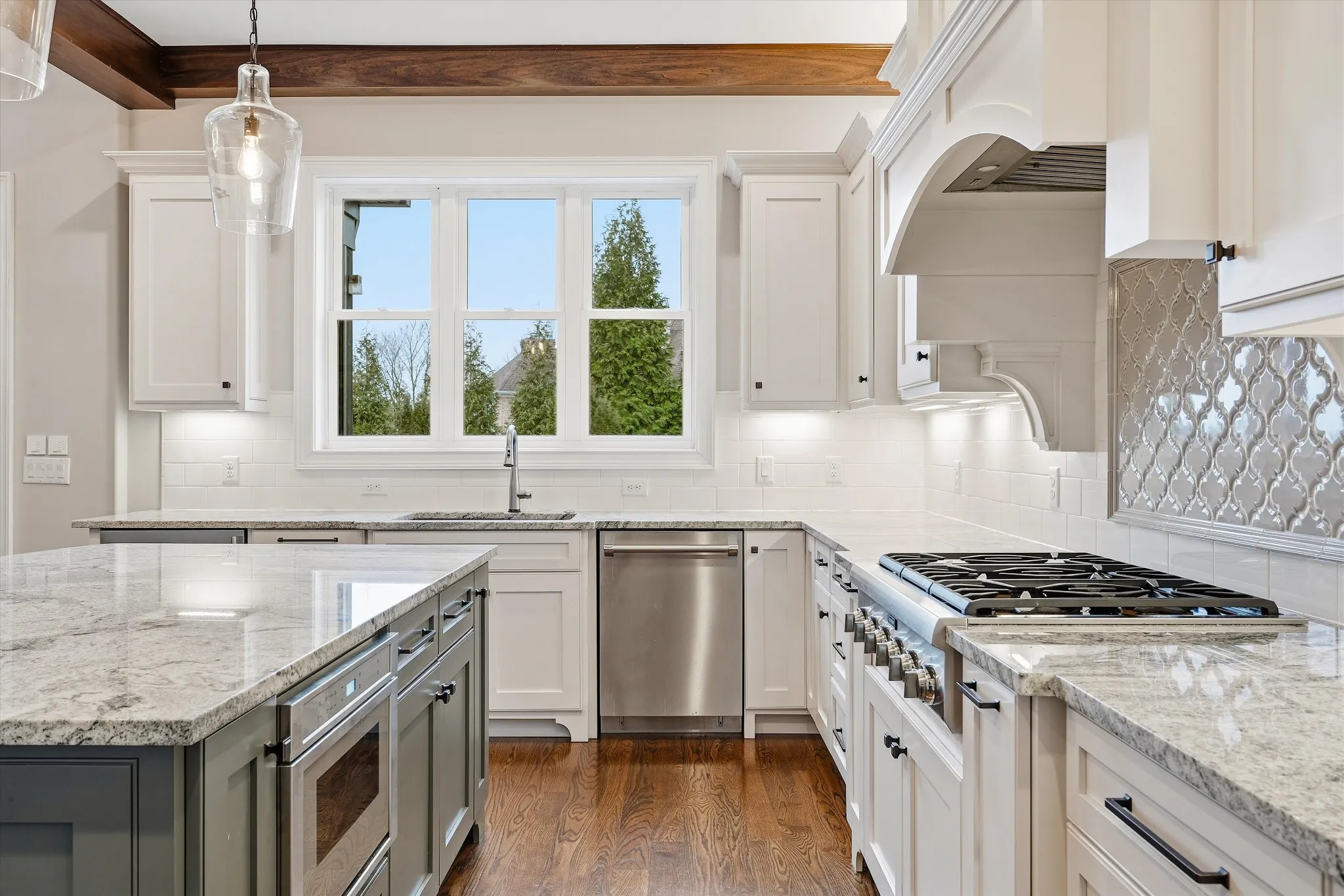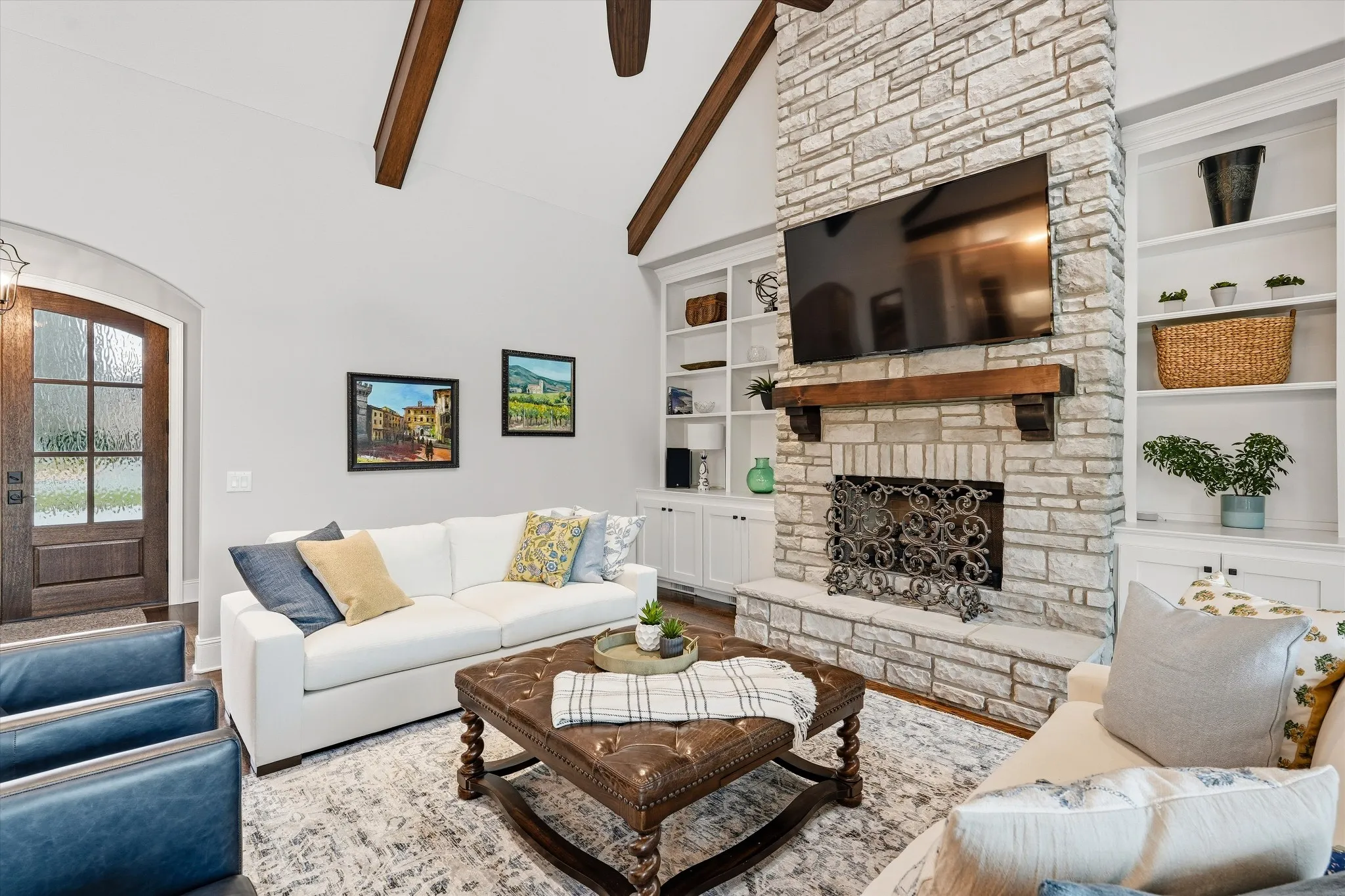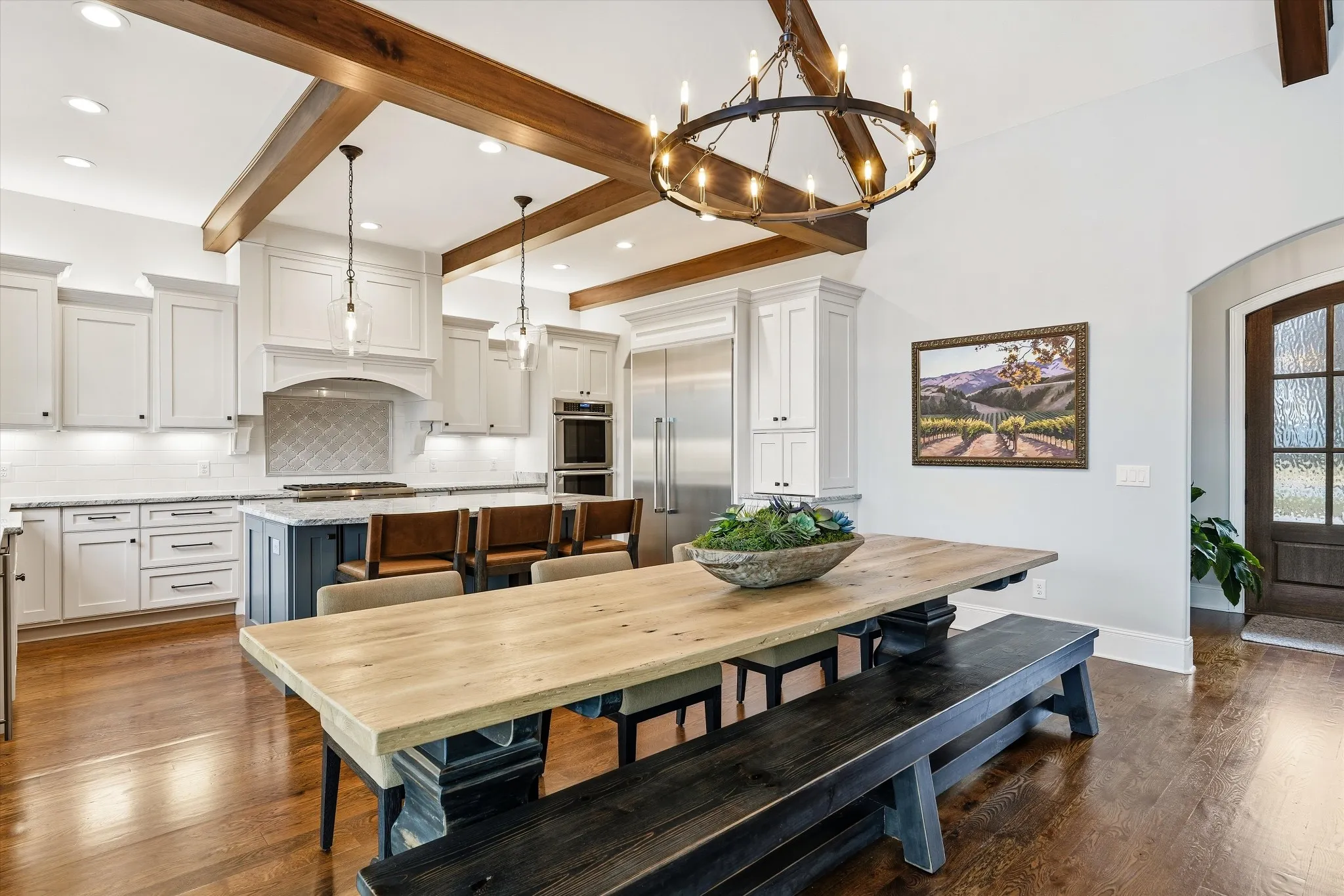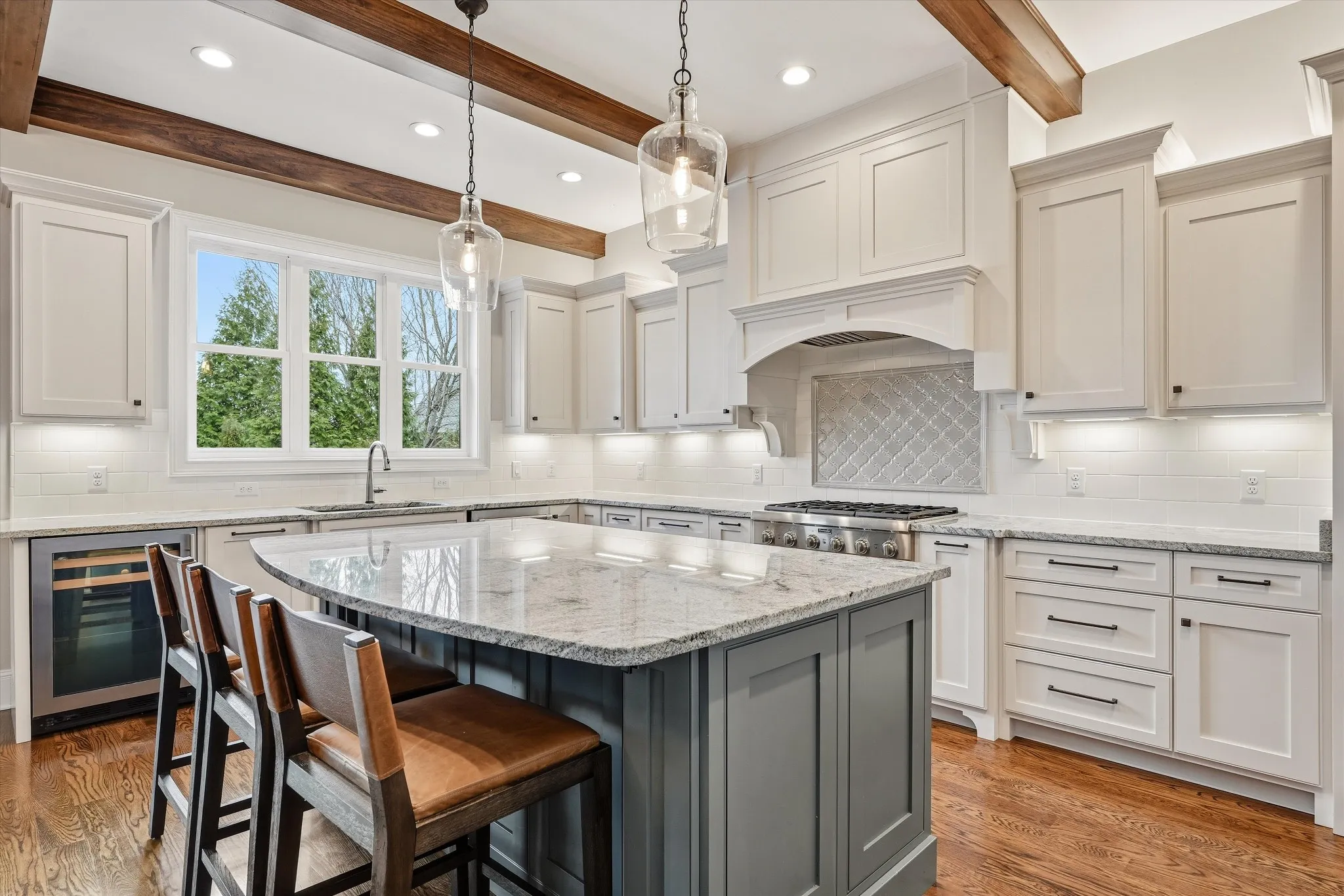 The home features a heated saltwater pool, covered patio with electric screens and Bromic heaters, and a sliding window wall for seamless indoor-outdoor living. Inside, enjoy 18-foot ceilings, exposed beams, and a thoughtfully designed open floor plan. The luxury kitchen is outfitted with Thermador appliances and refined custom details, including a discreet coffee garage.