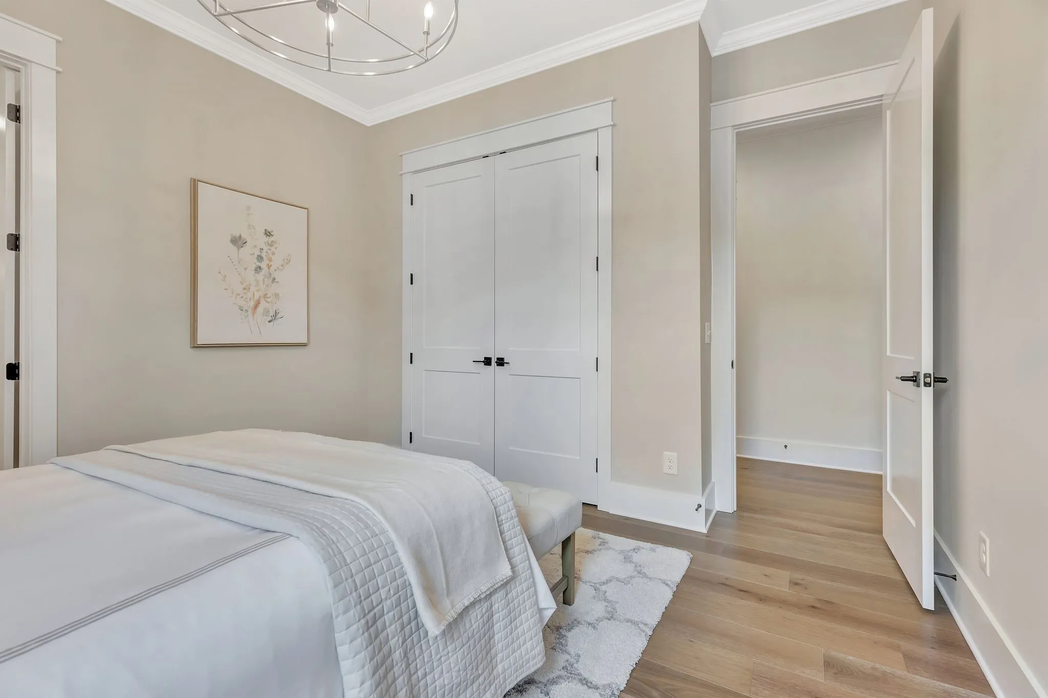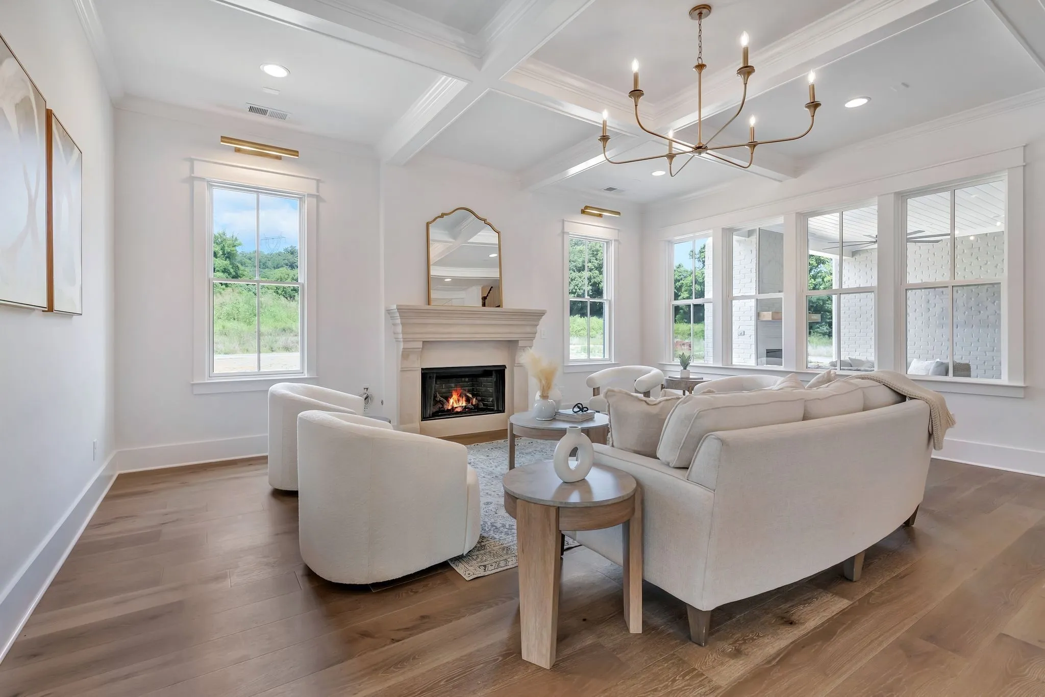 The heart of the home is the great room, featuring a striking coffered ceiling and elegant fireplace. The adjacent chef’s kitchen boasts a 10-foot island with hidden rear cabinetry, ceiling-height custom cabinets, luxurious Viking appliances, two-toned finishes, and abundant natural light—making it both functional and beautiful.