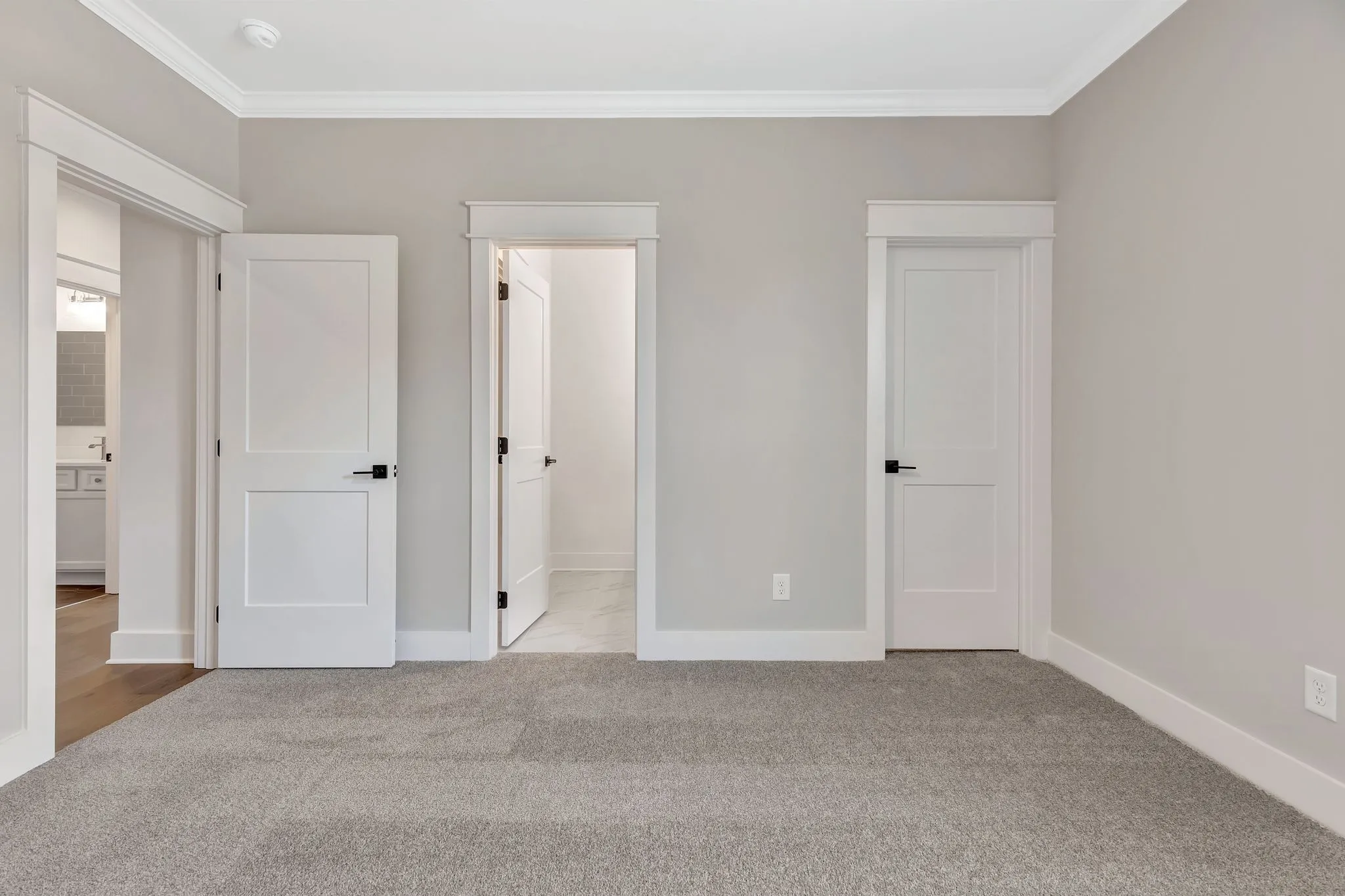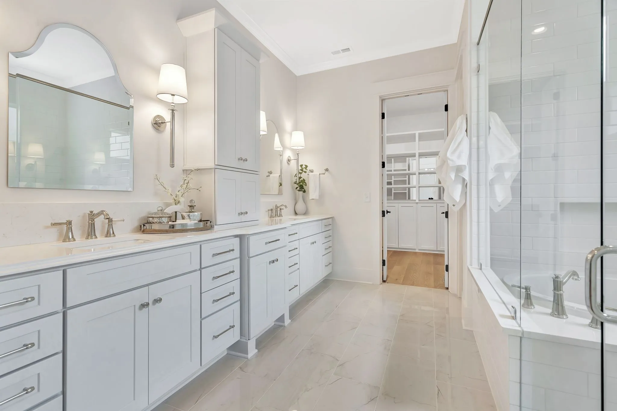 The primary suite offers a relaxing retreat with a cathedral ceiling, double vanities with a linen tower, a freestanding soaking tub, and a separate walk-in shower. The spacious walk-in closet ensures plenty of storage. Each secondary bedroom includes its own en suite bath for ultimate privacy and convenience.