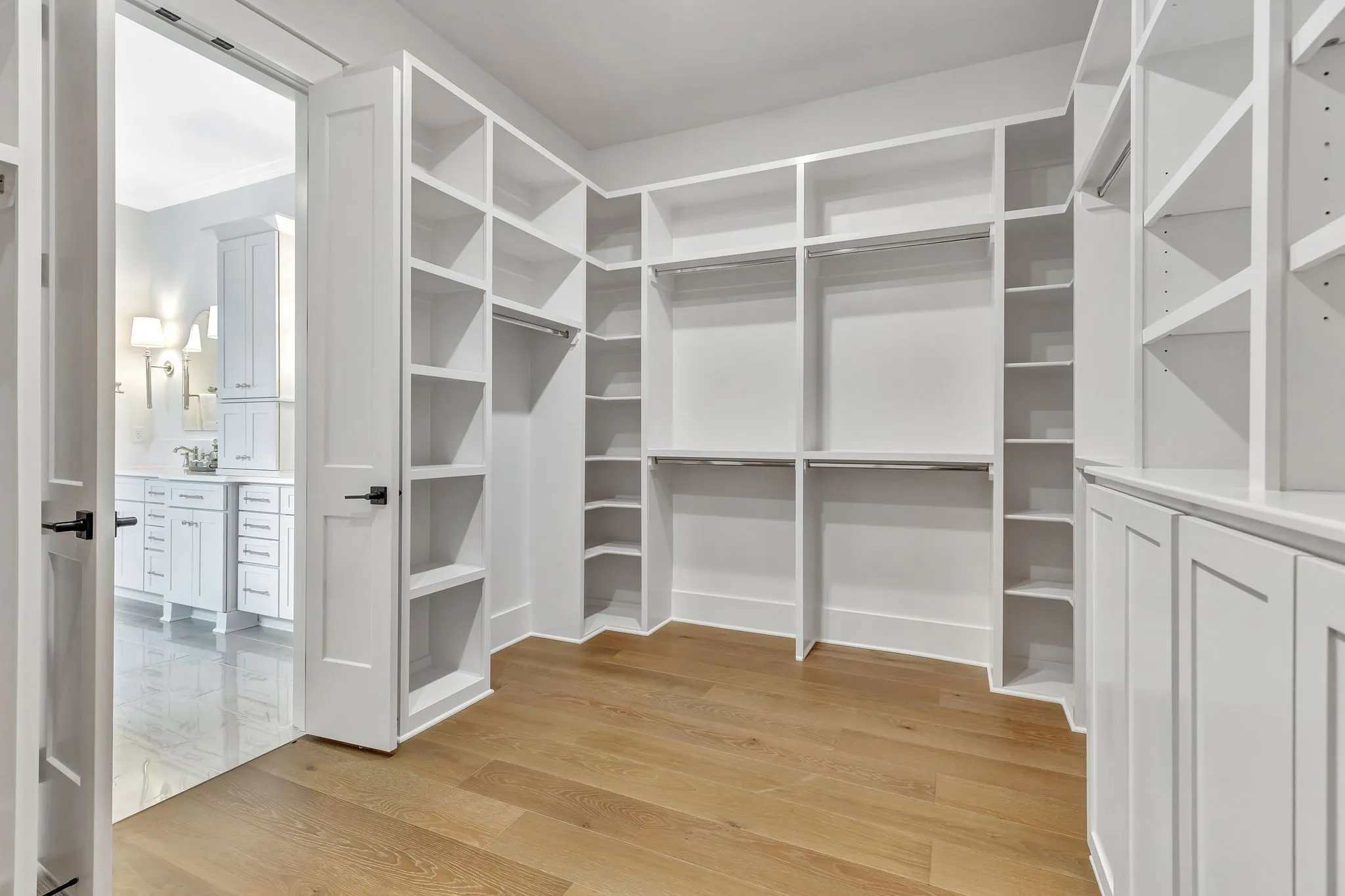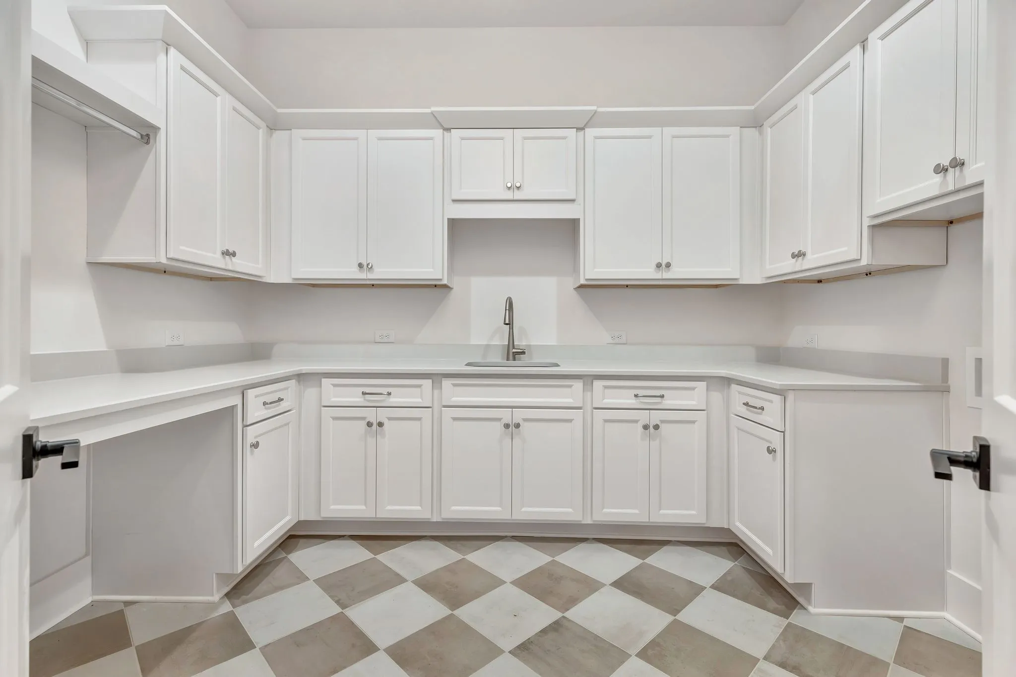 A true showstopper, the walk-in pantry includes a built-in beverage center, quartz countertops, and additional cabinetry for seamless organization and storage.