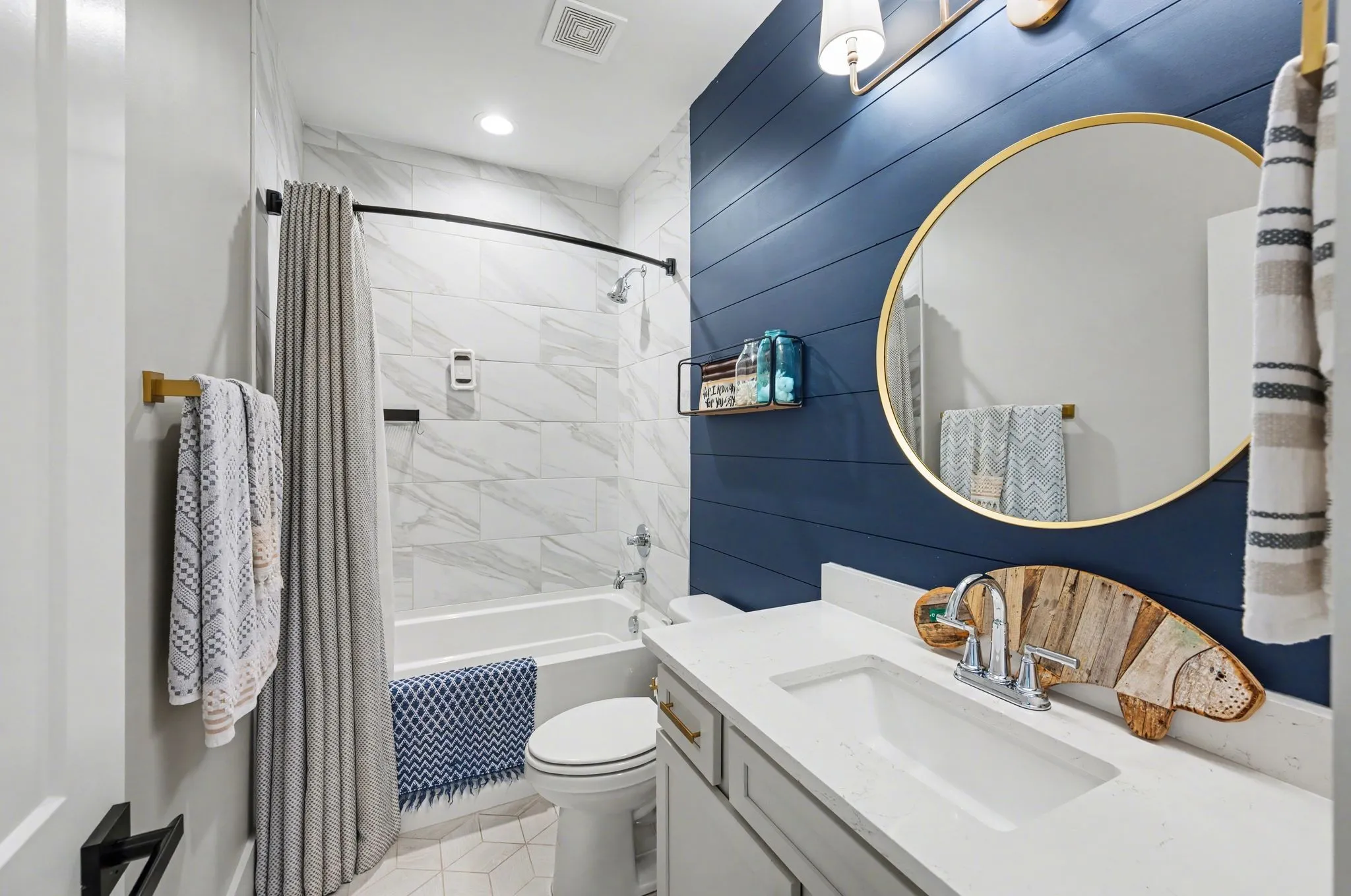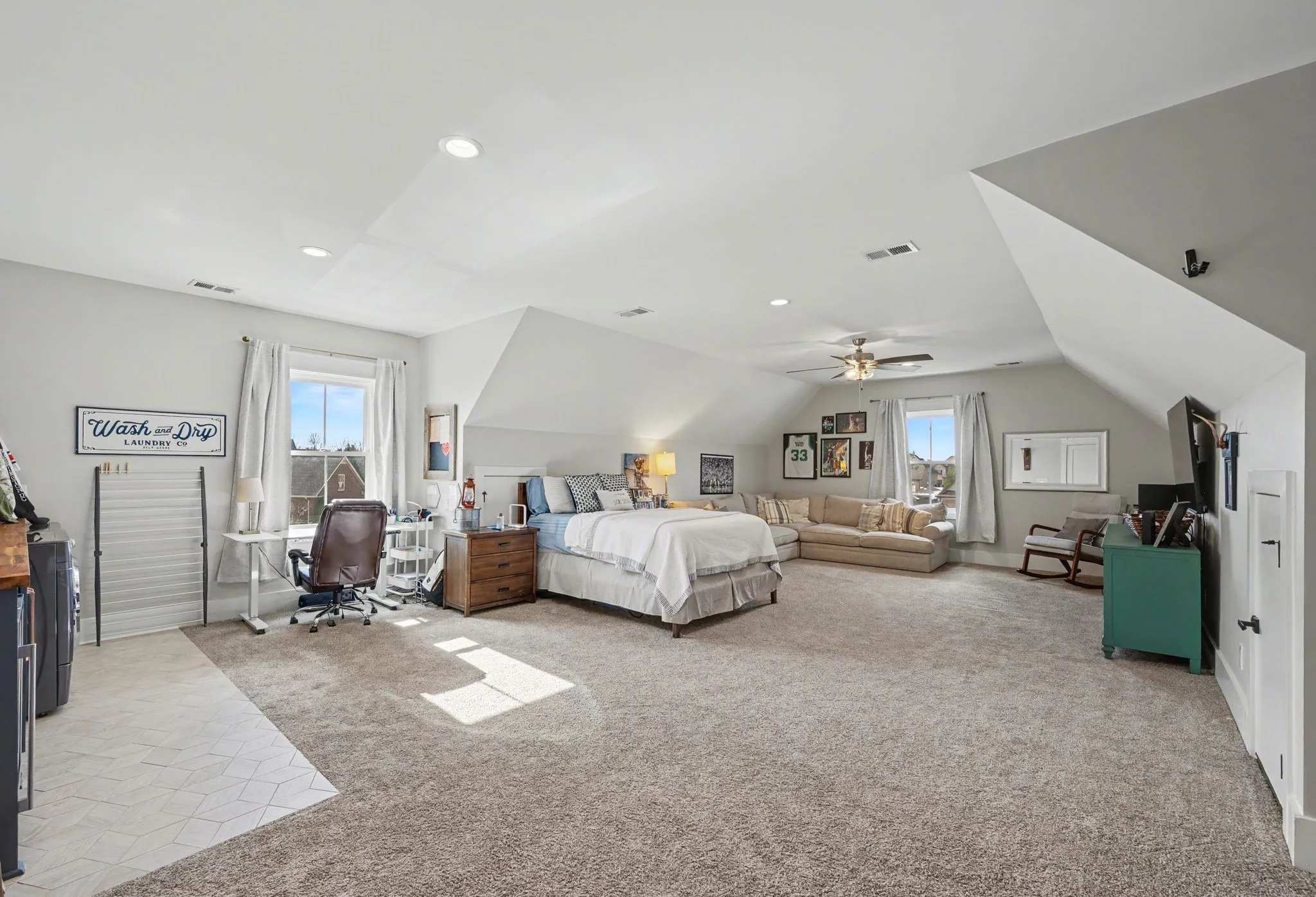 Upstairs offers three additional bedrooms, two full baths, a secondary laundry space, and an expansive bonus room currently used as a bedroom. All bathrooms feature tiled showers and floors with quartz counters, enhanced by upgraded lighting and plumbing fixtures. The large rear ensuite bedroom could easily serve as a second primary suite and includes abundant floored walk-out attic storage.