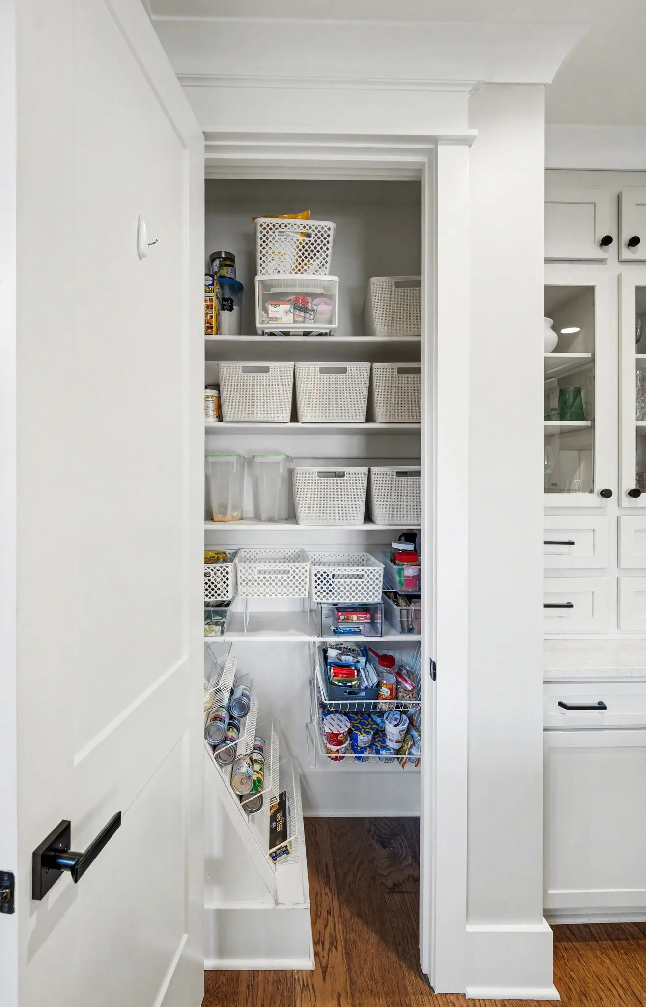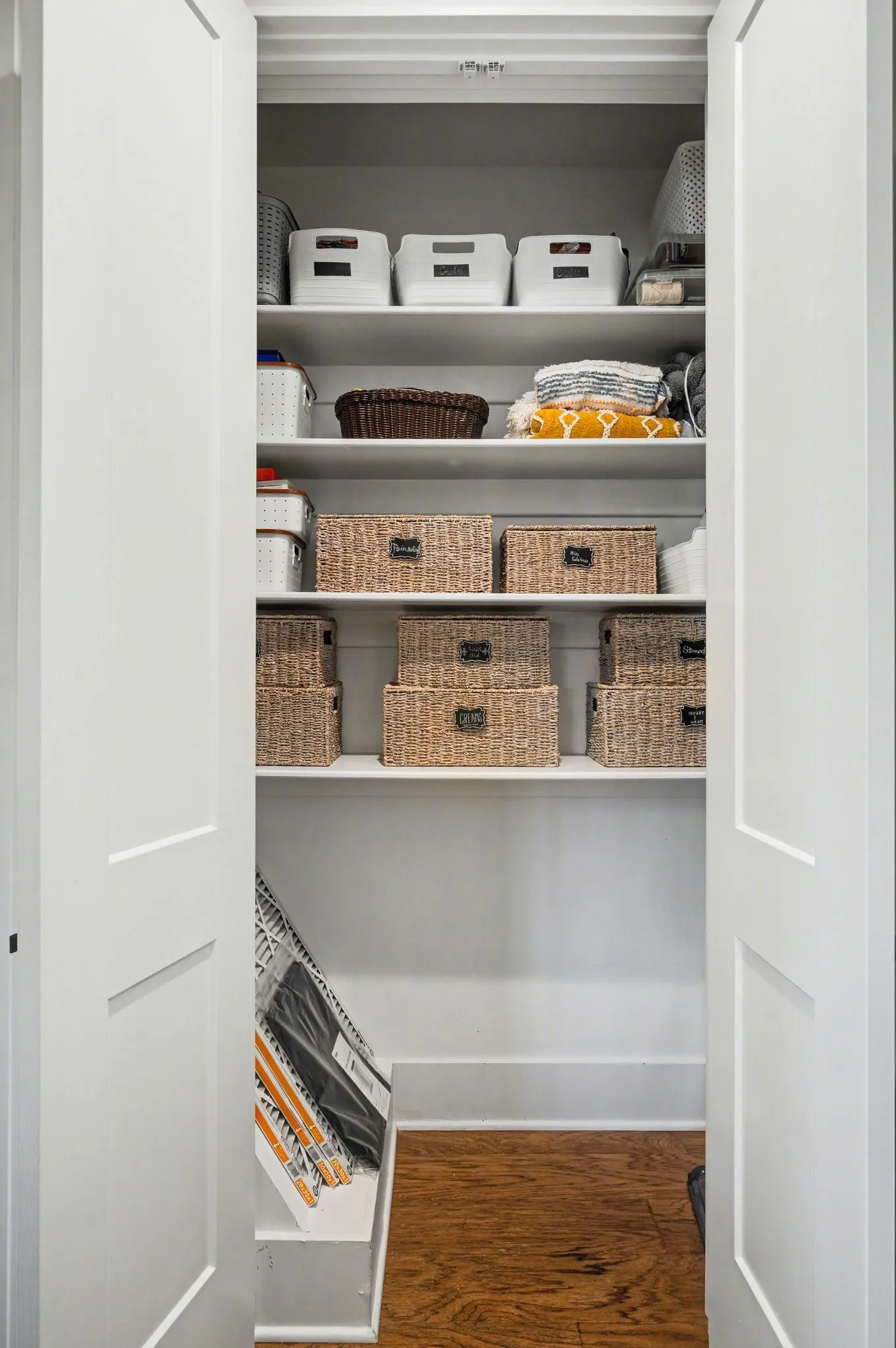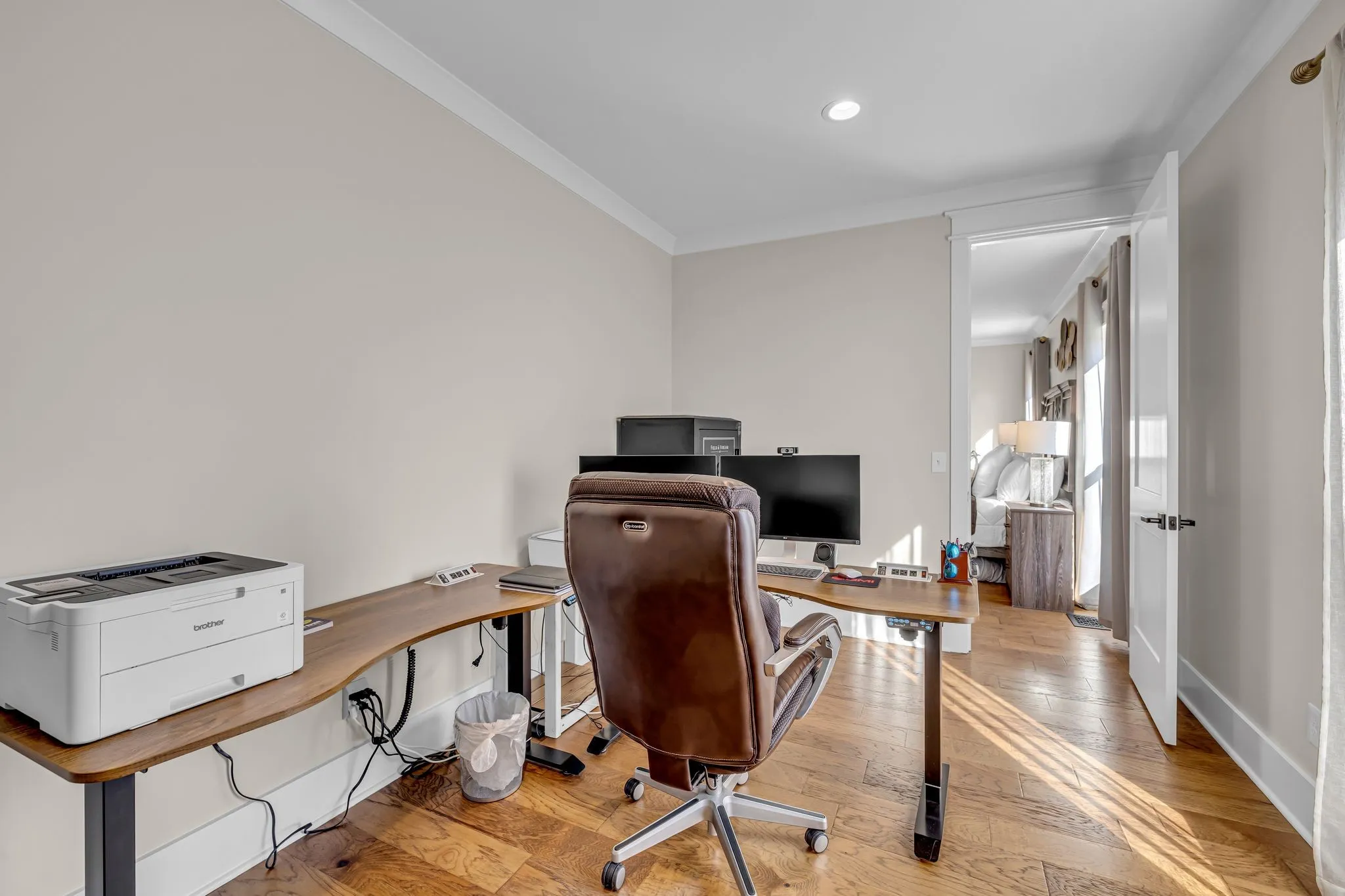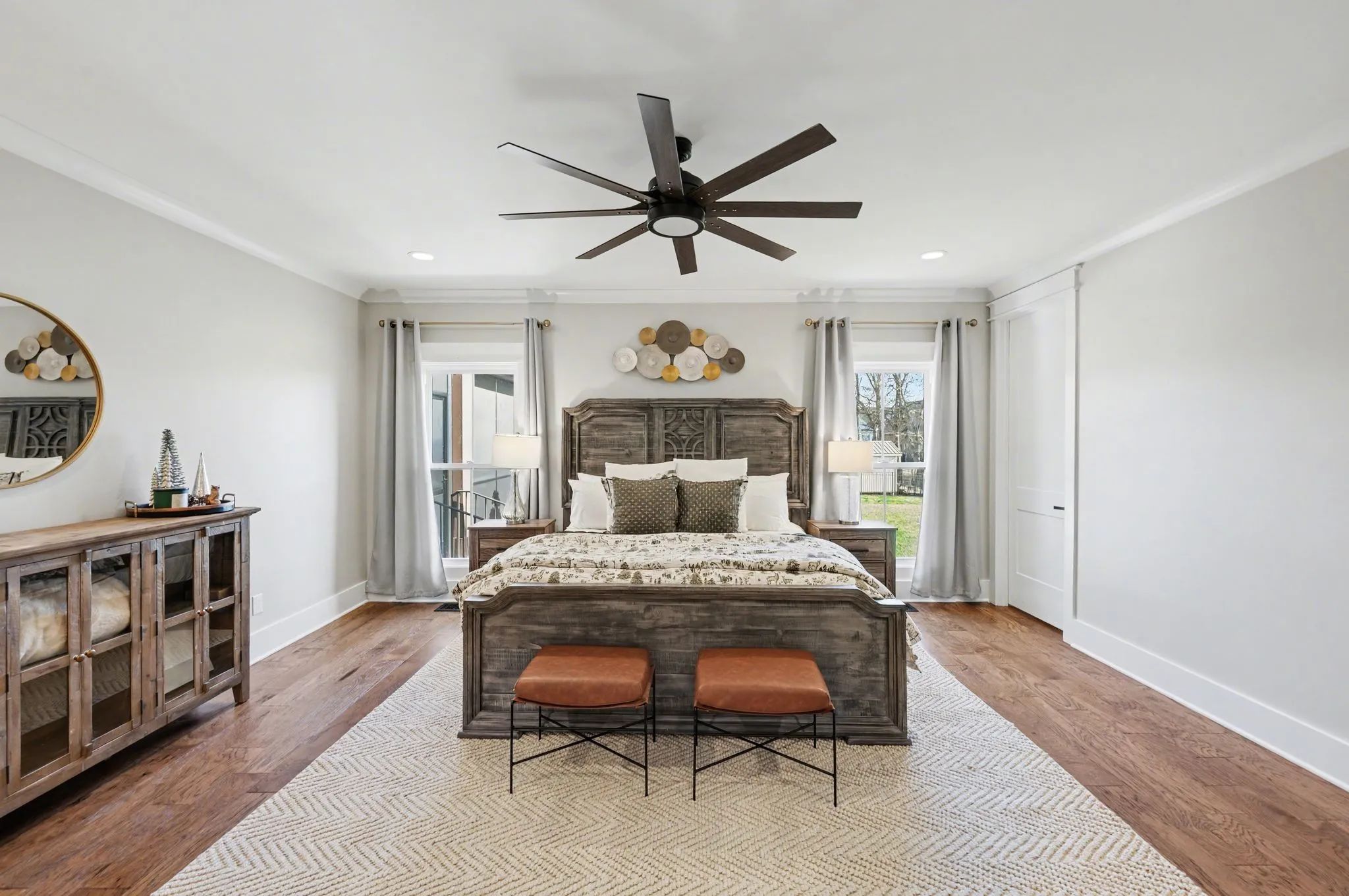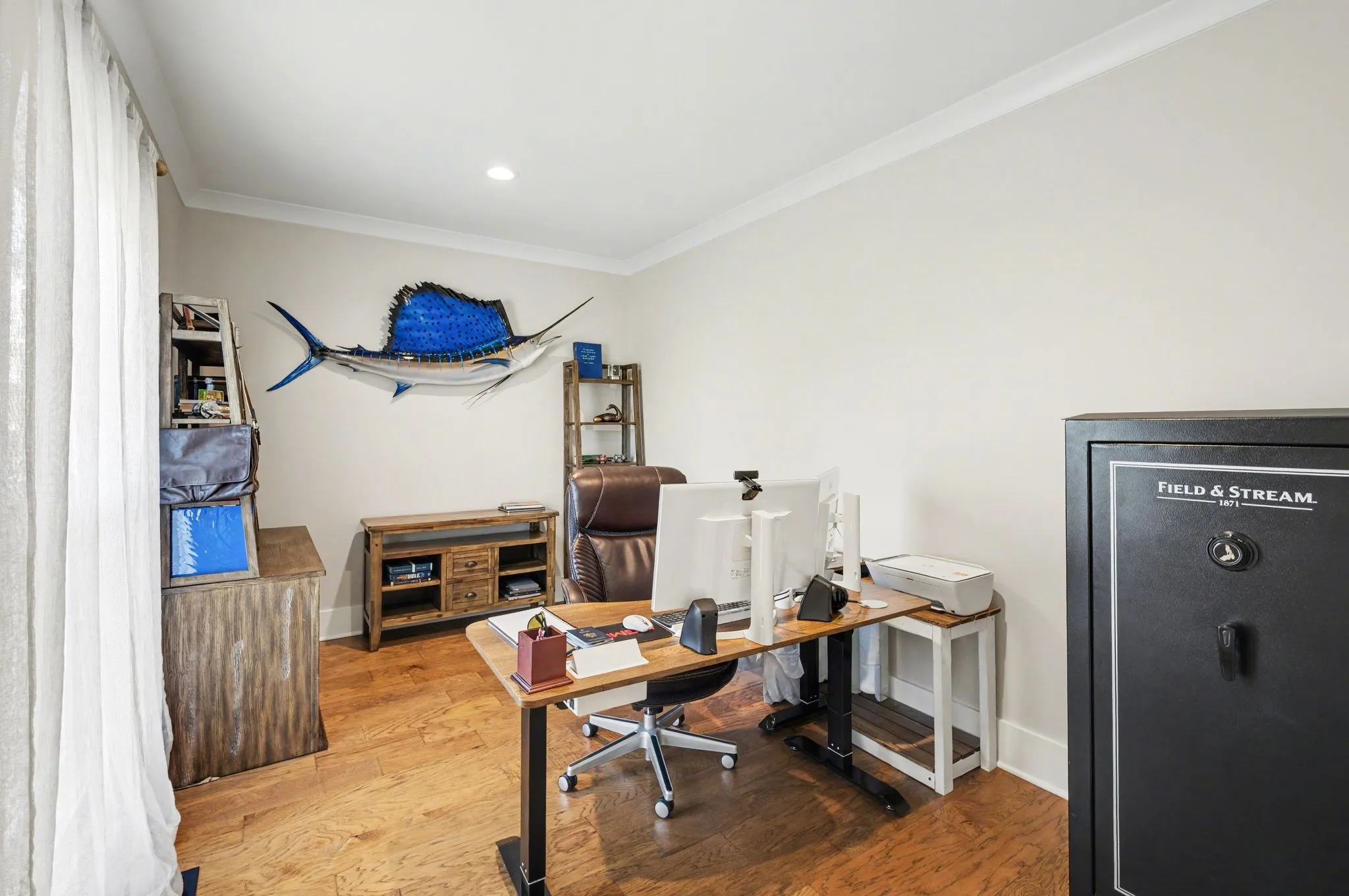 The primary suite is a private retreat with an adjoining flex space ideal for a home office, nursery, reading nook, or exercise room. Your bathroom will feel like a trip to the spa and the spacious walk in closet is outfitted for maximum storage and organization. Hardwood floors run throughout the main level, as well as the stair treads, catwalk, and hallways.