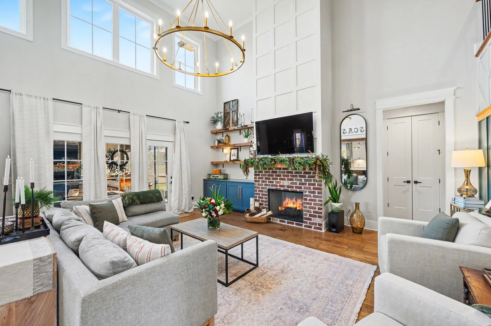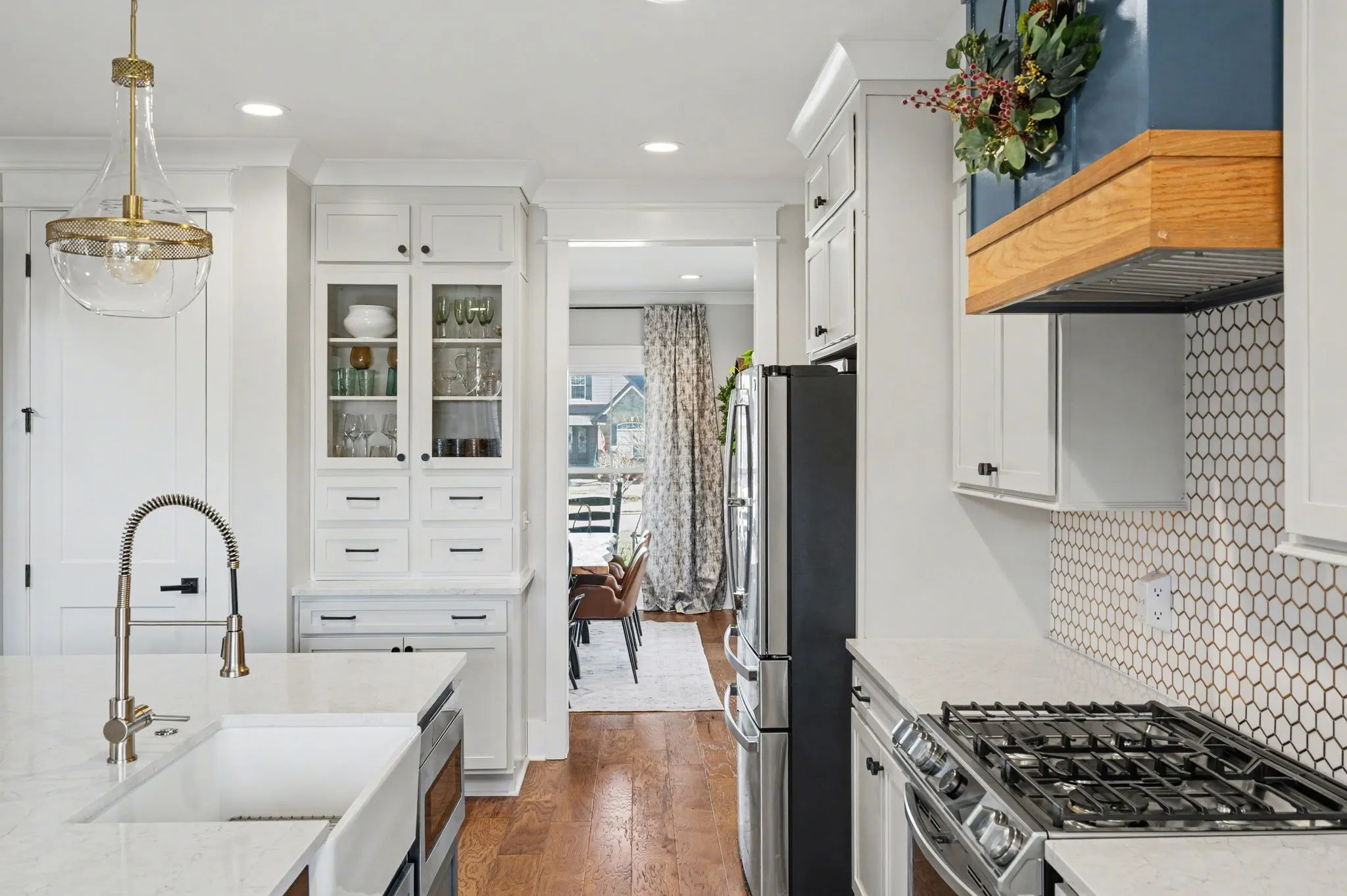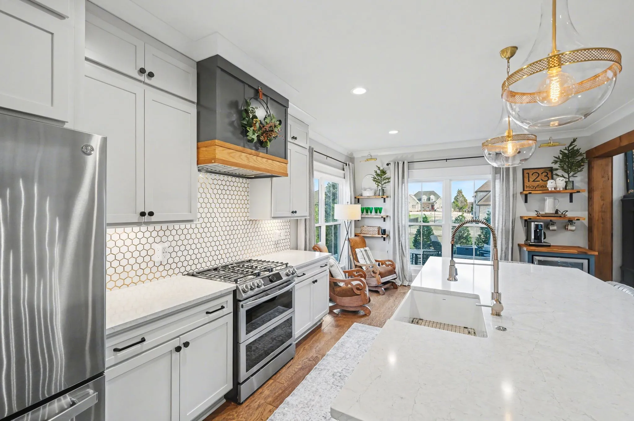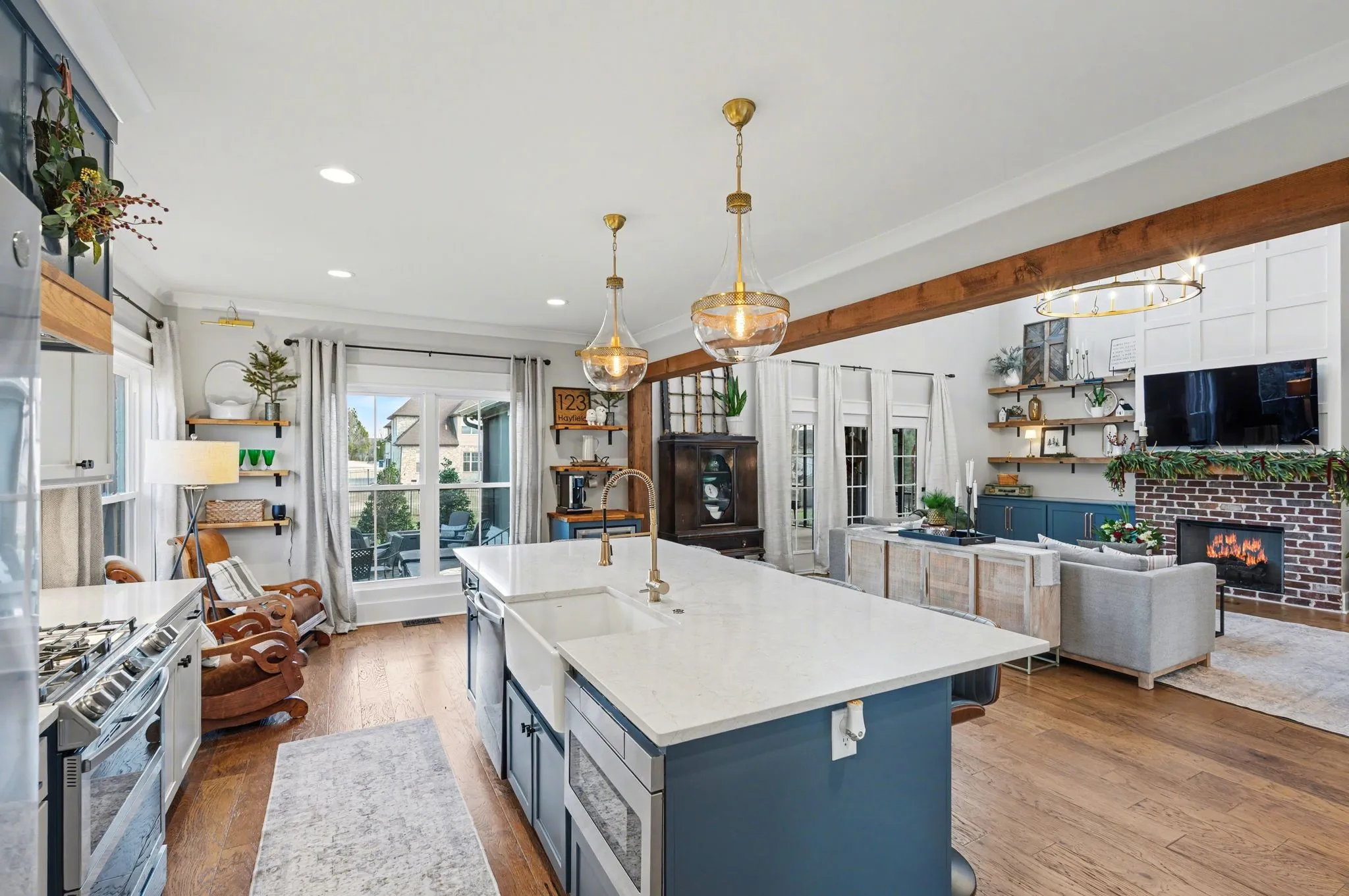 The open kitchen boasts quartz countertops, farmhouse sink, a large island with cabinet storage access on both sides. Additional highlights include a coffee station with beverage cooler, coffee nook, under-counter microwave, double ovens, and a gas cooktop. A stunning cased opening frames the living room, creating an open yet defined space perfect for entertaining or cozy evenings by the fireplace.