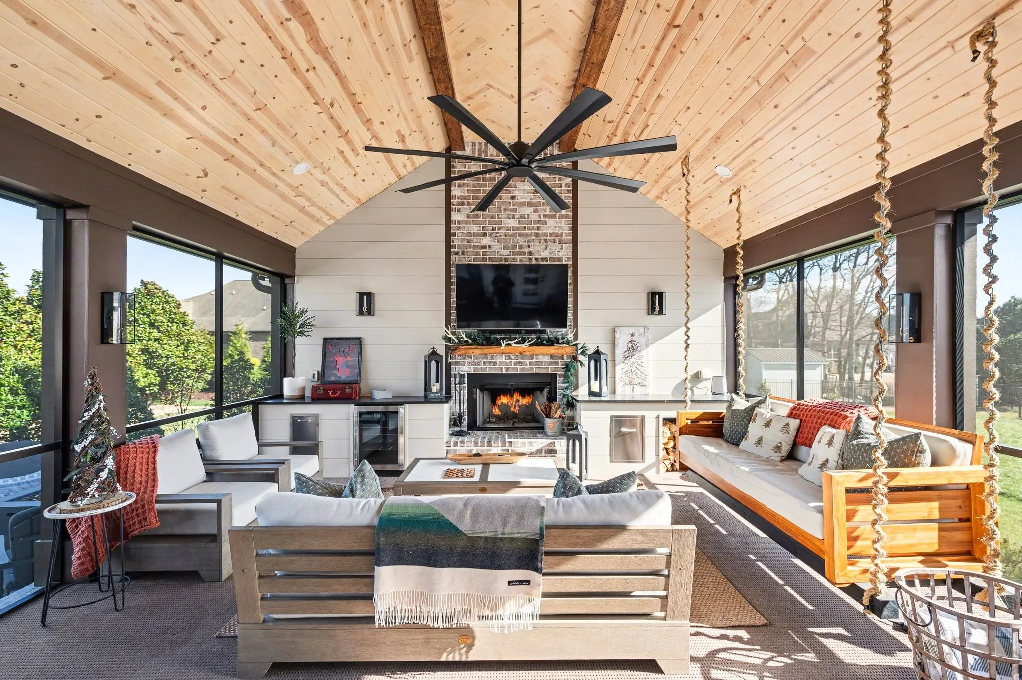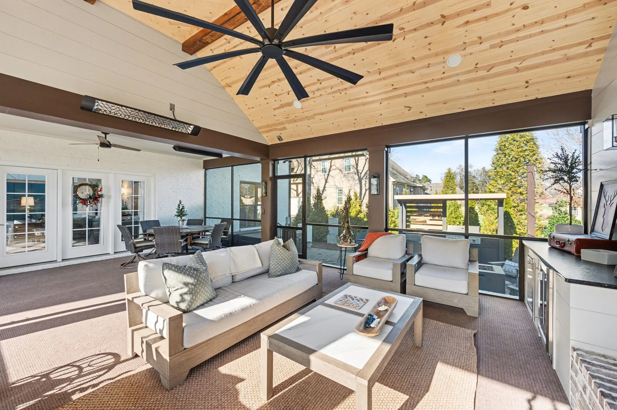Outside the 20×30 living space is exceptional, featuring a wood-burning FP with gas starter & overhead heaters for year-round enjoyment. A covered patio leads to a fully equipped outdoor kitchen with beverage cooler. The large,level lot features, low voltage landscape lighting & irrigation system.