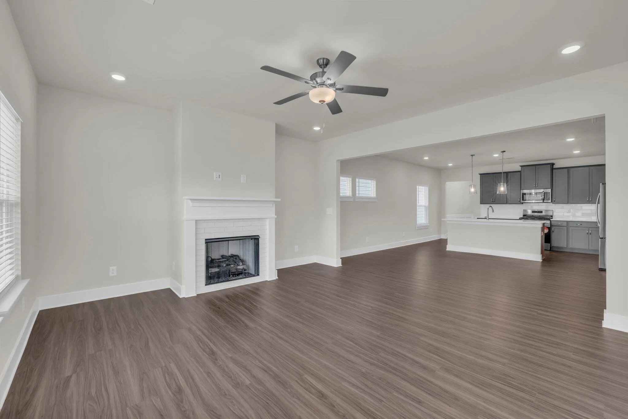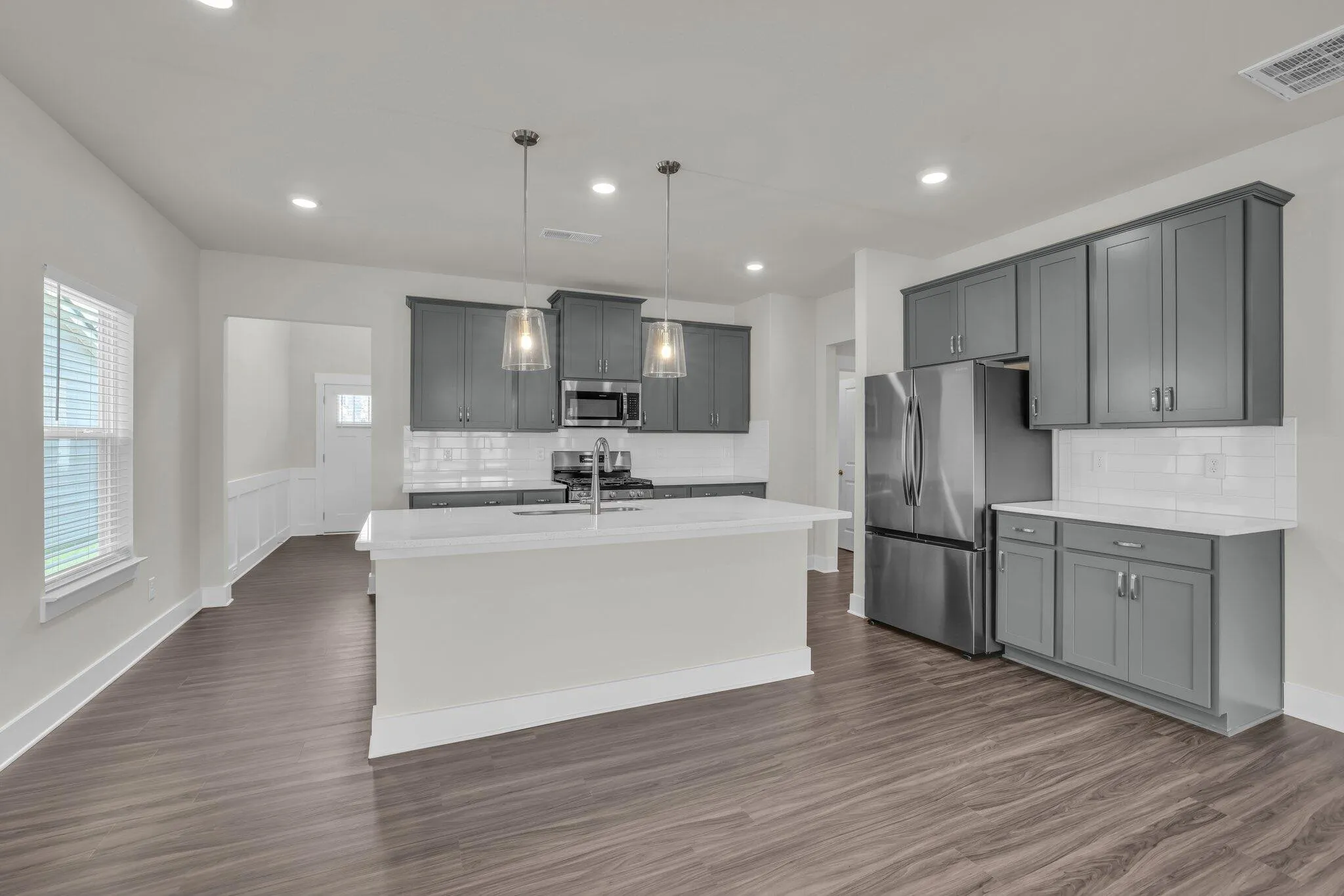 The open-concept layout is ideal for modern living and entertaining. The chef’s kitchen features quartz countertops, stainless steel appliances, a gas range, pendant lighting, and ample counter space, making it a true centerpiece of the home. Brand-new refrigerator, washer, and dryer are included, so you can move in with ease.