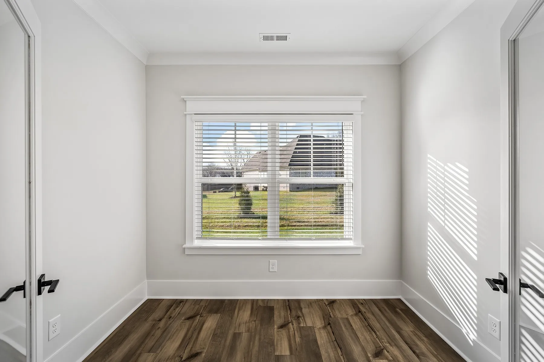 Beautiful 3BR/2BA single-story home with flex room and tons of upgrades! No carpet—LVP flooring throughout. Gourmet kitchen features KitchenAid stainless appliances, soft-close cabinets, tile backsplash, under-cabinet lighting, and a large walk-in pantry. Vaulted ceilings, crown molding, matte black hardware, and custom trim add stylish touches. Bathrooms offer spa-like tile in shower and tub. Enjoy the oversized patio with tray ceiling and fan, plus extra backyard green space. Ceiling fans in every bedroom and blinds on all windows. Front and rear landscaping complete this move-in ready gem. Community includes walking trails and a scenic pond with fountain.