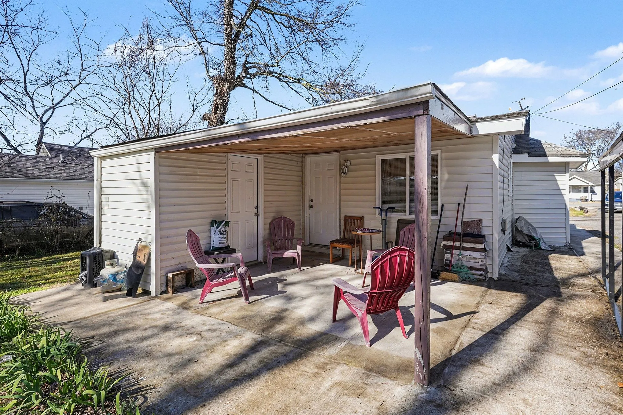 The laundry room is located outside, allowing convenient shared access. A large driveway provides ample parking, complemented by a one-car carport.