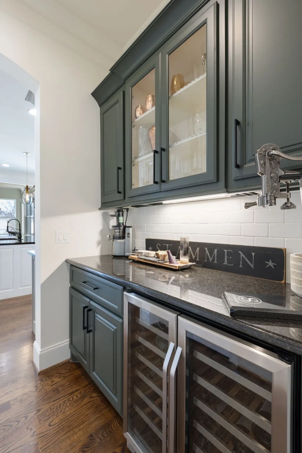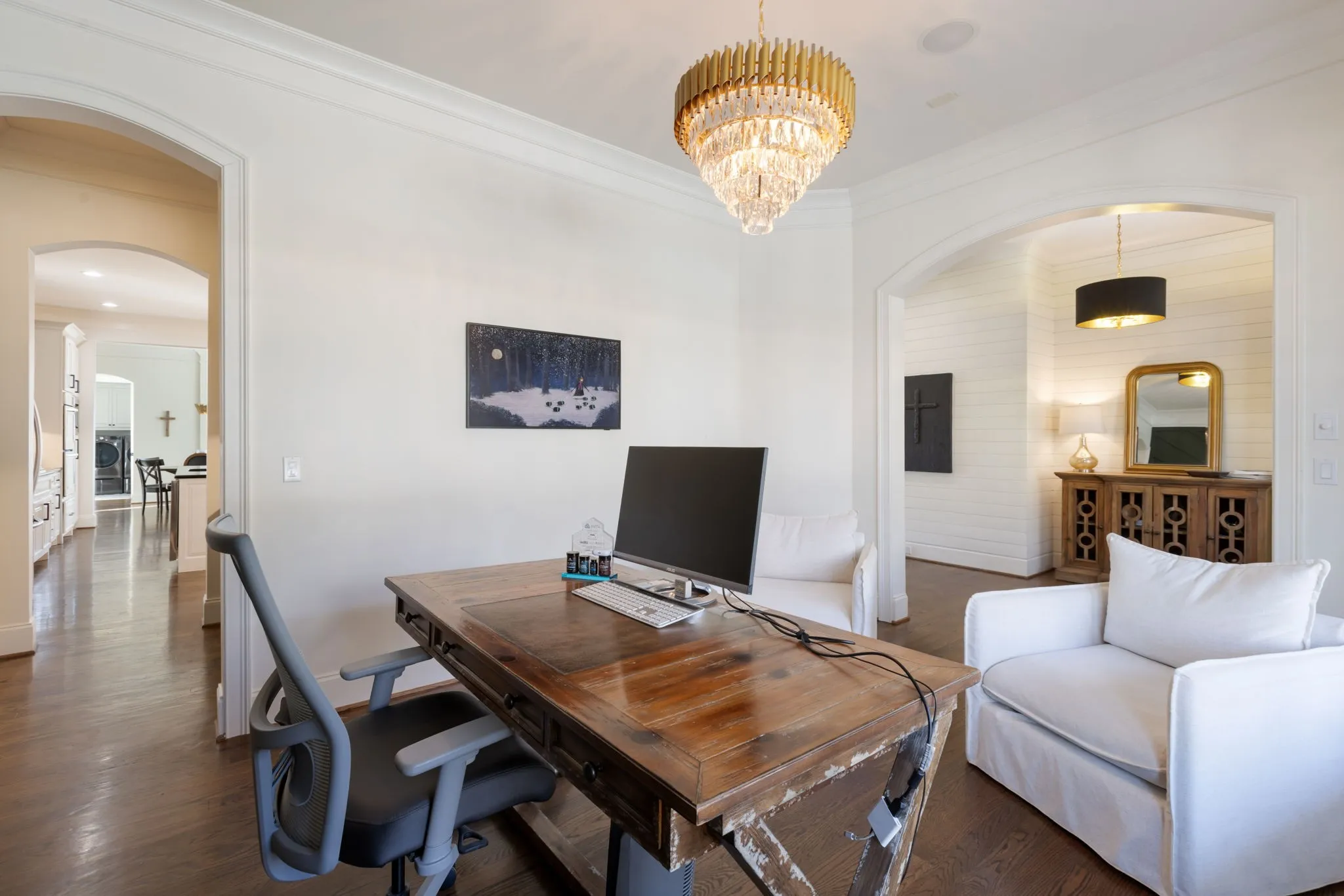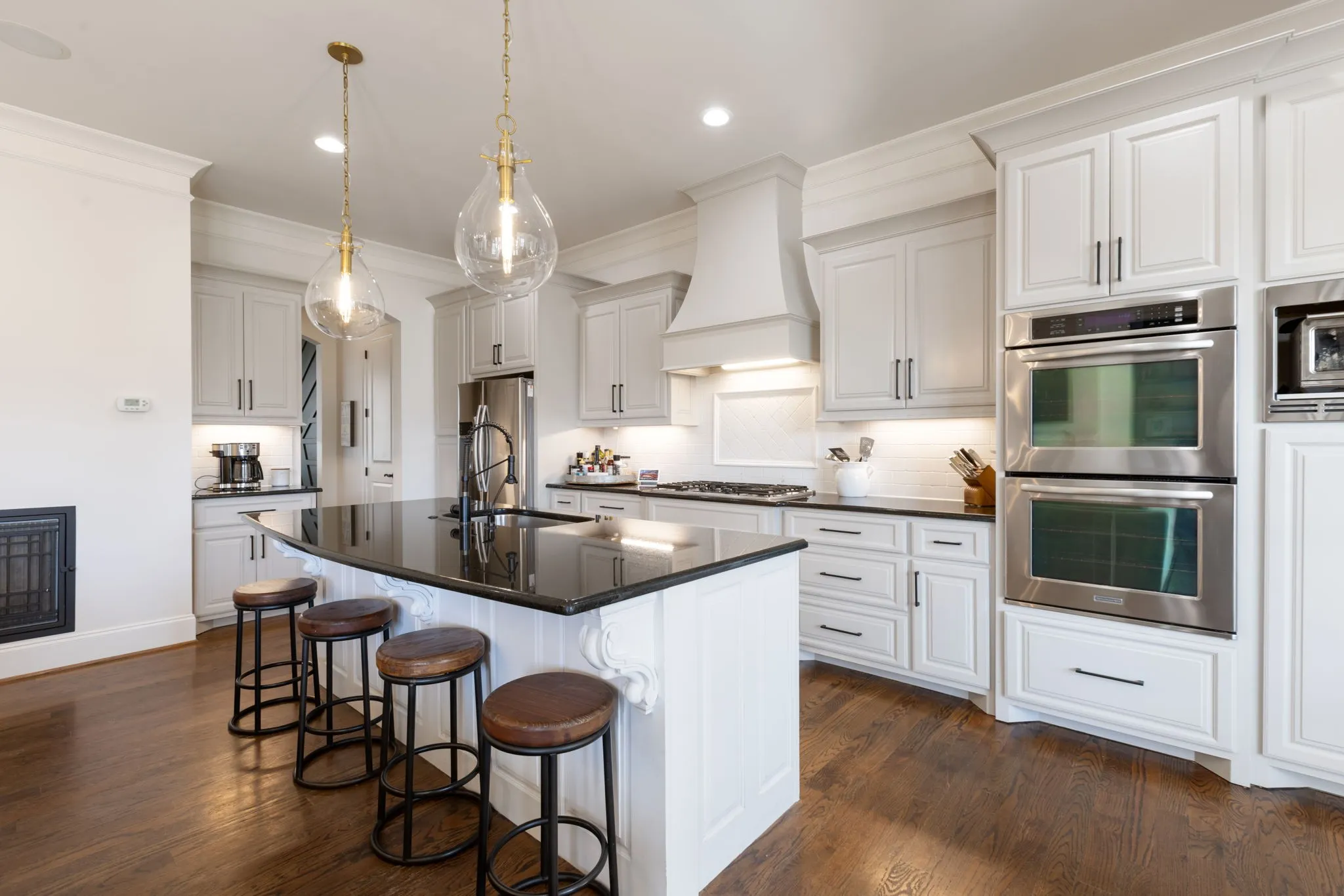 The main level features a formal dining room and an open-concept living and kitchen area overlooking the backyard—ideal for everyday living and entertaining. The kitchen is anchored by a large center island, complete with double ovens, a butler’s pantry, and abundant cabinetry. Custom wall treatments and new designer lighting enhance the home’s elevated feel throughout.