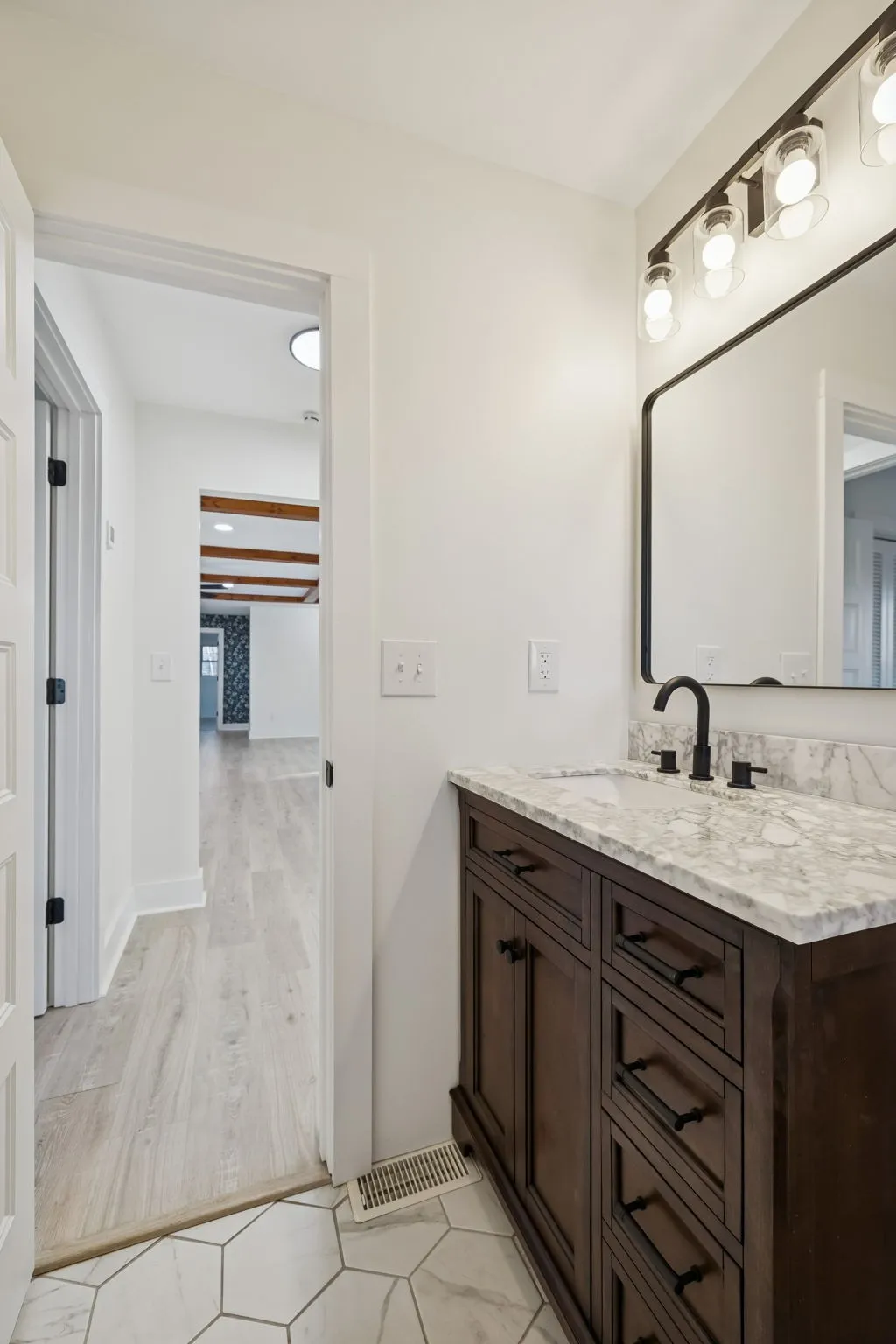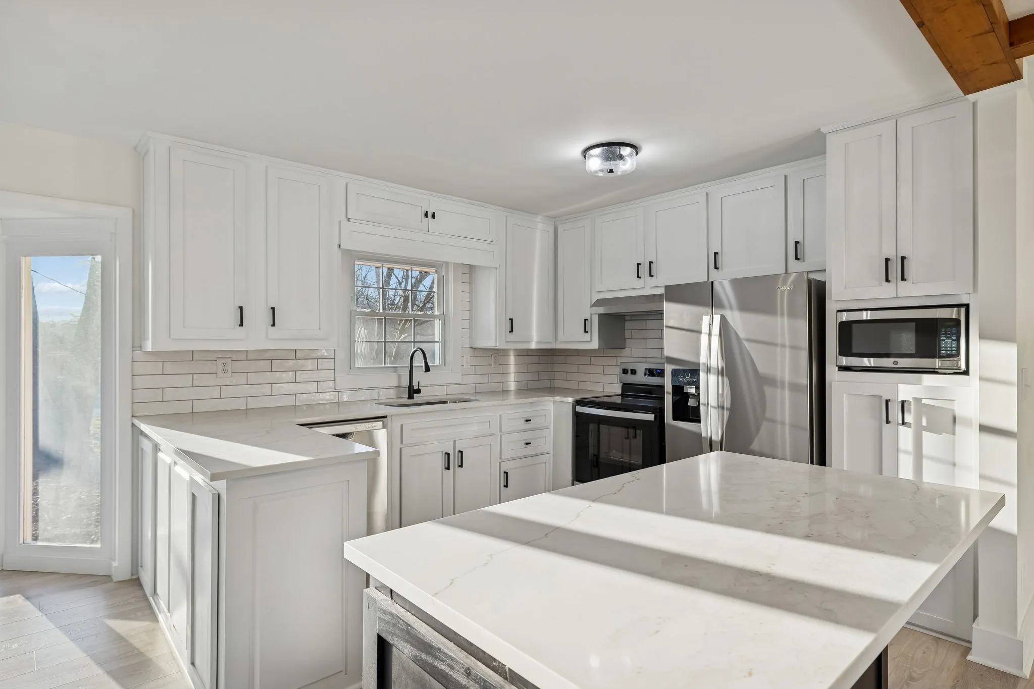Step inside to an open-concept living area featuring high ceilings, exposed wood beams, new flooring, recessed lighting, and a cozy fireplace that anchors the space. The fully remodeled kitchen shines with custom white cabinetry, quartz countertops, subway tile backsplash, stainless steel appliances, and modern black hardware—perfect for everyday living and entertaining.