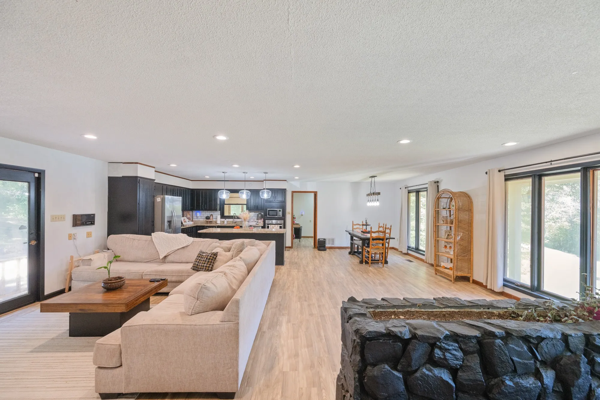 Welcome to this stunning and spacious 4-bedroom, 3-bath home offering 2,702 sq ft m/l of beautifully updated living space, nestled on 2.4 acres m/l of peaceful land with a large front yard and a quiet, private backyard. Step inside to an open-concept floor plan that seamlessly connects the kitchen, dining, and living areas—perfect for everyday living and entertaining. This home features brand-new flooring throughout and heated bathrooms for added comfort and luxury. The inviting sunroom is ideal for quiet reading, relaxing mornings, or gathering with friends to watch the big game. The finished basement offers a spacious recreation room, one bedroom, one full bath, and garage access, providing flexible space for guests, a home office, or additional living areas. Recent updates include a new roof, new flooring throughout, and all new appliances, which convey with the home. Offering the perfect blend of privacy, space, and modern comfort, this move-in-ready property is one you don’t want to miss. Schedule your private showing today and experience all this beautiful home has to offer!