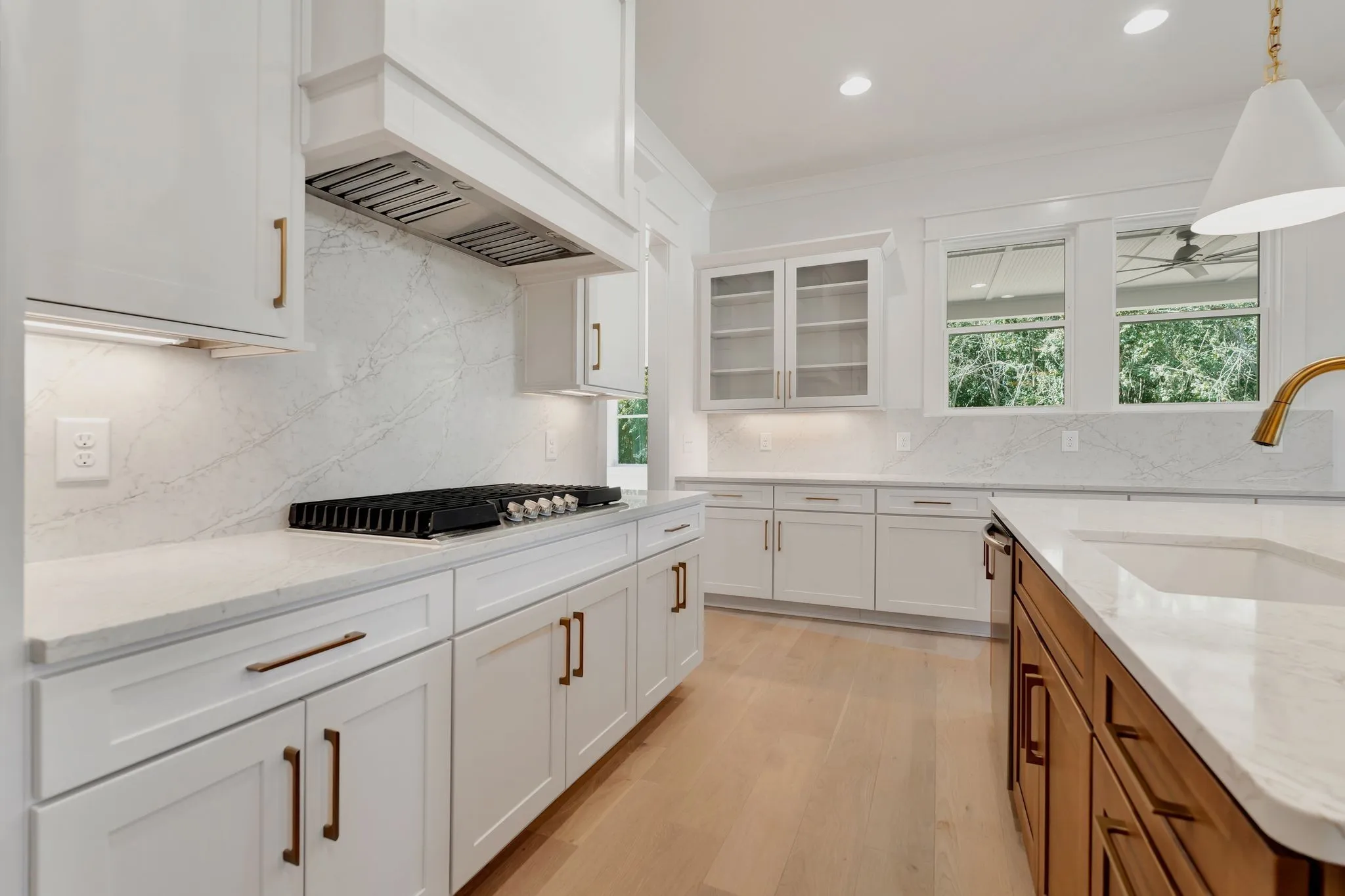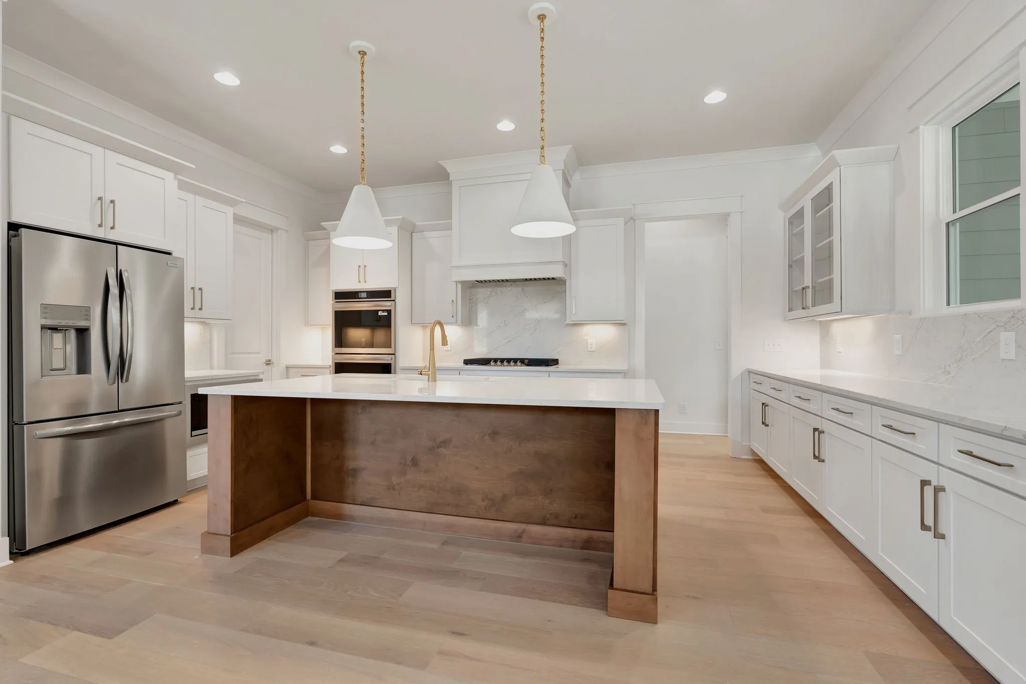 The interior showcases beautiful wood flooring throughout the main level, quartz countertops, and a chef’s kitchen complete with a 10-foot island, gas cooktop, double ovens, and refrigerator. The great room impresses with built-in bookshelves flanking a cozy gas fireplace, while the primary suite offers a spa-like bathroom with a separate tub and shower and a generous walk-in closet.