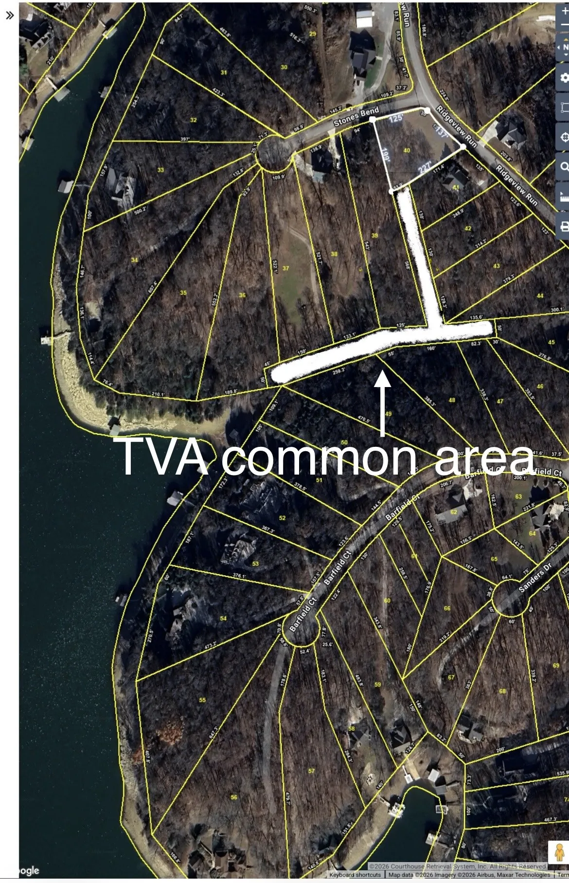 Great corner lot with lake views in the Ridgeville subdivision that has lake access to Tims Ford Lake. This lot connects to a TVA common area that is owned by TVA and allows property owners that touch that common area access to Tims Ford Lake (highlighted in the photos). This allows these home owners to fish, swim , etc and have an access road down to the TVA common area shoreline. This property and this particular TVA common area is not dock permit-able. No trailers or long term RV’s are allowed in the Ridgeville subdivision. The perfect lot to build your lake getaway or a full time residence